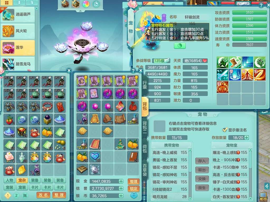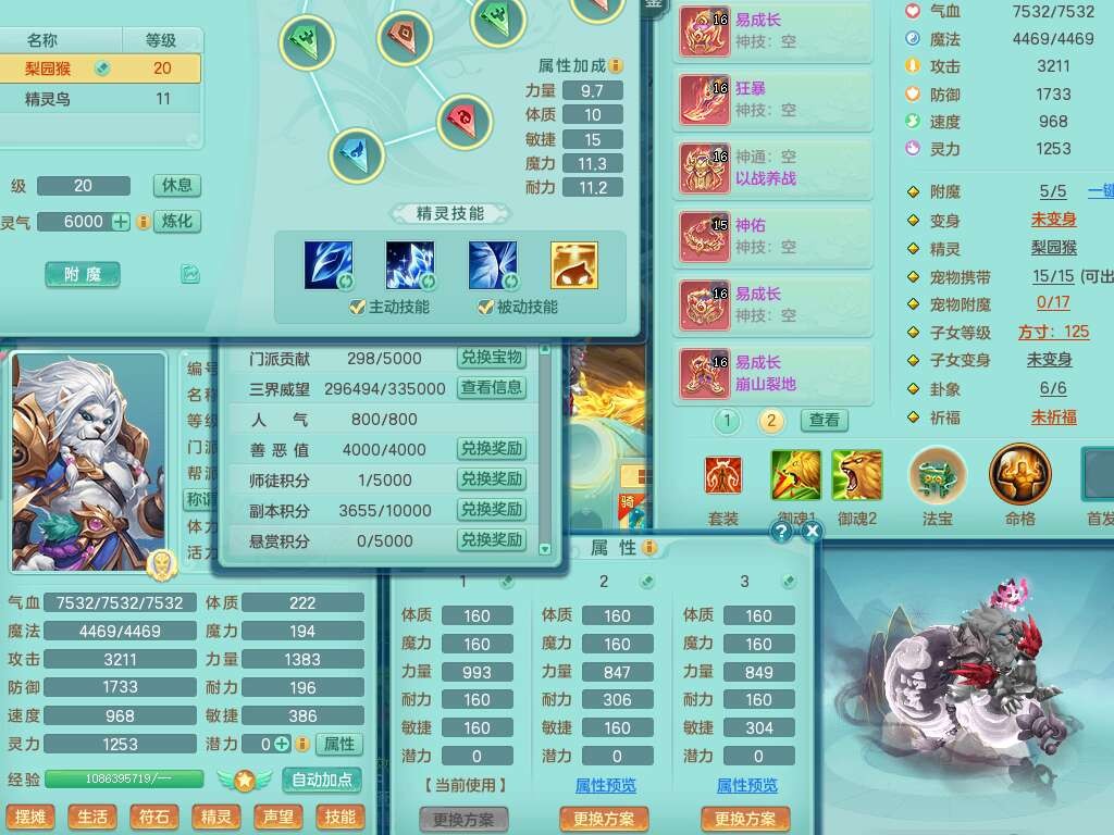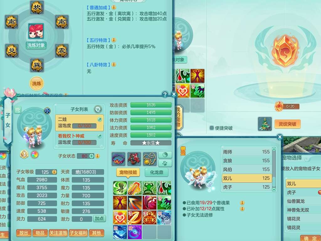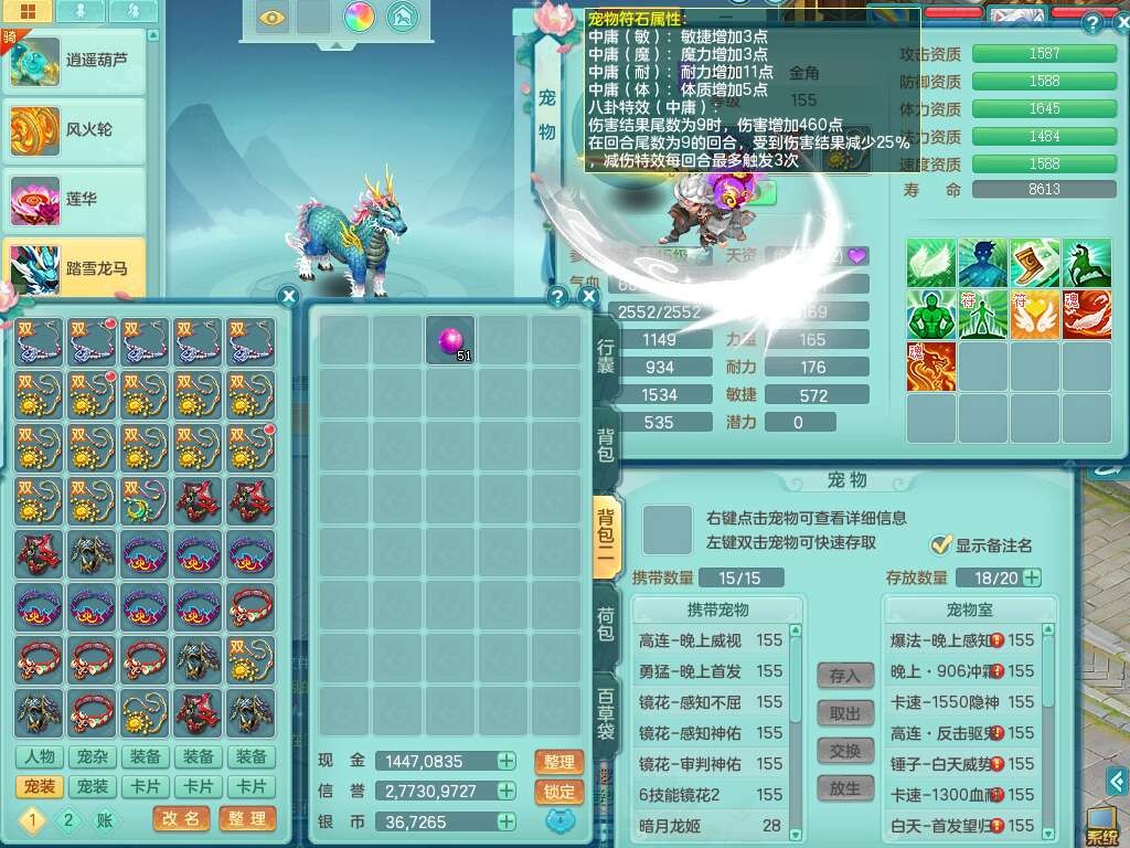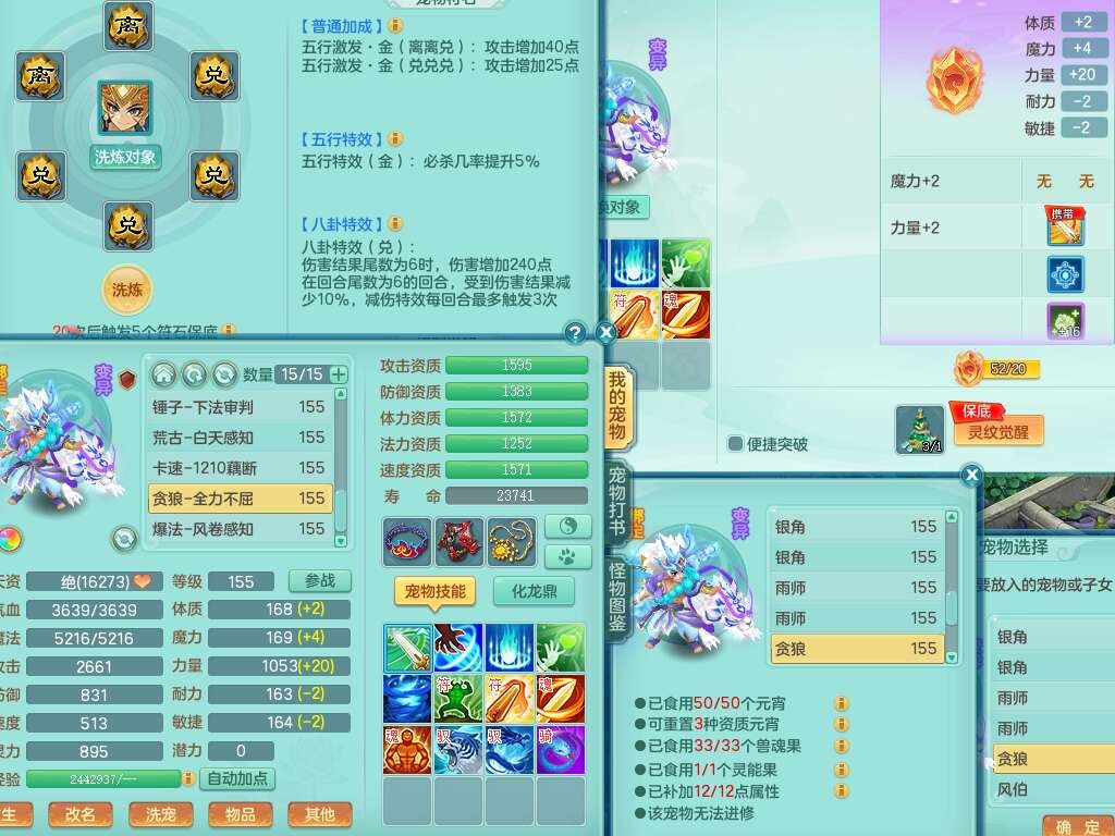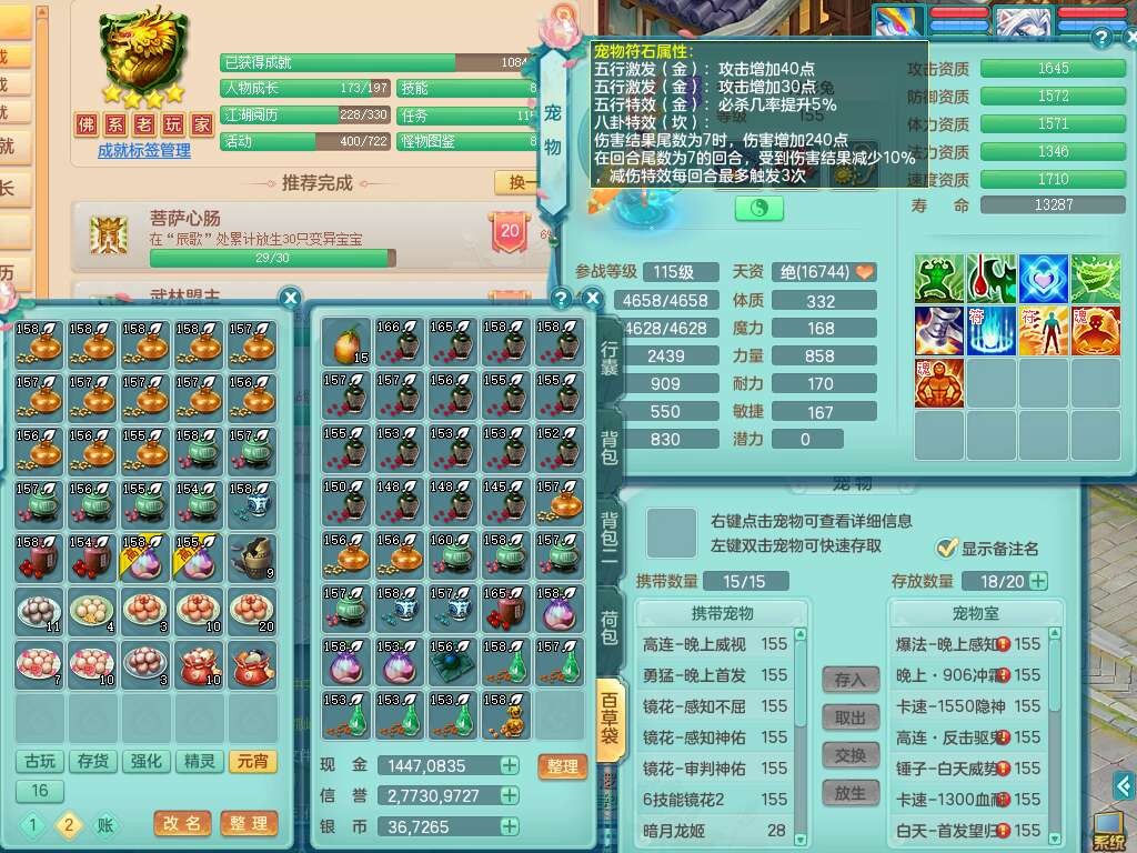 J22294醉生梦死159男万兽,精灵歌,1龙1内胆神,6觉醒,6宠皮,7特殊(夺命,流星,月光,清霜,锤子,荒古,藕断),5只六技能镜花灵,1只六技能龙姬,易成长单加53头,919狂暴单加武器,神佑单加链子,易成长单加50腰带,易成长崩山鞋子,5.0基础鼎,1个纯六字,1个五字,10只满果子,宠排在榜,双人坐骑。
