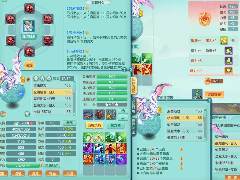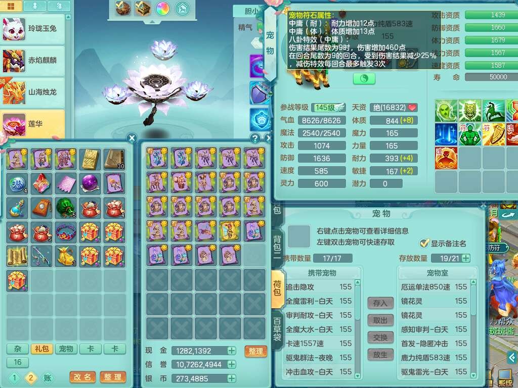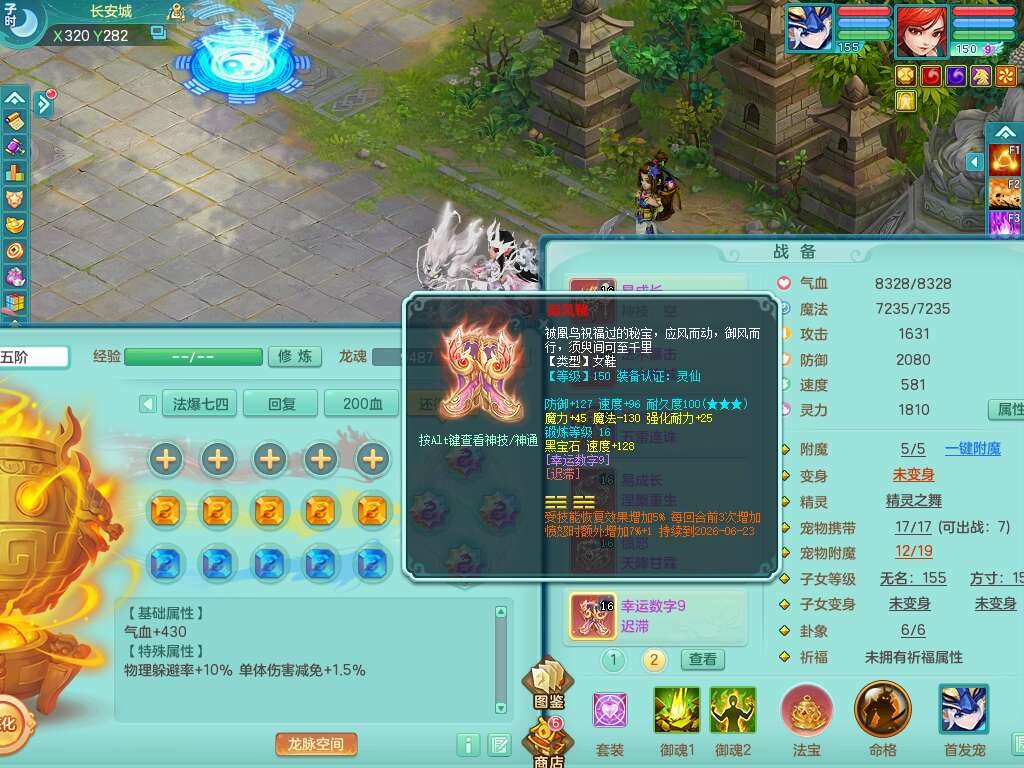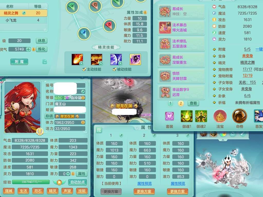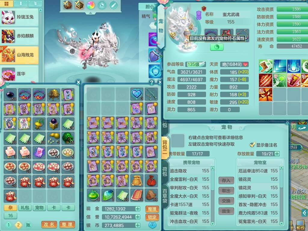 S22289风华绝代159女魔王,精灵舞,12龙4内胆神,1破镜,【16只觉醒,已潜龙】,4位靓号不含4,2宠皮,4特殊(夺命,祈雨,藕断,烈焰),2只六技能镜花灵,1只六技能龙姬,法爆烽火武器,法缭五雷衣服,269易成长慈航项链,愤怒四海单加腰带,法系星辰之拥,5.5基础鼎+70攻+280血,物理躲避10%,法爆8.7%,15个永久格子,24个纯六字,1个五字,27只满果子,宠排在榜,永久称谓,4个坐骑,带273万神武币。带157男方寸奶粉,精灵舞。
