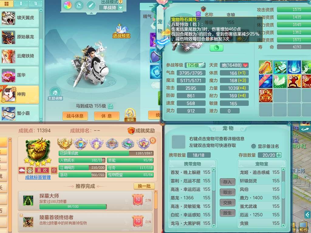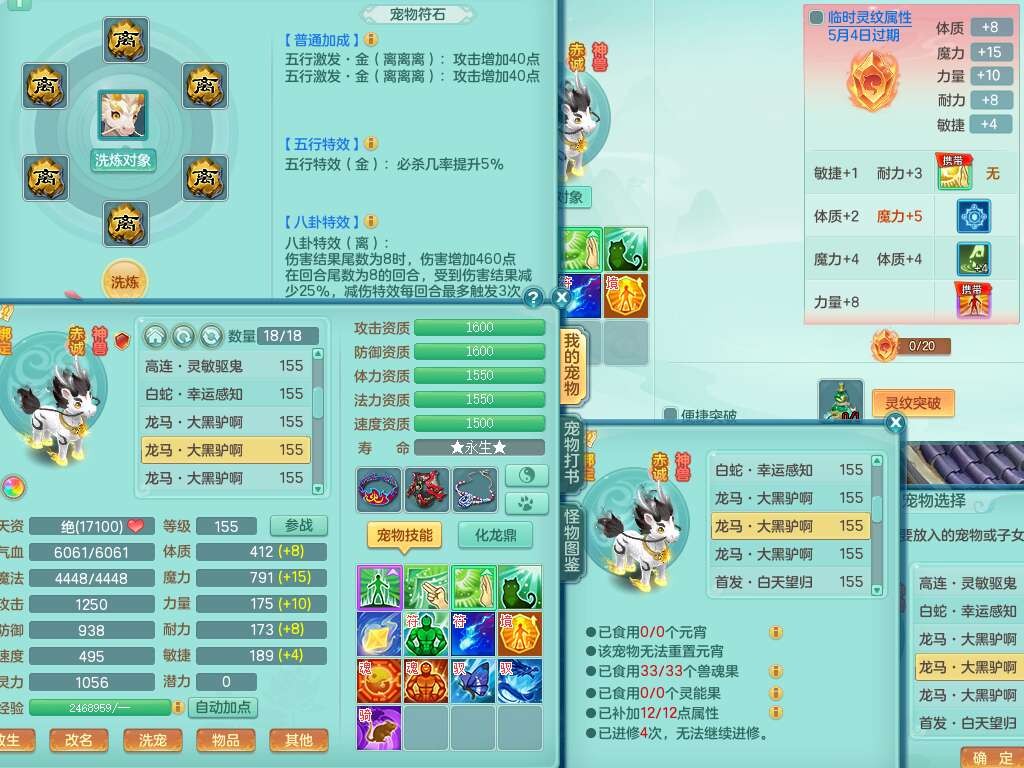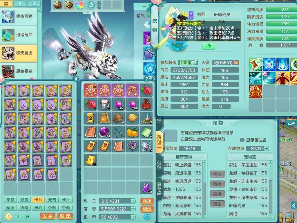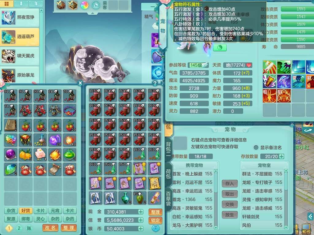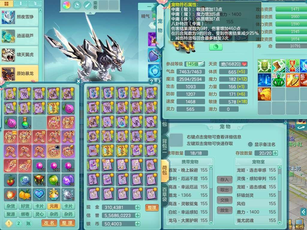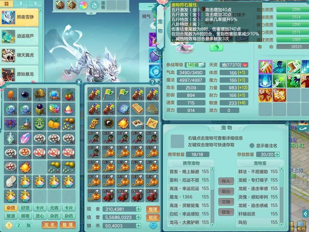 A22288壮志凌云159男方寸,精灵歌,6龙(1龙没内),1龙皮,3内胆神(2马1蛇),1神兽龙马+48神兽内胆碎片,5破镜,【22只觉醒,已潜龙】,4位靓号ABBA,10宠皮,1特殊(灵傀),5只六技能镜花灵,2只六技能龙姬,法爆回气术单加52武器,易成长四灵决单加57衣服,270易成长单加52项链,愤怒归气诀单加54腰带,五雷单加55头,法缭单加56鞋子,可双法缭,背包有法缭单加衣服,强化防御五雷单加55衣服,易成长四海单加54衣服,物理双破甲,破甲晶清单加50鞋子,918易成长单加55武器,930必杀武器,930必杀四海武器,崩山单加衣服,坚毅单加51项链,神佑单加50项链,易成长破血单加55头,幸运6崩山单加52鞋子,物法辅都可玩,两套潜龙符石,装备爆炸,6.0基础鼎+70攻+280血,8.7法爆,15个永久格子,19个纯六字,30只+满果子,仓库还有95个果子,宠排在榜,经验修炼在榜,永久称谓,7个坐骑,暴龙泰坦+神驹心想事成+马到成功+马上发财+红红火火+西瓜冰武器皮肤+火焰之力武器皮肤,超多库存,冰晶庭院,带142天月卡,6800金币。