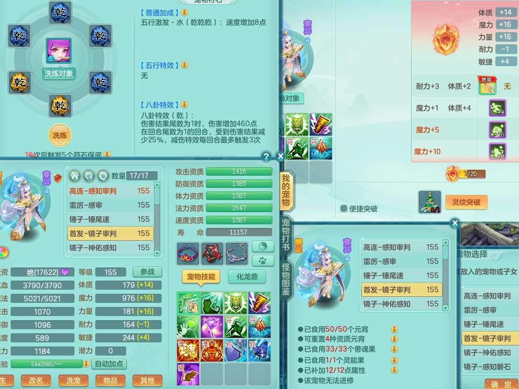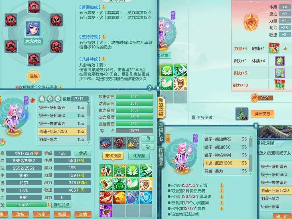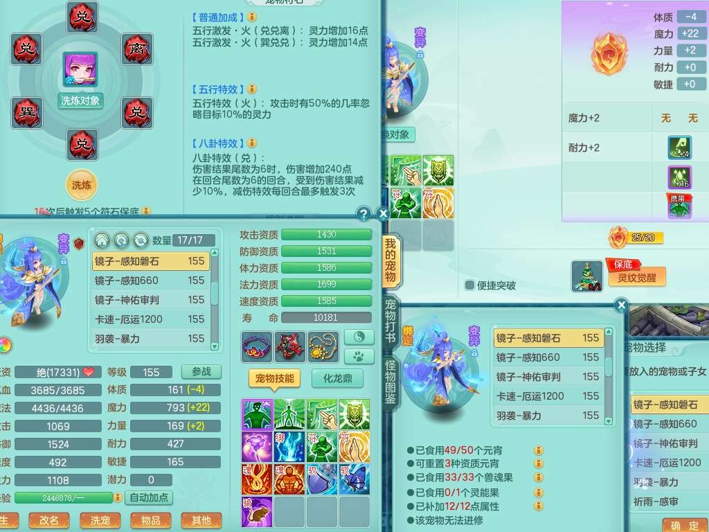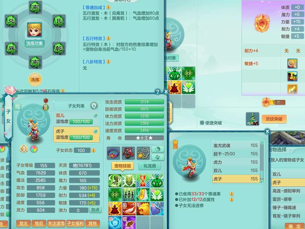 A22285风驰电掣159男盘丝,精灵舞,2龙1内胆神,1神兽+56个神兽内丹碎片,【9觉醒,已潜龙】,4位靓号,6宠皮,3特殊(羽袭,祈雨,号角),5只六技能镜花灵,1只六技能龙姬,双红封印精通群体安神头,双红奇珍四海单加50武器,三红愤怒易成长笑里单加腰带,迅捷群体守护单加鞋子,六特,法系装备有法暴单加53武器,265易成长单加51链子,法缭衣服,物理装备有,921易成长单加54武器,崩山衣服,易成长单价57头,神佑神佑坚毅项链都有,5.0基础鼎+70攻+280血,15个永久格子,7个纯六字,23只满果子,宠排在榜,经验在榜,双人坐骑,冰晶庭院,有70天月卡。