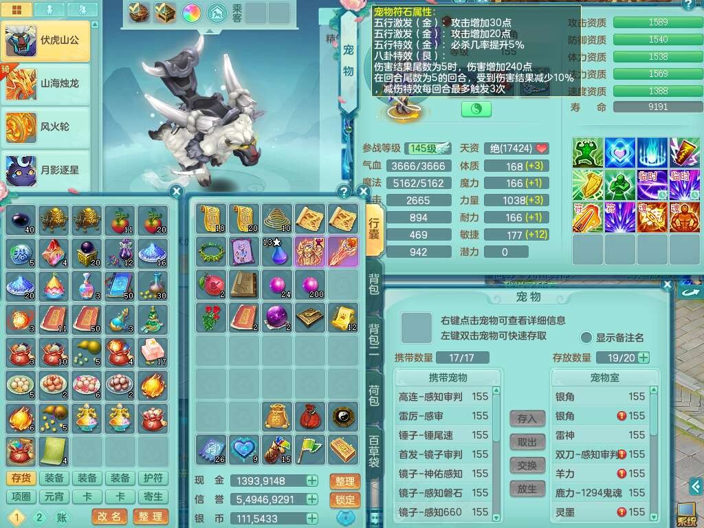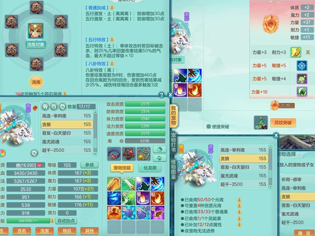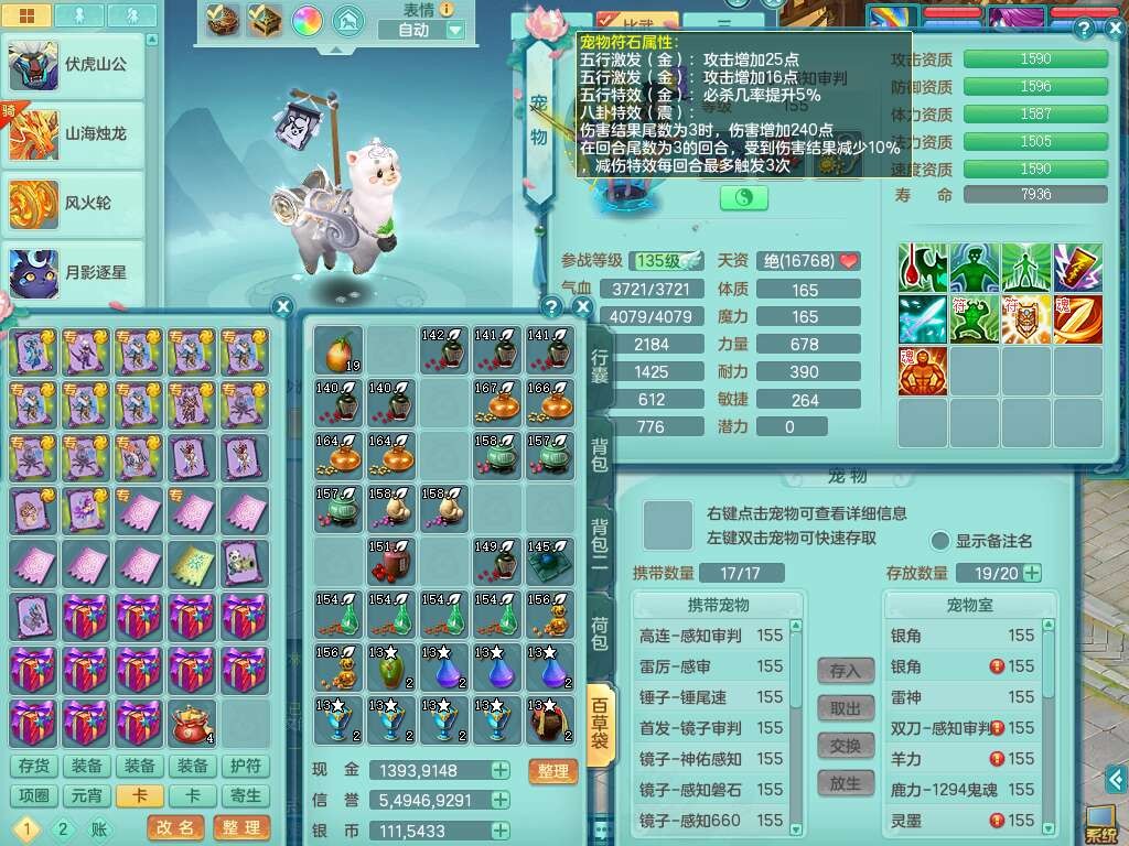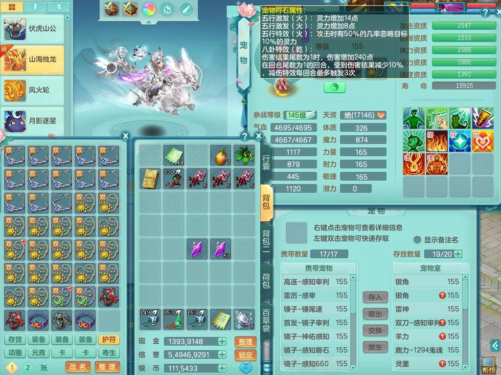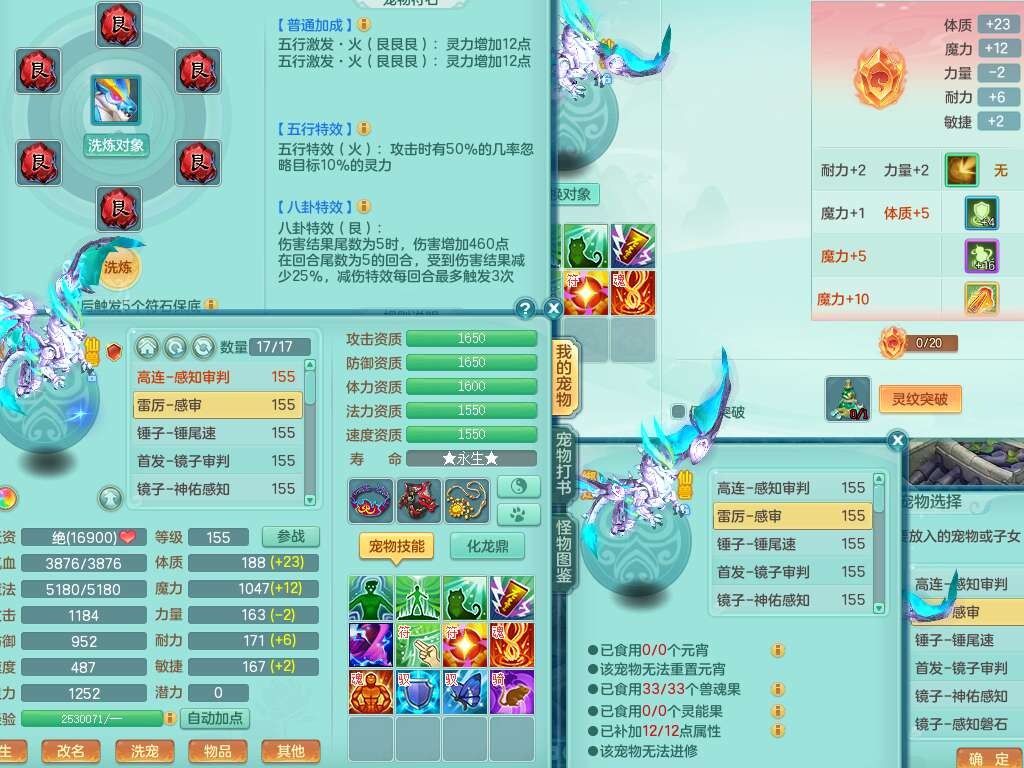 A22285风驰电掣159男盘丝,精灵舞,2龙1内胆神,1神兽+56个神兽内丹碎片,【9觉醒,已潜龙】,4位靓号,6宠皮,3特殊(羽袭,祈雨,号角),5只六技能镜花灵,1只六技能龙姬,双红封印精通群体安神头,双红奇珍四海单加50武器,三红愤怒易成长笑里单加腰带,迅捷群体守护单加鞋子,六特,法系装备有法暴单加53武器,265易成长单加51链子,法缭衣服,物理装备有,921易成长单加54武器,崩山衣服,易成长单价57头,神佑神佑坚毅项链都有,5.0基础鼎+70攻+280血,15个永久格子,7个纯六字,23只满果子,宠排在榜,经验在榜,双人坐骑,冰晶庭院,有70天月卡。