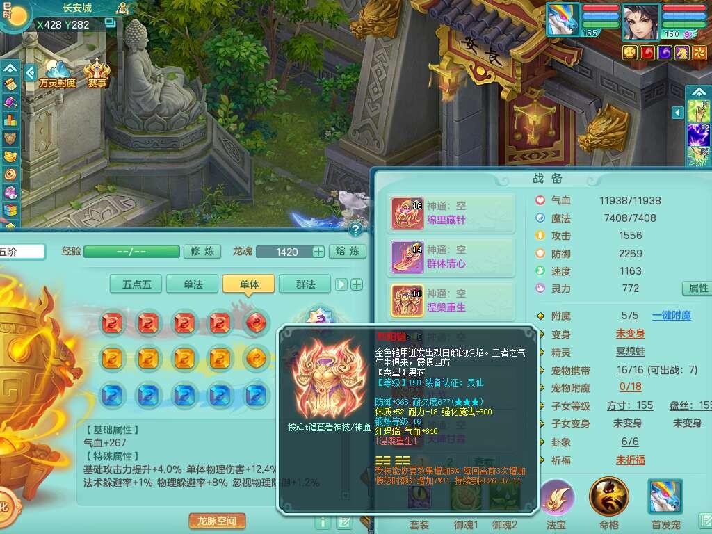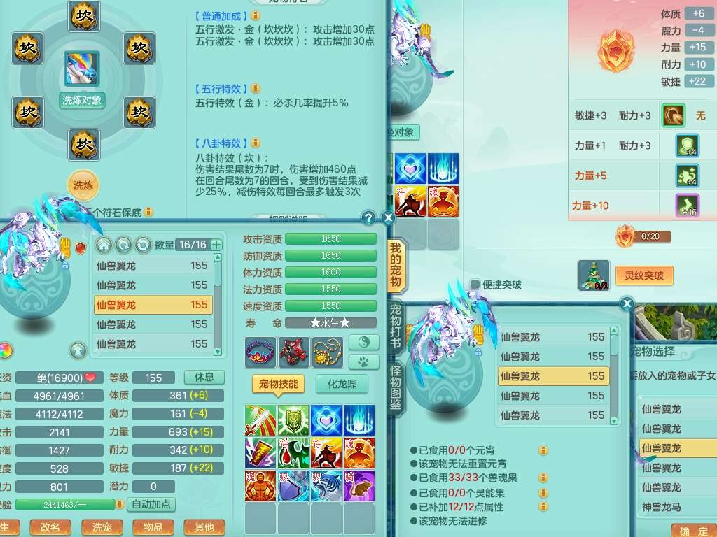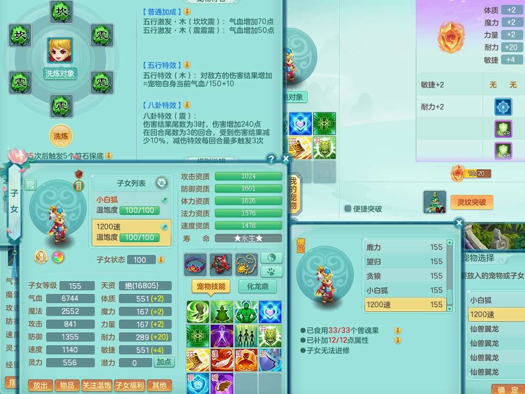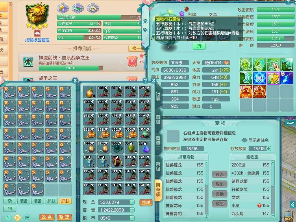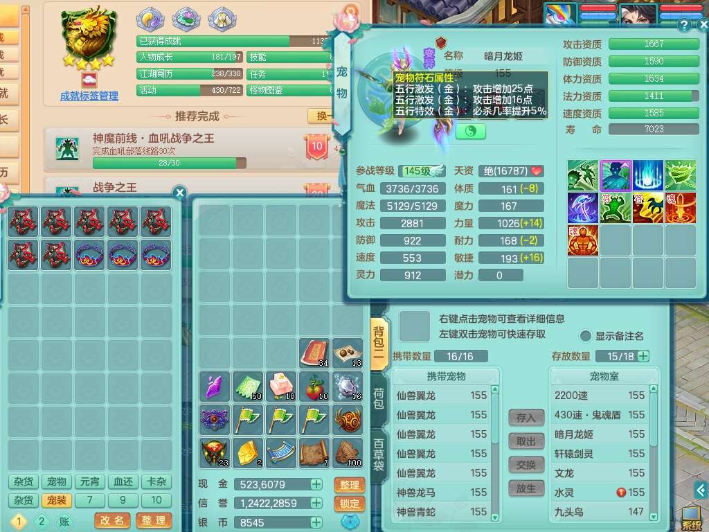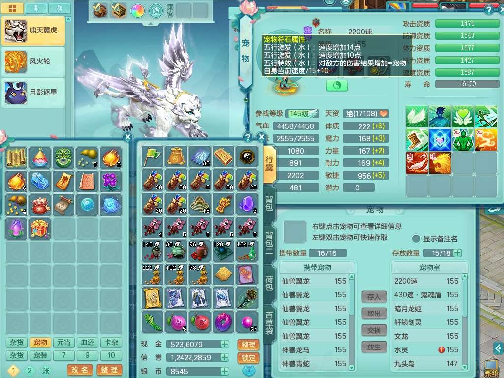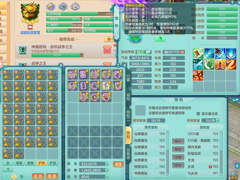 a22280少年游159男普陀,精灵舞,5龙1龙皮(1龙没内),2内胆神,1破镜,12只觉醒(准潜龙,宝宝满足,符石差3个主要,1个87魔法,化龙鼎差1个厚土龙纹),4位靓号不含4,2宠皮,2特殊(翻江,月光),3只六技能镜花灵,愤怒止戈单加腰带,六特,有三红匠心连击四海武器,5.5基础鼎+70攻,14个永久格子,7个纯六字,1个五字,17只满果子,宠排在榜,双人老虎,带29992金币,116天月卡。