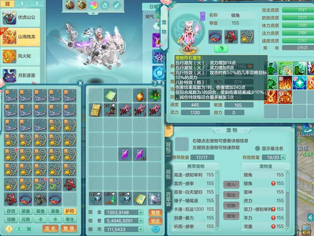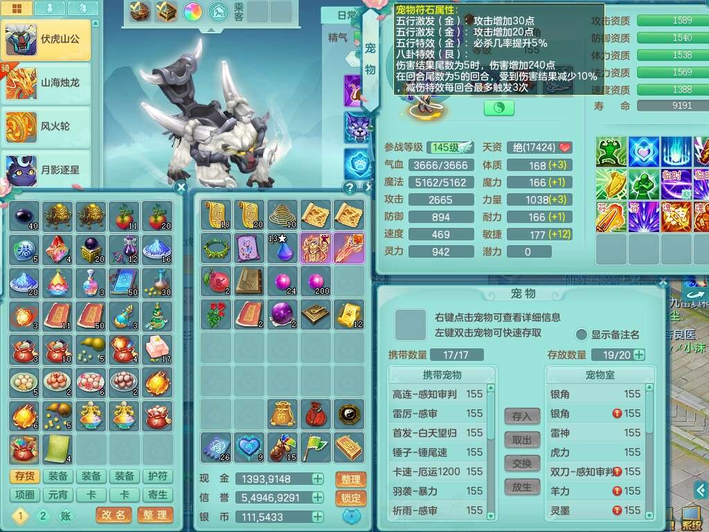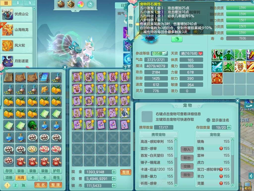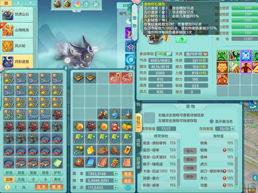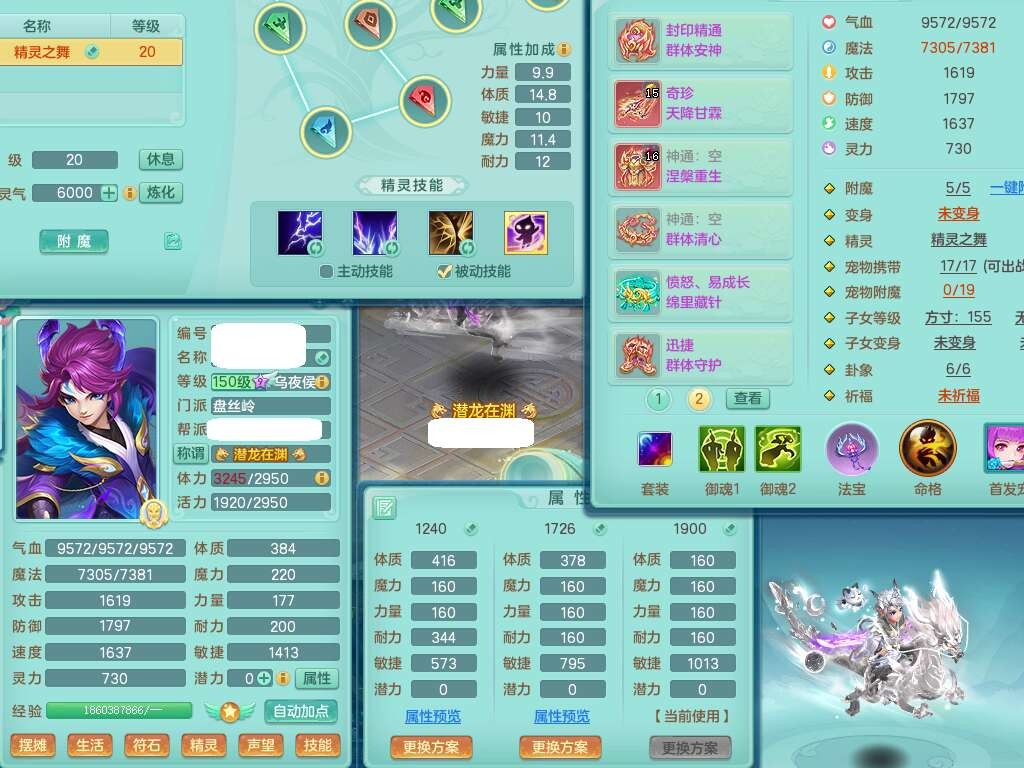 K22278风驰电掣159男盘丝,精灵舞,2龙1内胆神,【9只觉醒,已潜龙】,4位靓号,6宠皮,4特殊(羽袭,号角,祈雨,剑胆),5只六技能镜花灵,1只六技能龙姬,三红愤怒易成长笑里单加腰带,六特,仓库有921易成长单加54武器,5.0基础鼎+70攻+280血,8.7法爆,15个永久格子,7个纯六字,20只满果子,宠排在榜,经验成就在榜,背包51神兽内丹碎片,5只坐骑,冰晶庭院,带70天月卡。