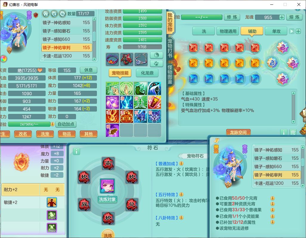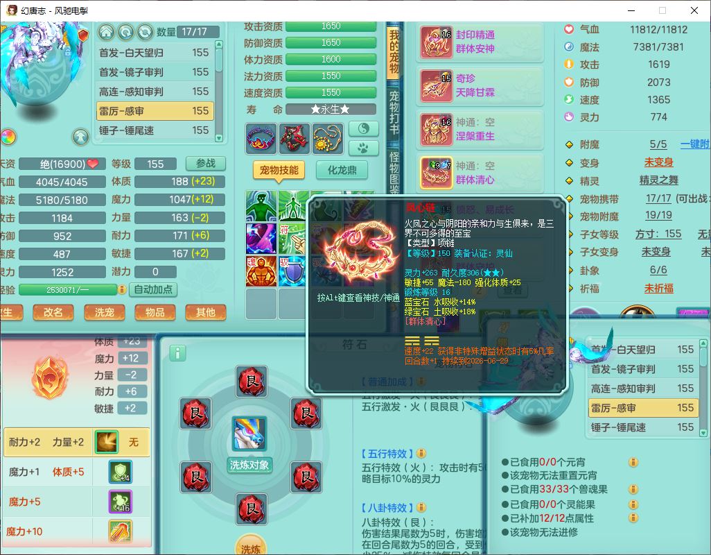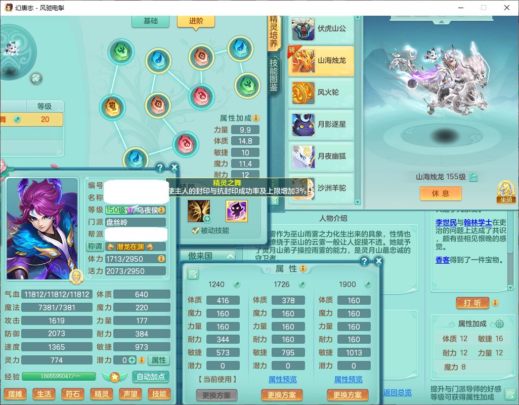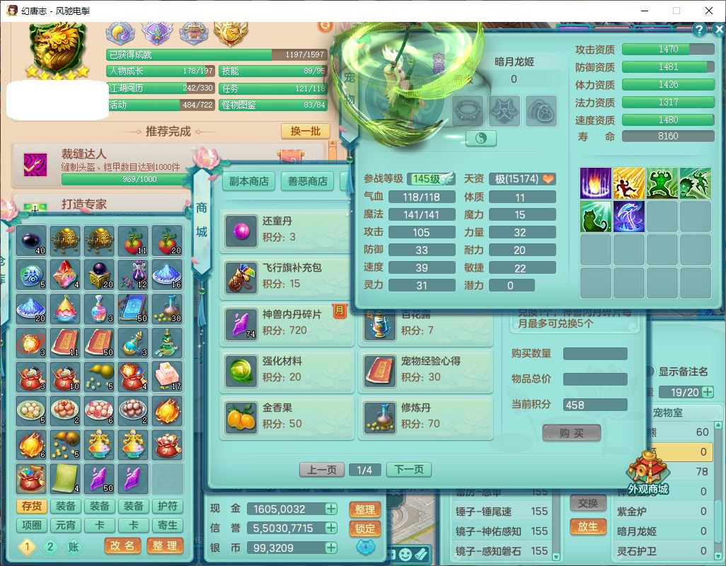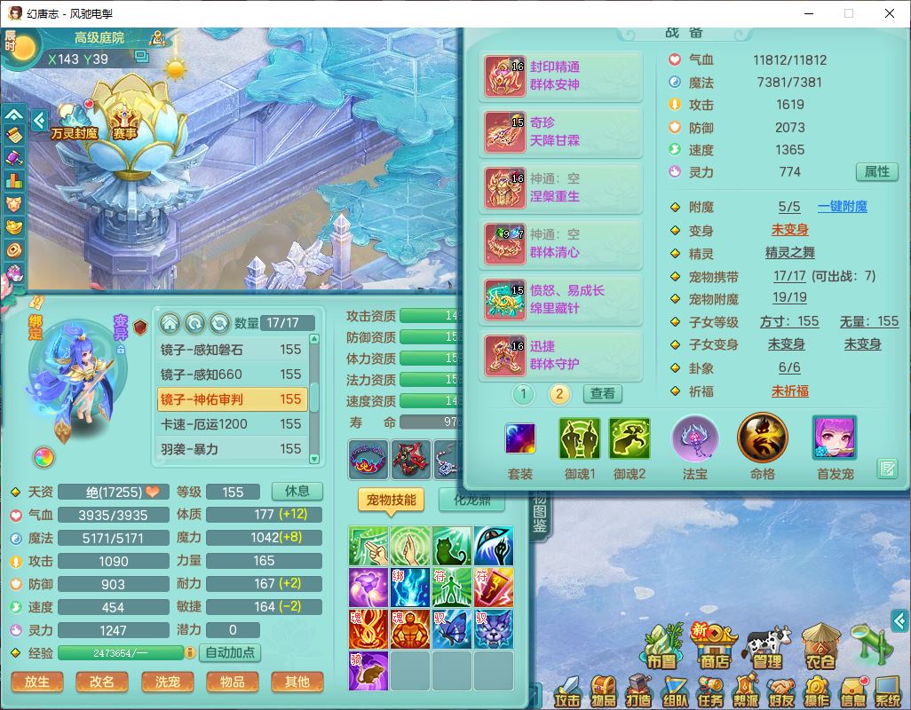 4373风驰电掣159男盘丝【潜龙号】精灵舞,4位靓号,2龙(换)1内5镜花1望归4特殊(剑胆、羽袭、战争、祈雨),9觉醒6宠皮7六字10四字23只满果子,17格子,11红星辰之拥装备,封印精通群体安神帽子,愤怒Y笑里腰带,迅捷群体守护鞋子,鼎5.0+70+280,法爆8.7,2套符石,69天月卡,冰晶庭院,永久外观、精灵皮肤,51个内丹碎片,5坐骑