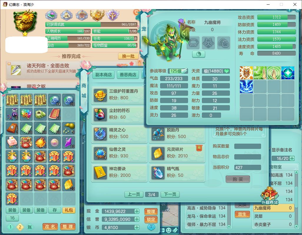 24314浪淘沙129男地府【潜龙号+暴龙逍客】精灵舞,3龙(换,无内)2内(1青蛇1龙马,1破境)1金炉1童子,13觉醒8六字4五字6四字20只满果子,10红装备,Y疾速帽子,幸运守护衣服,愤怒Y腰带,Y四海鞋子,仓库多只装备,可搭星辰之拥物理装,必杀匠心武器,破甲罗汉帽子,鼎4.0+56+224,149天月卡,庭院178房屋196,永久外观精灵皮肤,13内丹碎片,宠排在榜,2只双人坐骑,全明星冠军永久称谓