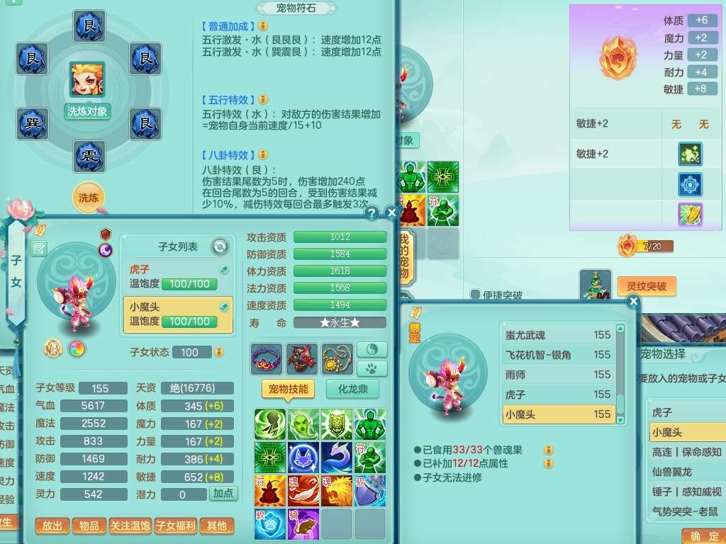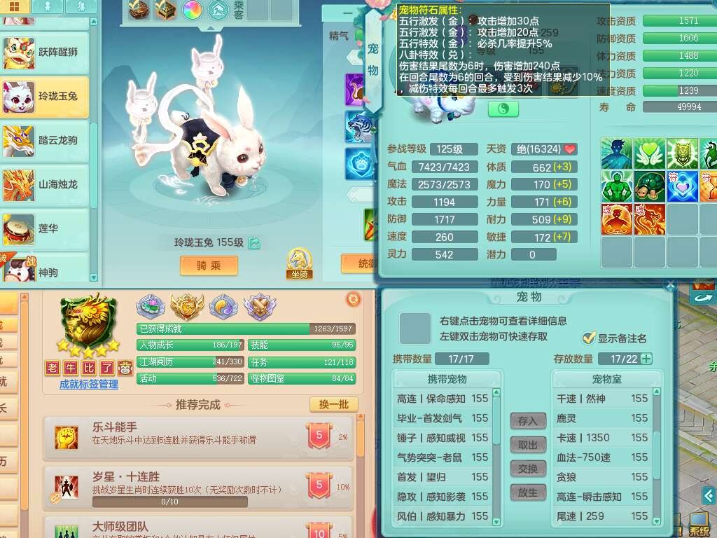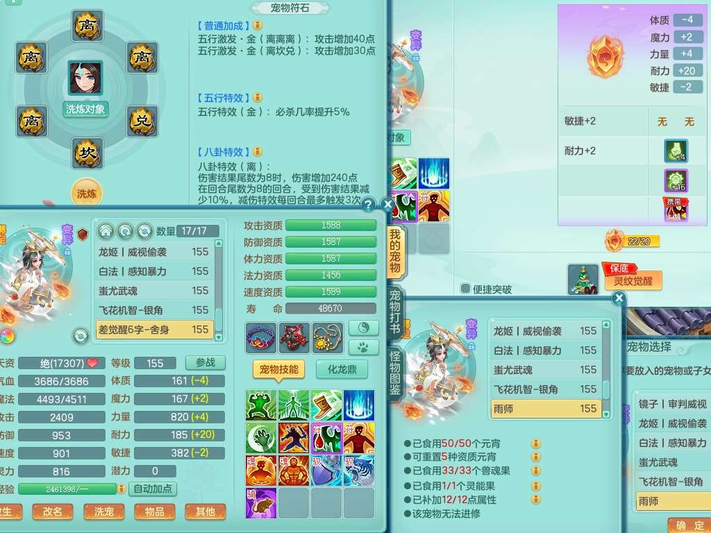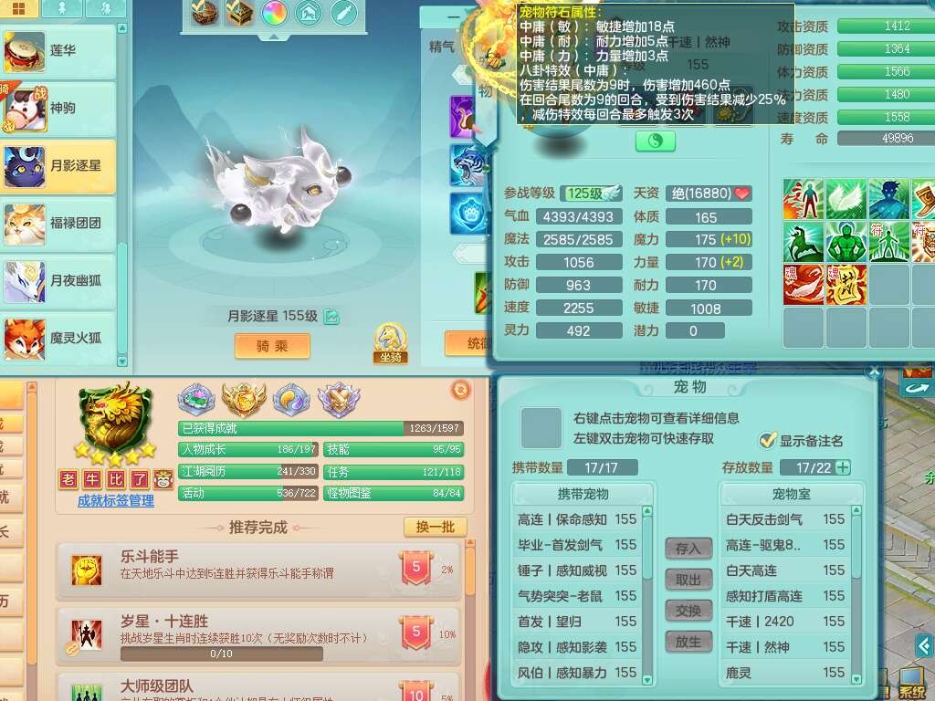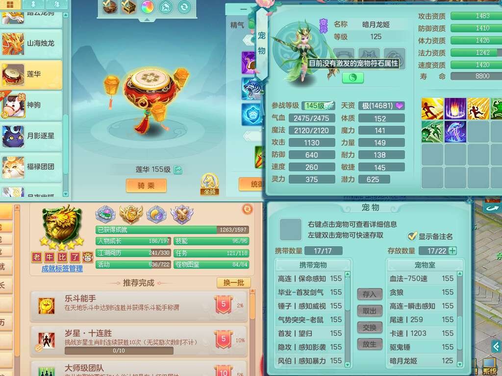 A22316普天同庆159女万兽,精灵舞,2龙2内胆神,1破镜,【11只觉醒,已潜龙】,极品8位靓号ABBBBBBB,10宠皮,5特殊(影袭×2,荒古,飞花,舍身),3只六技能镜花灵,2只六技能龙姬,易成长崩山单加50衣服,愤怒单加53项链,5.5基础鼎+70攻+280血,15个永久格子,14个纯六字,27只满果子,仓库还有122个果子,宠排在榜,经验修炼成就都在榜,永久称谓,16只坐骑,暴龙洪荒+神驹马到成功+西瓜冰,冰晶庭院,带108天月卡。