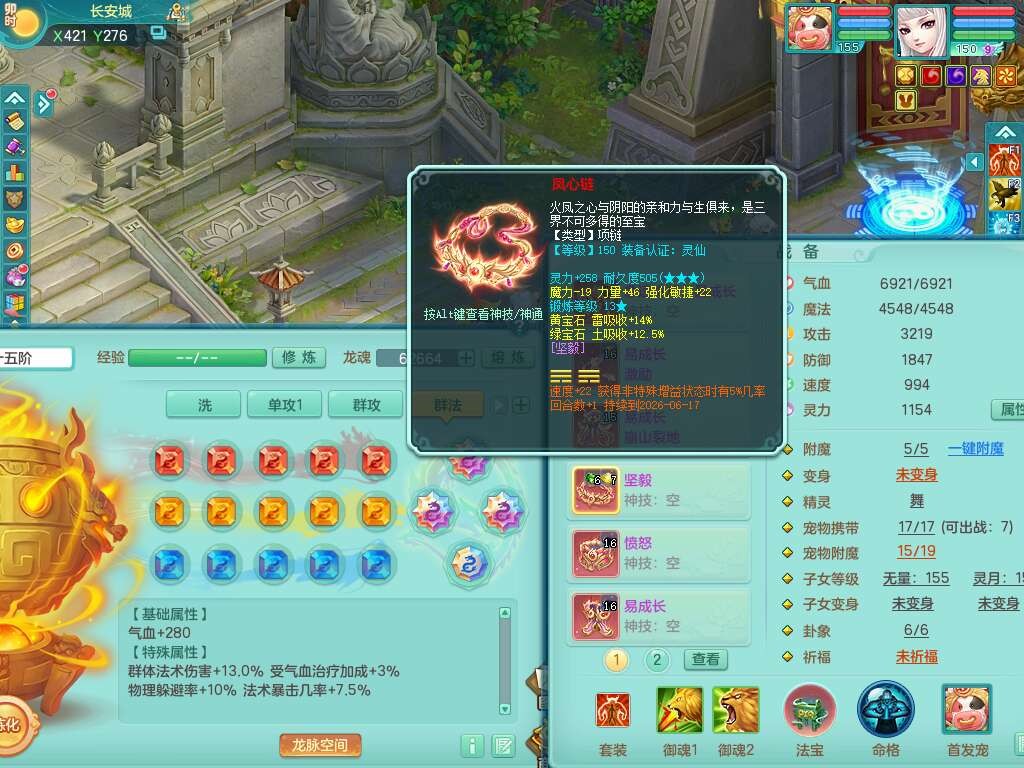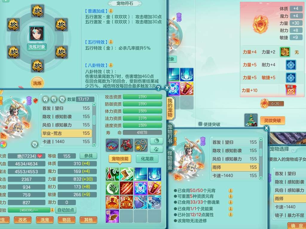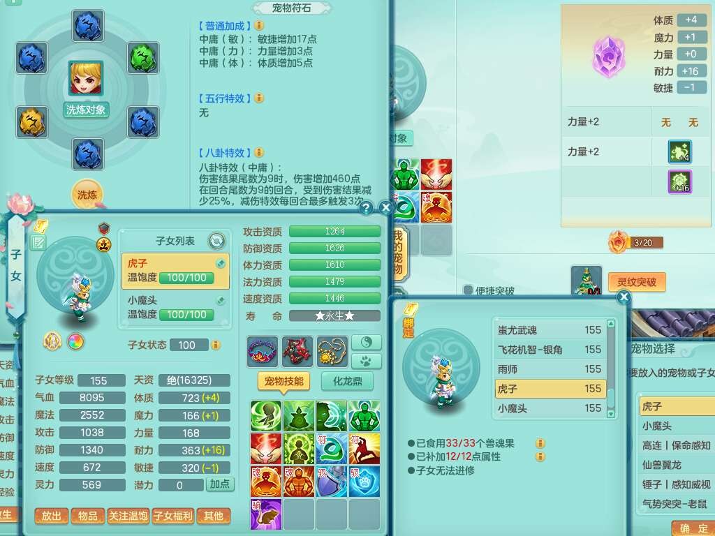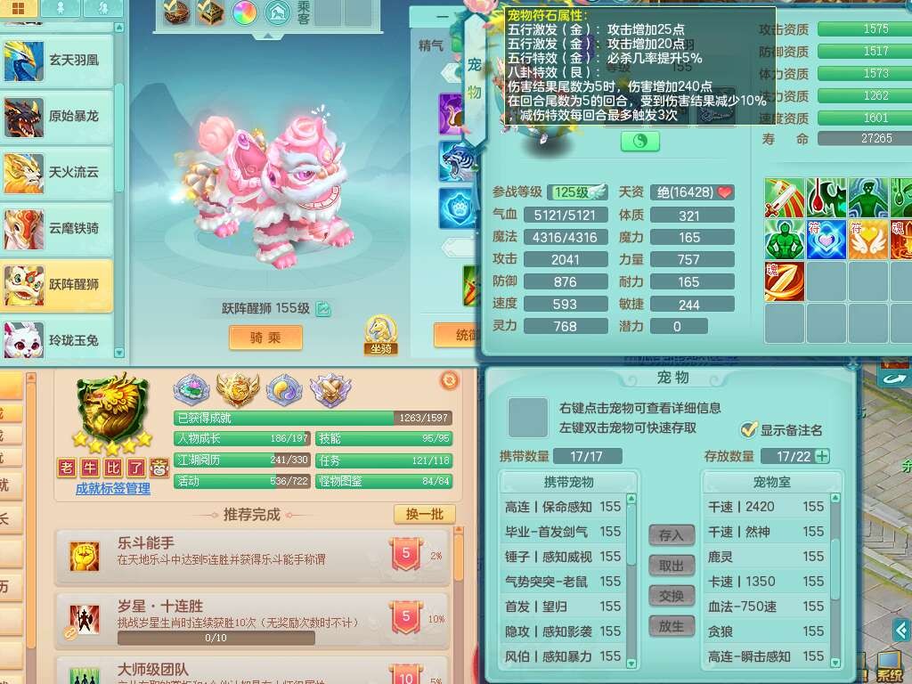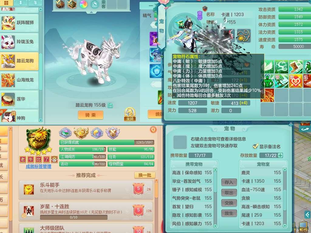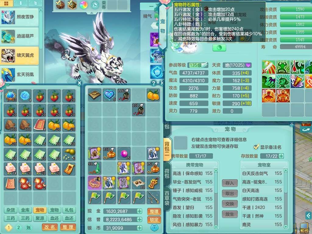 A22316普天同庆159女万兽,精灵舞,2龙2内胆神,1破镜,【11只觉醒,已潜龙】,极品8位靓号ABBBBBBB,10宠皮,5特殊(影袭×2,荒古,飞花,舍身),3只六技能镜花灵,2只六技能龙姬,易成长崩山单加50衣服,愤怒单加53项链,5.5基础鼎+70攻+280血,15个永久格子,14个纯六字,27只满果子,仓库还有122个果子,宠排在榜,经验修炼成就都在榜,永久称谓,16只坐骑,暴龙洪荒+神驹马到成功+西瓜冰,冰晶庭院,带108天月卡。