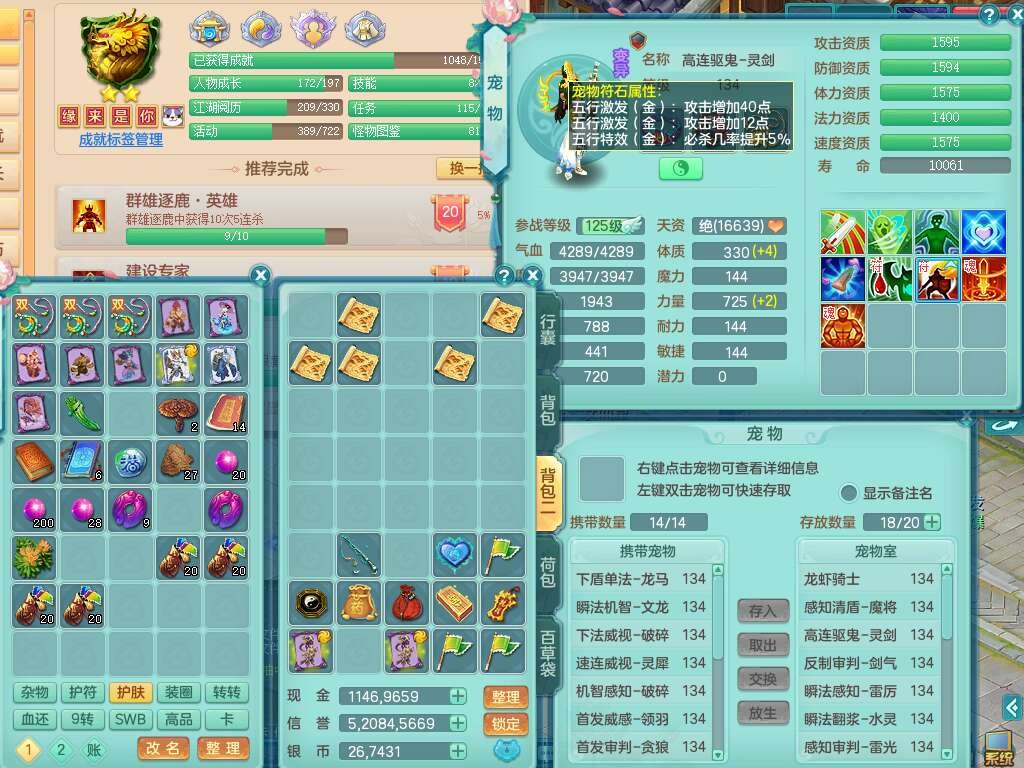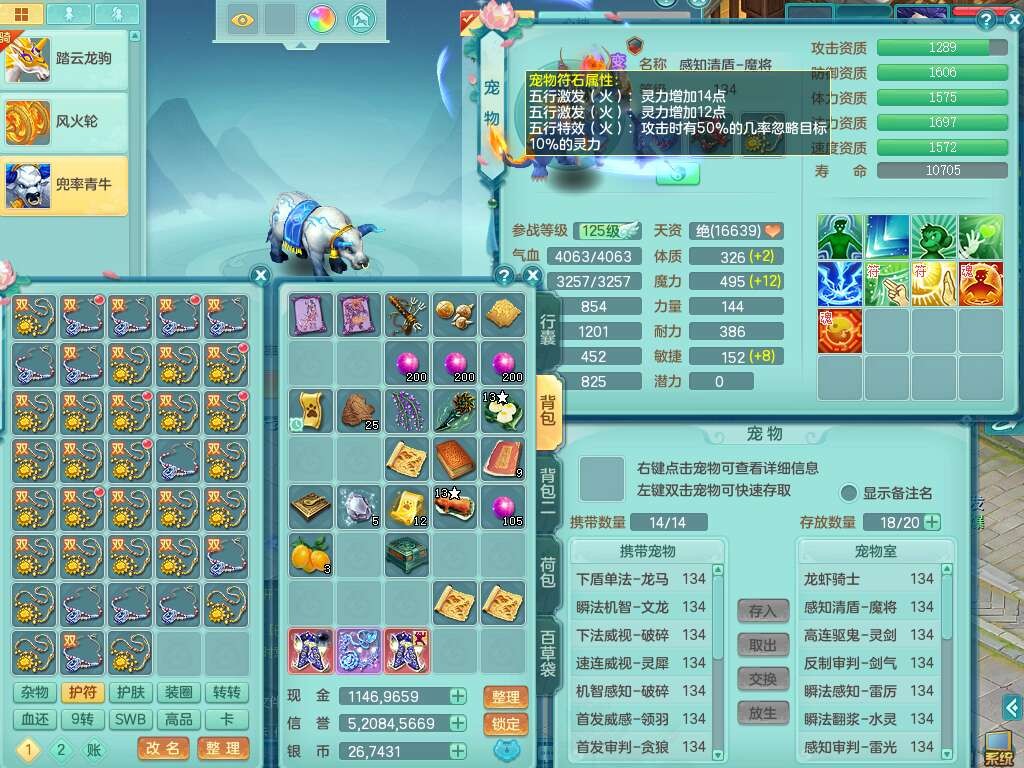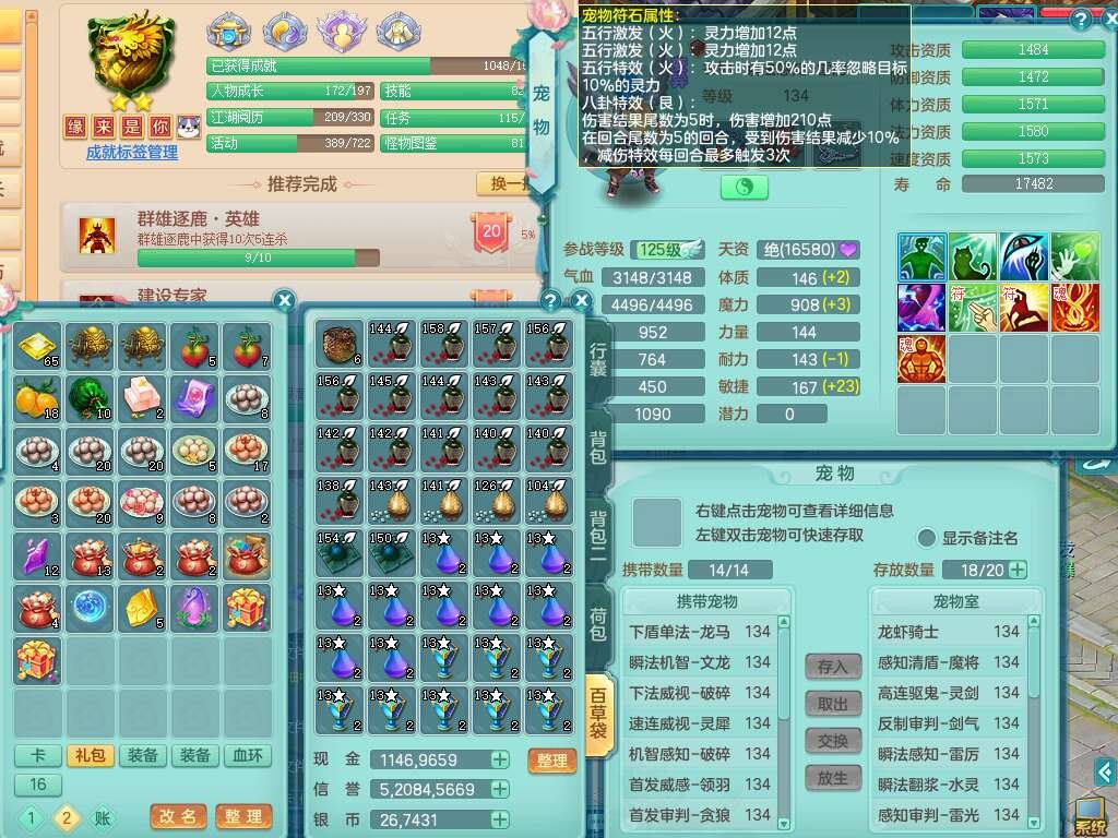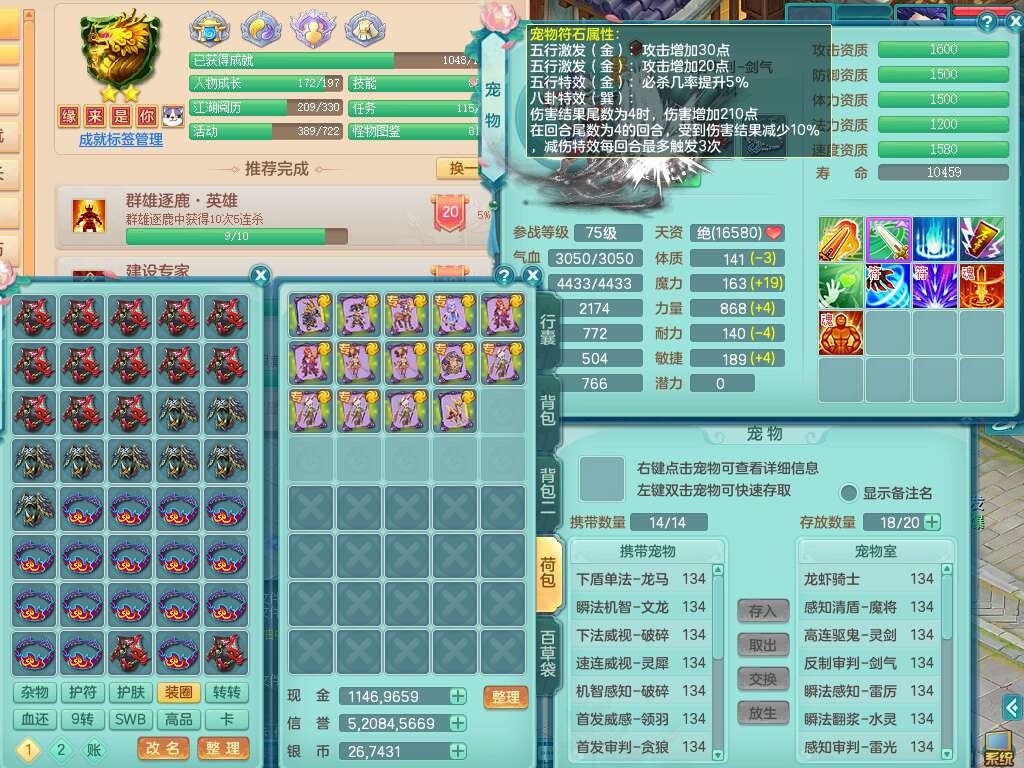 K22312浪淘沙129男五庄,精灵舞,1内胆神,10觉醒*(准潜龙,宝宝化龙鼎满足,符石只差3个主要,差1个附加属性),1宠皮,愤怒易成长腰带,易成长罗汉鞋子,五特,4.0基础鼎+56攻+224血,9个纯六字,20只满果子,宠排在榜,双人坐骑,有29个仙兽蛋,81天月卡。➕159女五庄奶粉,1神兽,3只六技能镜花灵。