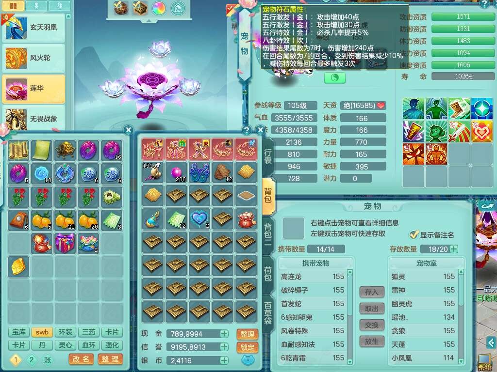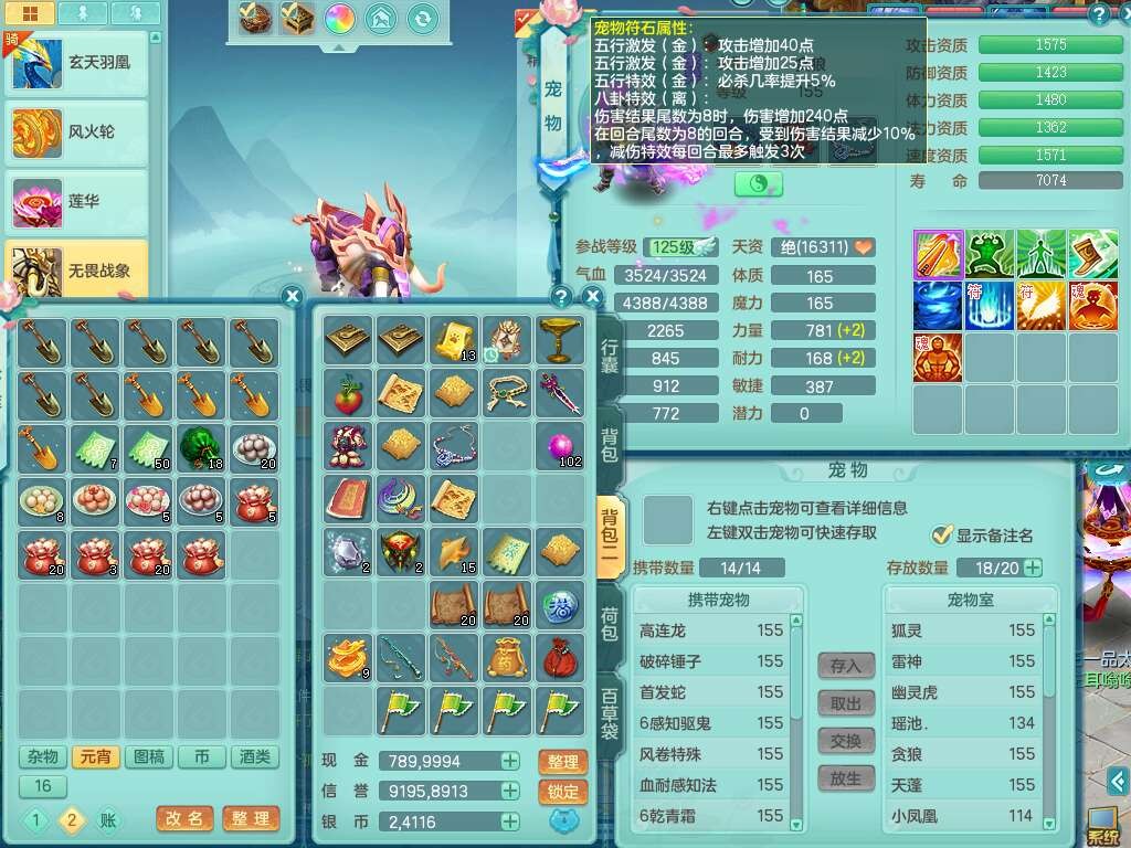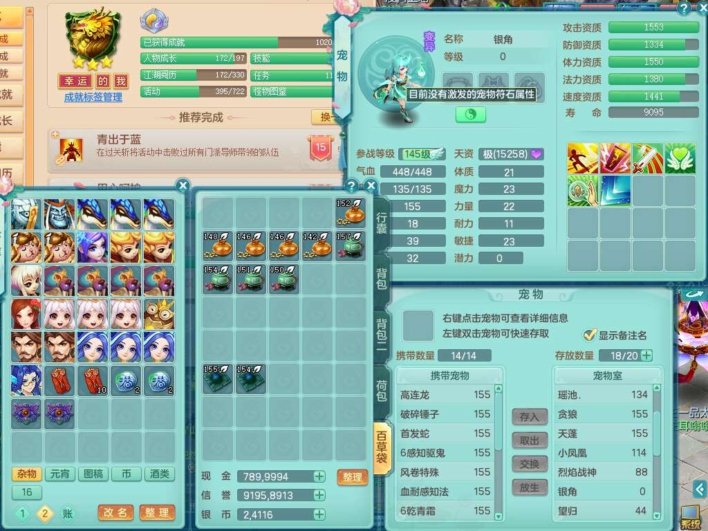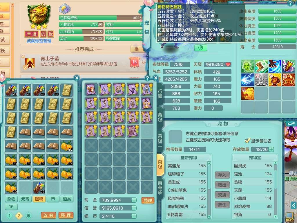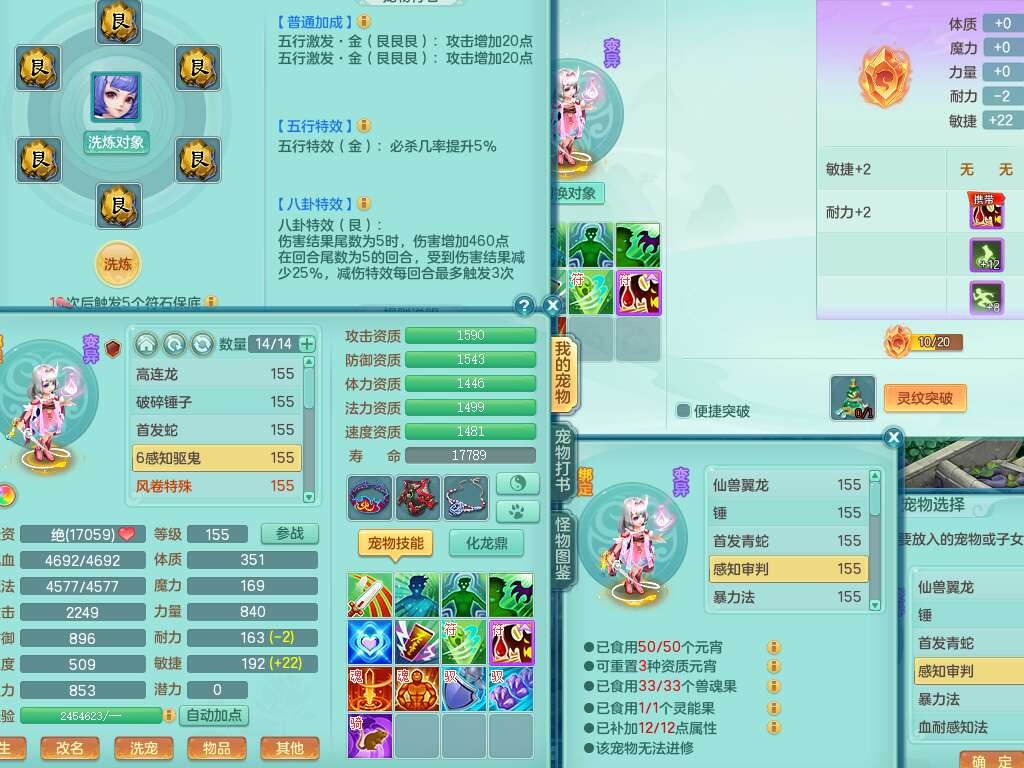a22311任剑逍遥159女普陀,精灵歌,1龙2内胆神,7觉醒,2特殊(月光, 风卷),易成长笑里单加头,愤怒野兽单加50腰带,易成长慈航单加50鞋子,4.5基础鼎,9觉醒,10只满果子,仓库还有38个果子,宠排在榜,双人坐骑,有42个仙兽蛋,25天月卡。
