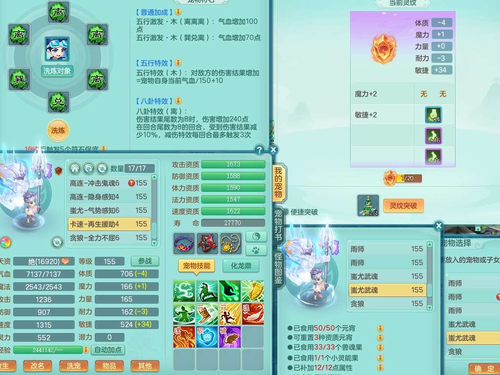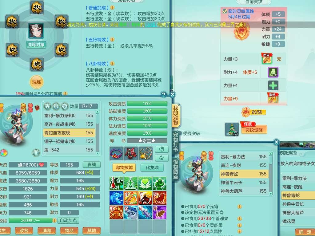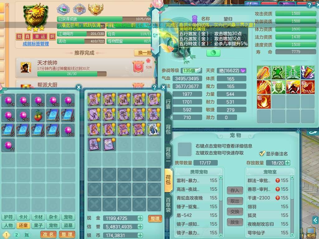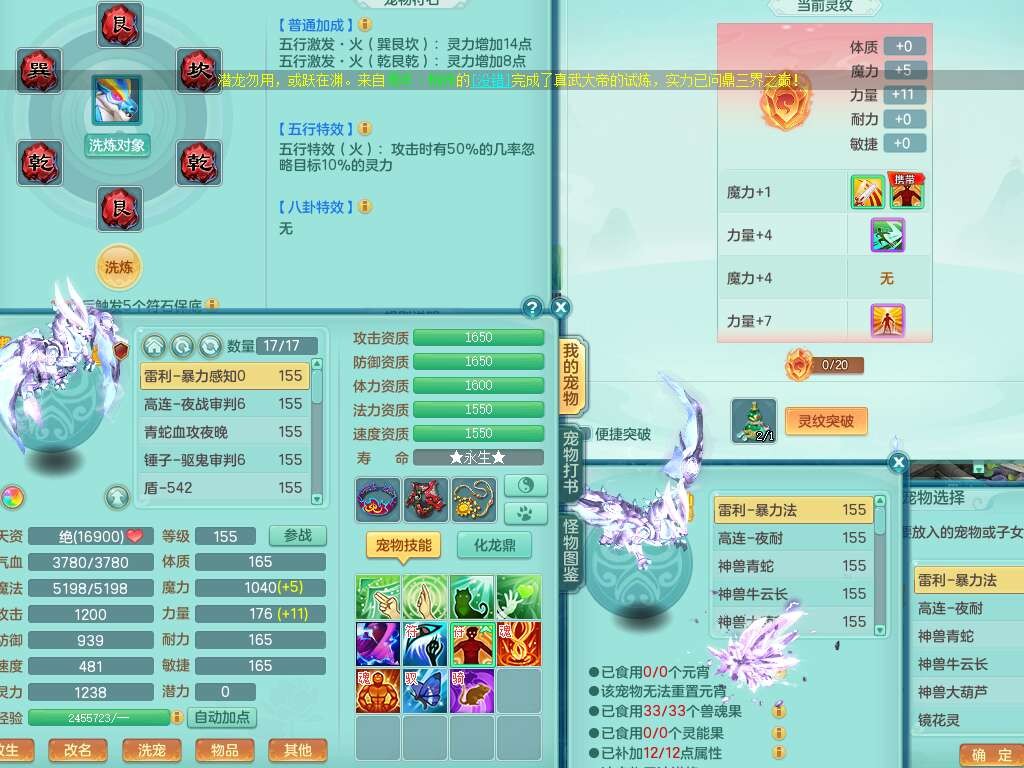 j22333今年勇159男万兽,精灵歌,2龙2内胆神(1蛇),2神兽+46个神兽内丹碎片,【7觉醒,已潜龙】,4宠皮,3特殊(锤子,上善,善恶),2只六技能镜花灵,2只六技能龙姬,易成长破血单加52头,913狂暴单加51武器,易成长单加55衣服,坚毅慈航链子,指挥易成长腰带,易成长守护鞋子,可玩愤怒六特,5.5基础鼎+70攻,280血,15个永久格子,12个纯六字,2个五字, 22只满果子,宠排在榜,经验在榜,2只双人坐骑,带174w神武币,63天月卡。带三个150奶粉。