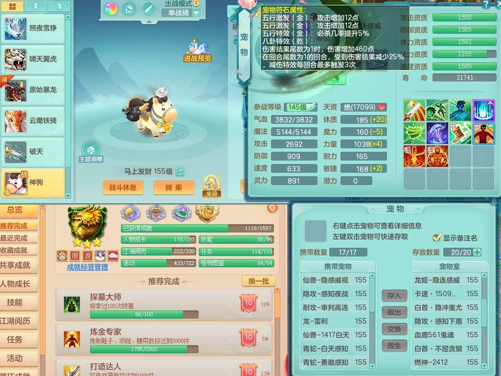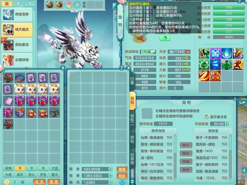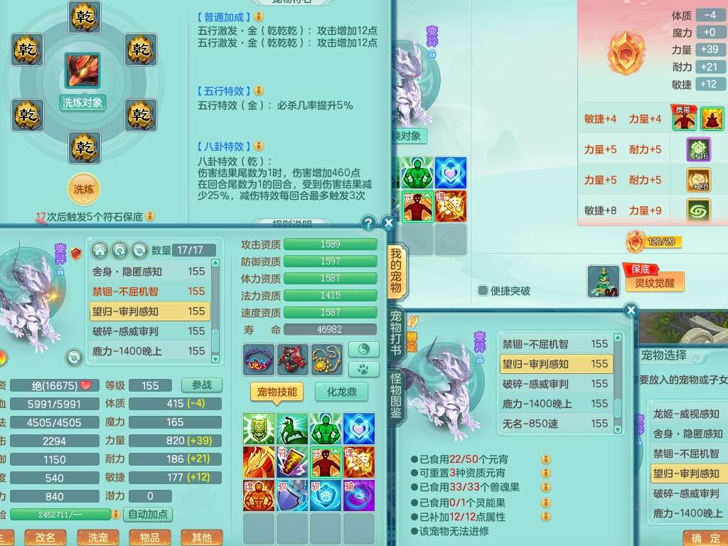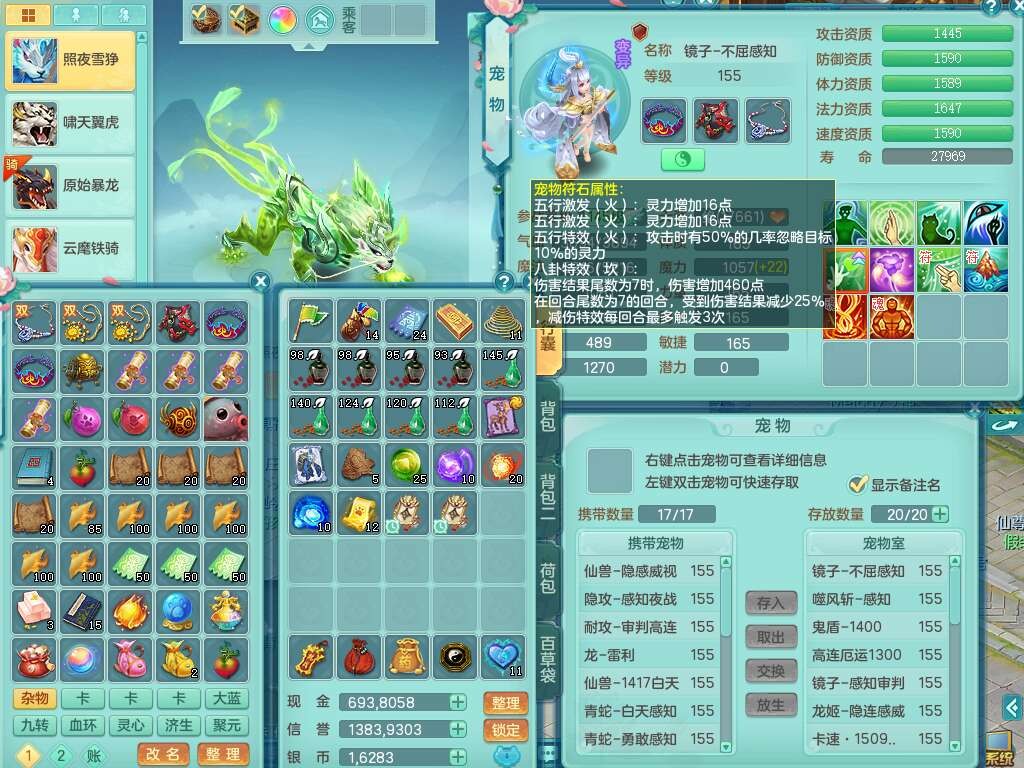 a22327天下无双159男龙宫,精灵舞,5龙1龙皮,3内胆神(2蛇1马),1破镜,【17觉醒,已潜龙】,4位靓号不含4,5宠皮,4特殊(怒破,舍身,禁锢,噬风),5只六技能镜花灵,1只六技能龙姬,伤害四溅五雷单加武器,易成长单加51衣服,272易成长净心术单加54链子,易成长单加57腰带,有法缭鞋子,法爆单加武器,5.5基础鼎+280血,15个永久格子,20个纯六字,1个五字,28只满果子,宠排在榜,7只坐骑,暴龙泰坦+神驹马上发财,冰晶庭院,带82天月卡。