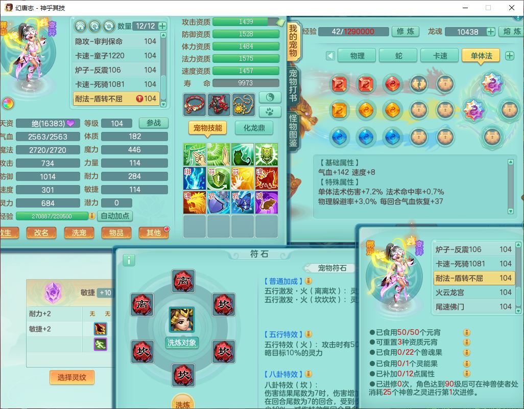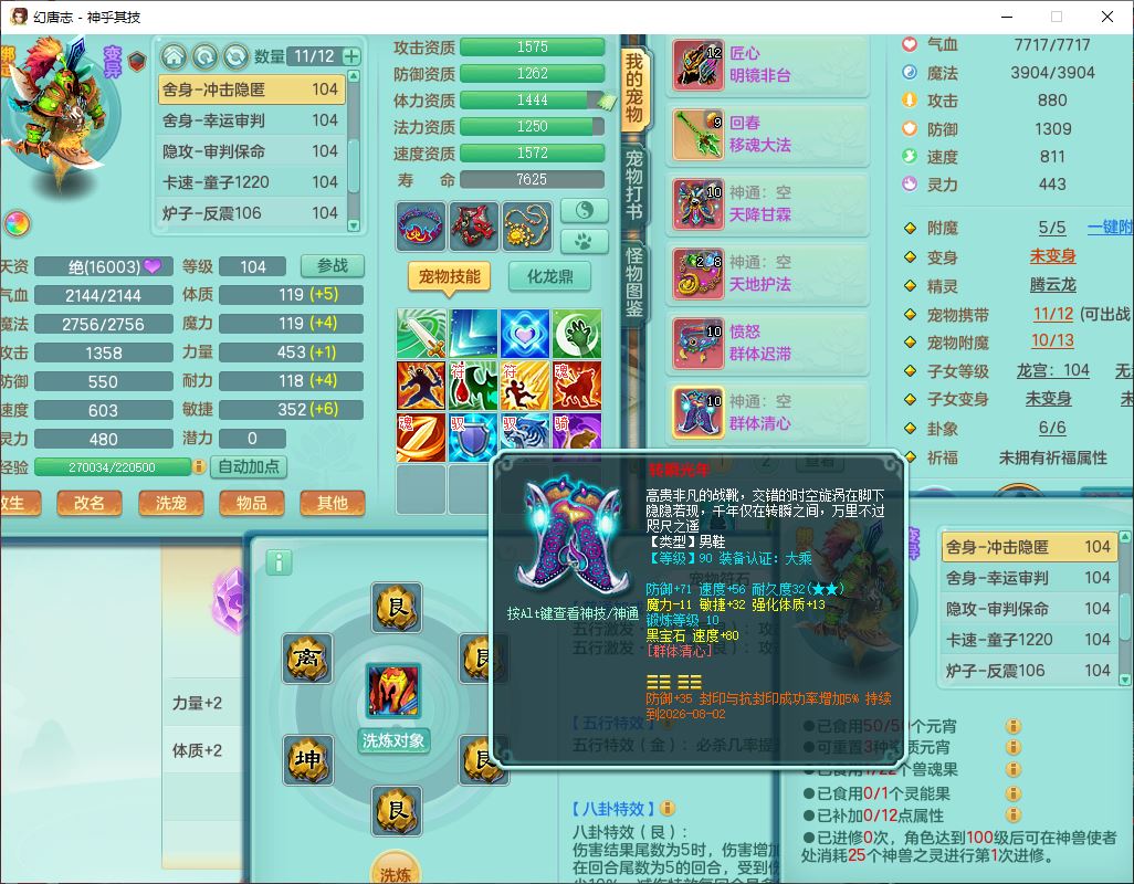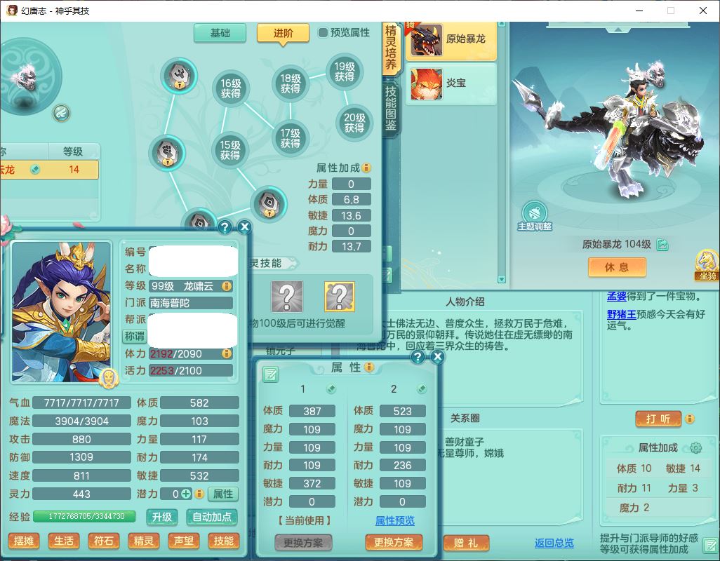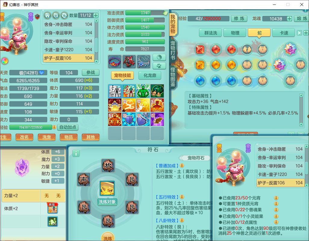 99797神乎其技99男普陀【暴龙逍客+西瓜冰】体敏耐精灵,1内丹小马(带蛇影)4翻江2舍身1童子1金炉,2觉醒1宠皮2六字1五字10四字,9红装备,匠心明镜帽子,回春移魂武器,愤怒群体迟滞腰带,鼎1.2,34天月卡,永久外观、精灵皮肤,33个内丹碎片,2坐骑