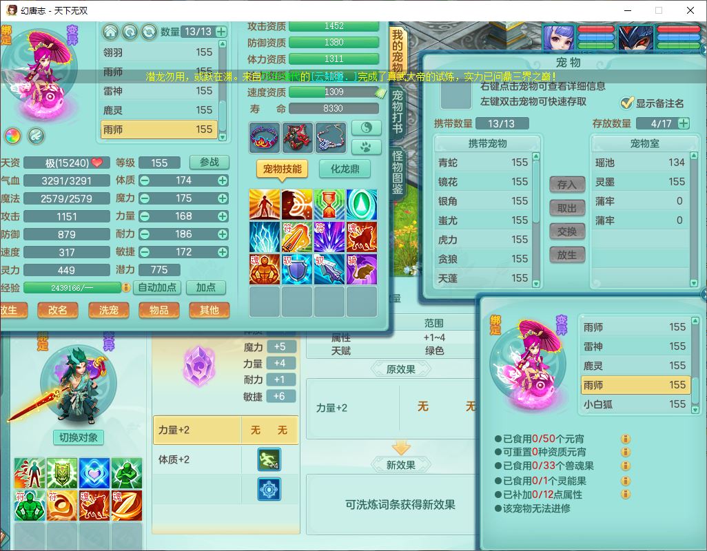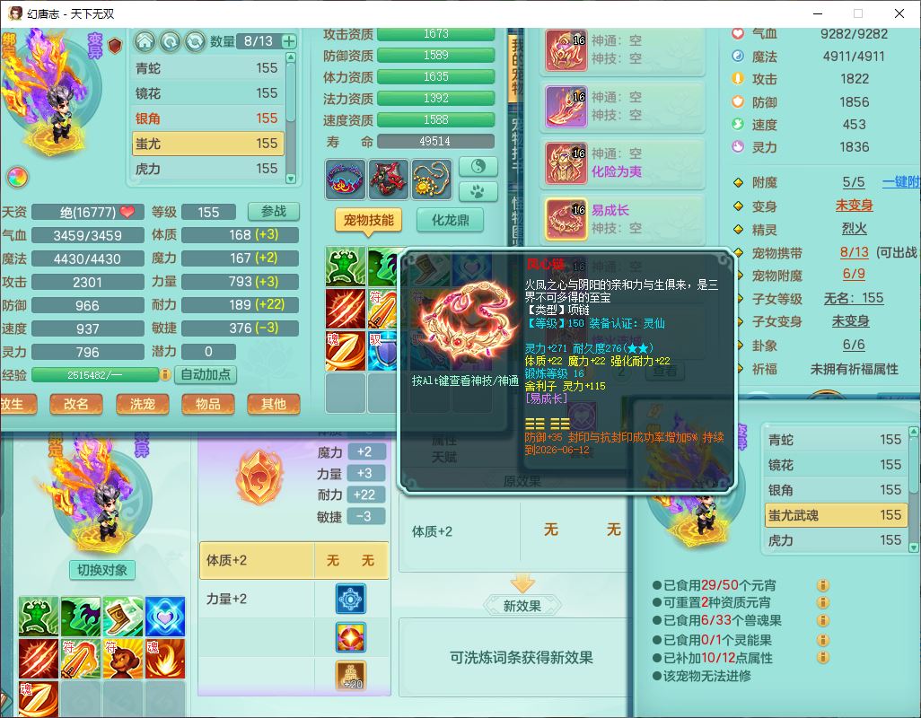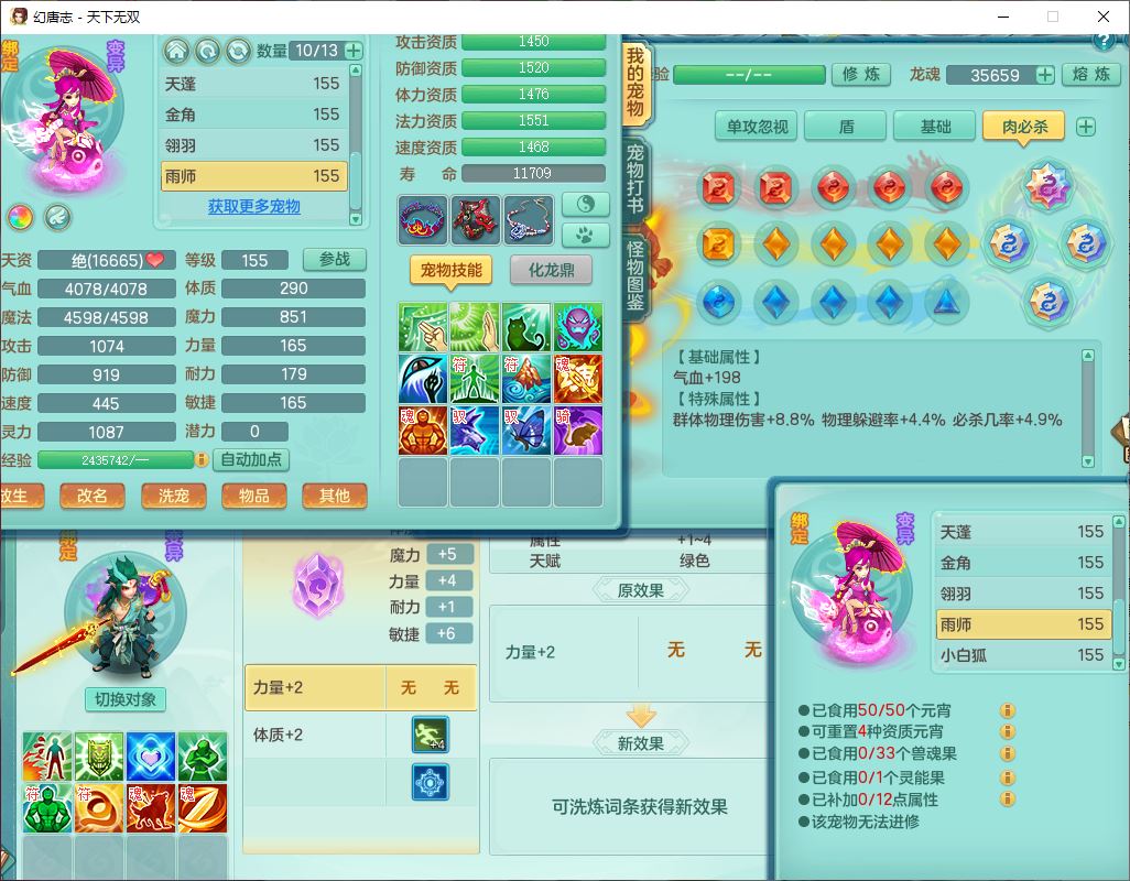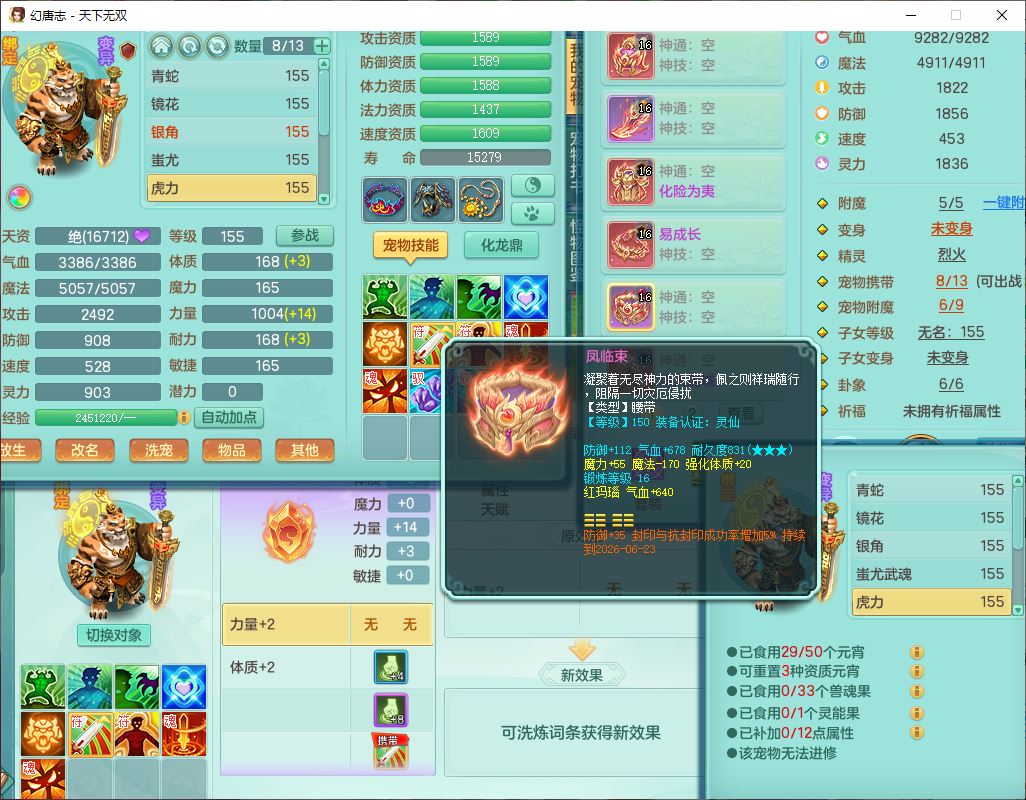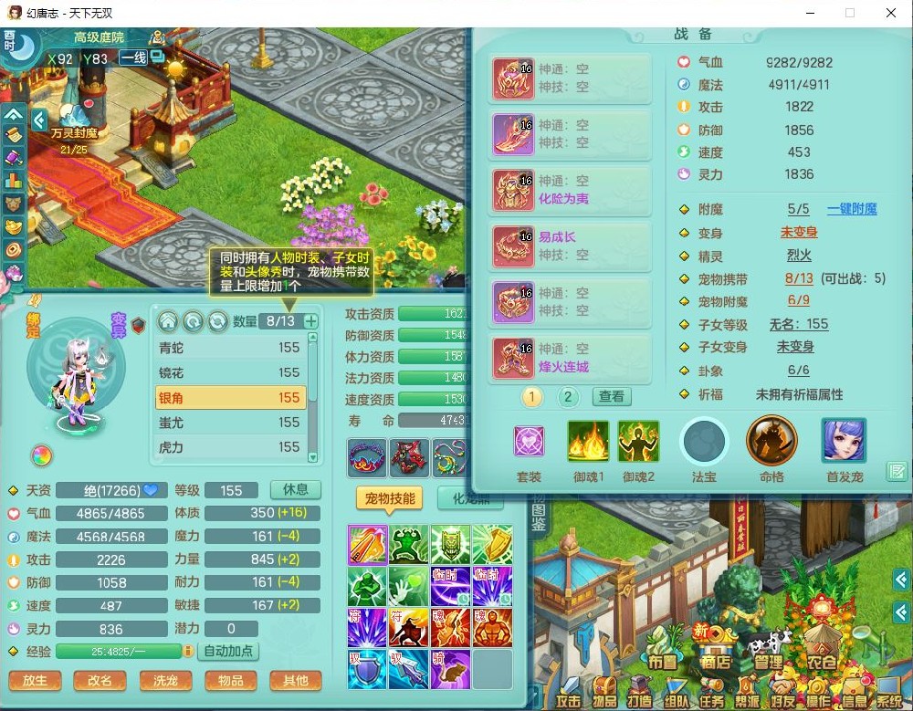 tx10429天下无双159男魔王1小精灵,1青蛇(无内)14只成品满高书宝宝,1孩子(无名),装备齐全,260多w神武币,1页多还童丹,有秘方药,1飞行坐骑