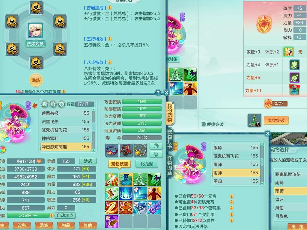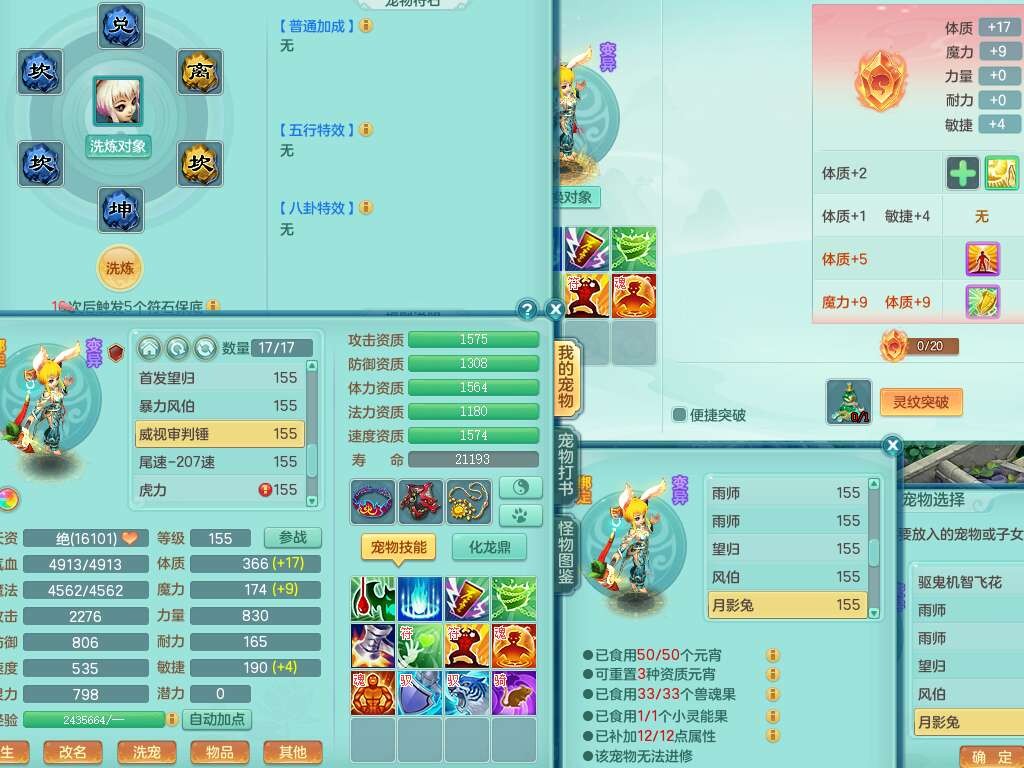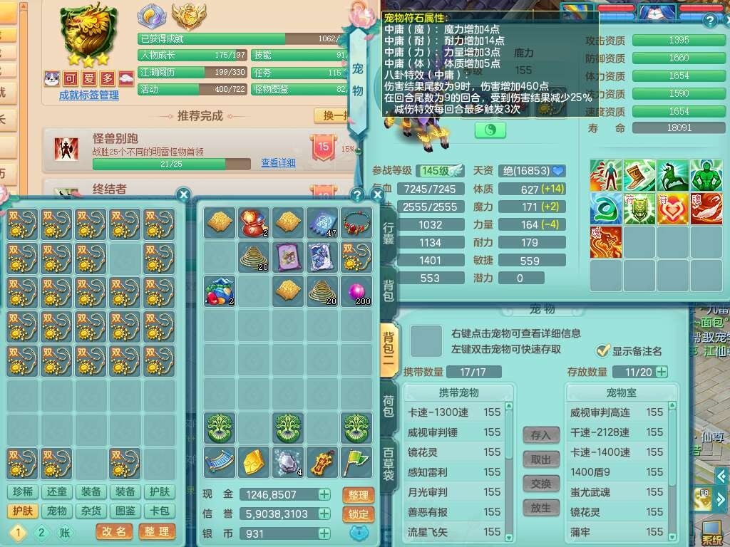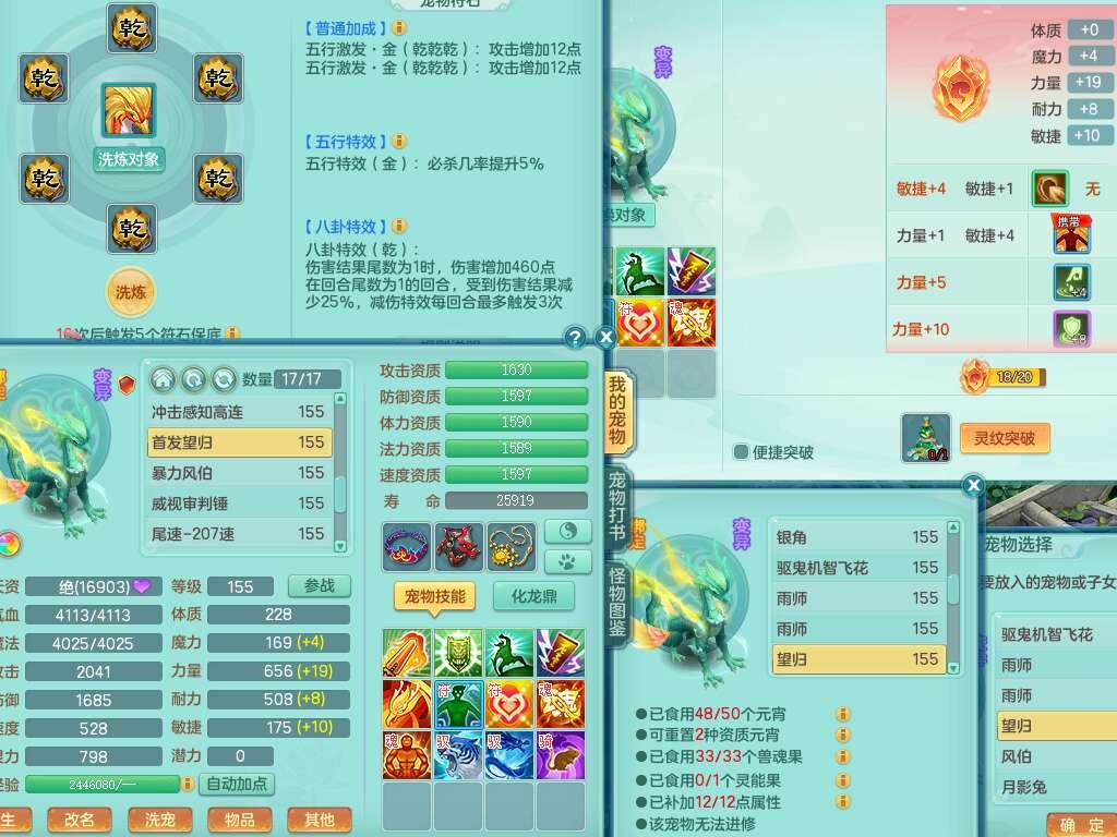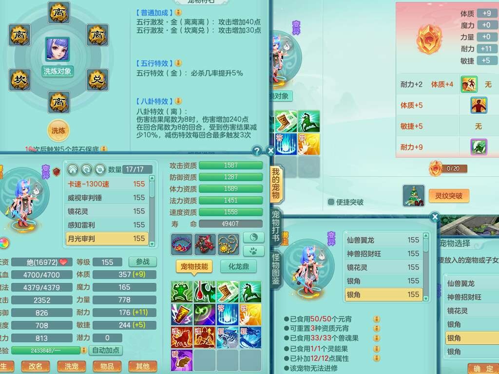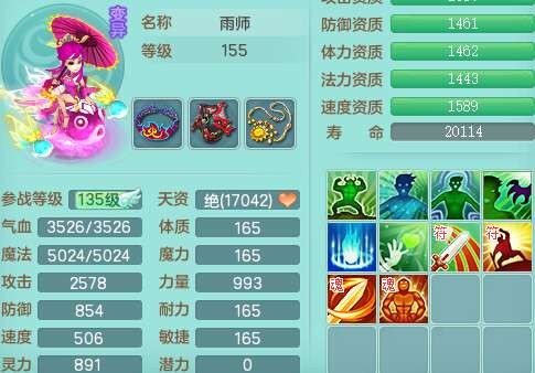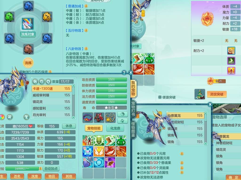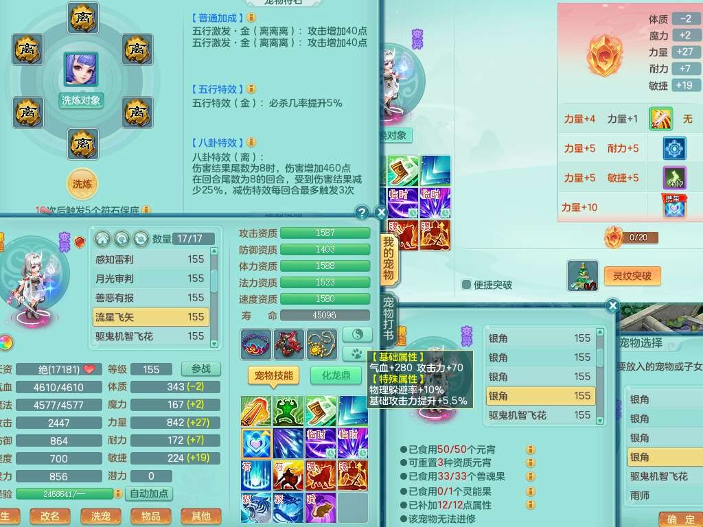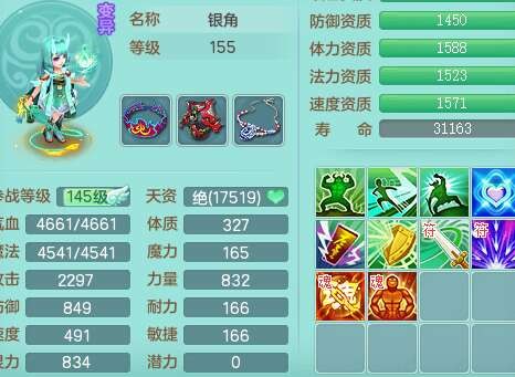 s22348战无不胜159女龙宫,精灵舞,1龙无内,1内胆神,【10觉醒,已潜龙】,6特殊(雷厉*2,月光,善恶,流星,飞花),1只六技能镜花灵,易成长四海单加头,五雷武器,易成长单加50衣服,276易成长链子,愤怒单加51腰带,法缭群体卸甲鞋子,5.5基础鼎+70攻+280血,躲避10%,15个永久格子,8个纯六字,18只满果子,宠排在榜,经验在榜,双人坐骑。
