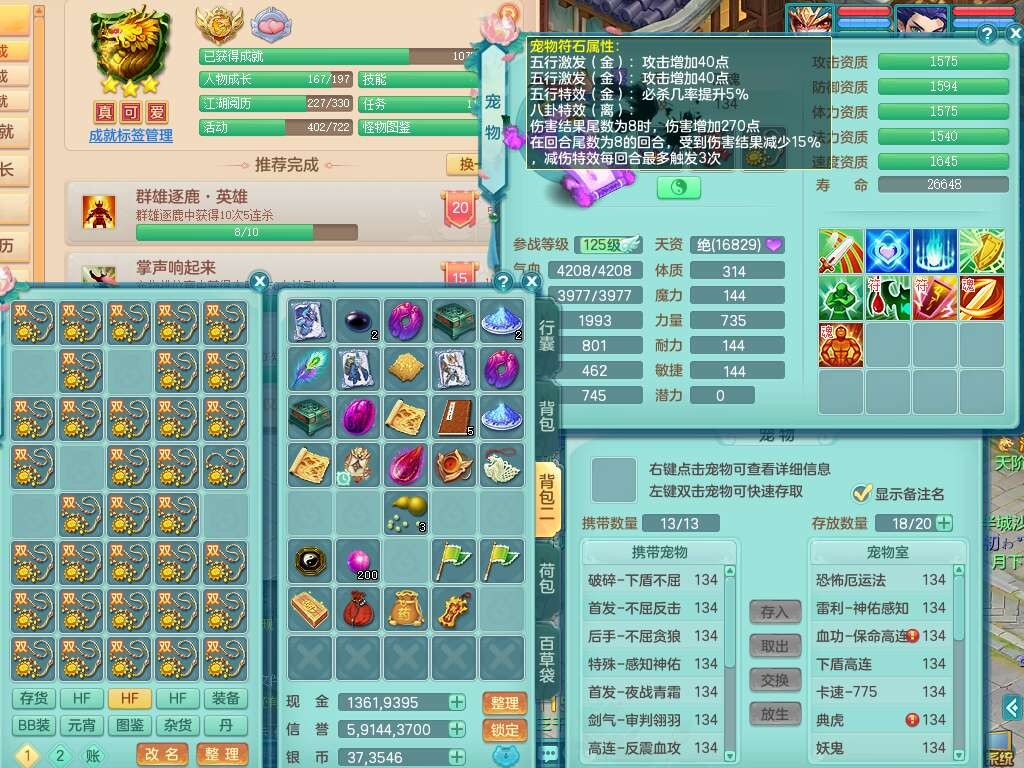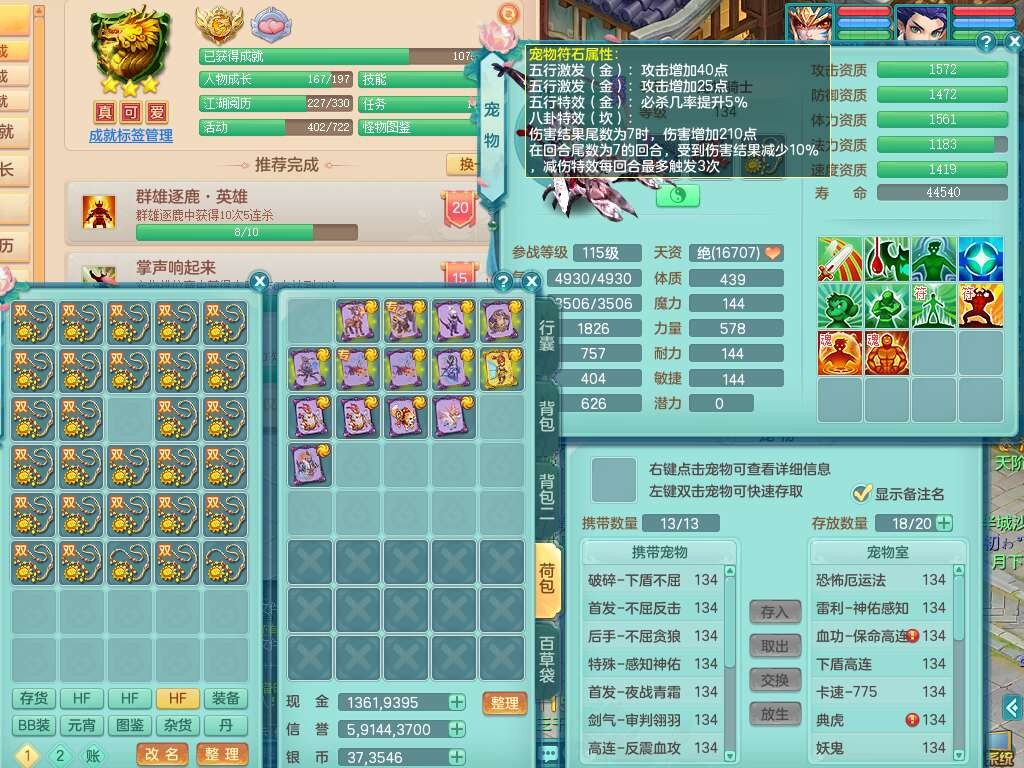 A22347今年勇129龙宫,精灵歌,1内胆神,【7觉醒,已潜龙】,封印精通烽火单加头,匠心法爆单加46武器,三红易成长强化防御群体激励单加45衣服,214易成长单加41链子,易成长四海单加腰带,法缭鞋子,4.0基础鼎+56攻+224血,7个纯六字,2个五字,12只满果子,宠排在榜,有32个神兽内丹碎片,34天月卡。➕129女盘丝,愤怒五特,3.5基础鼎,1只坐骑。