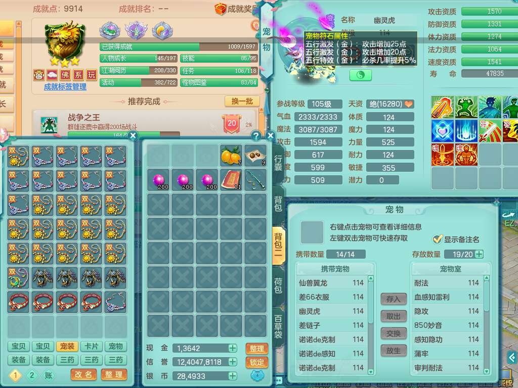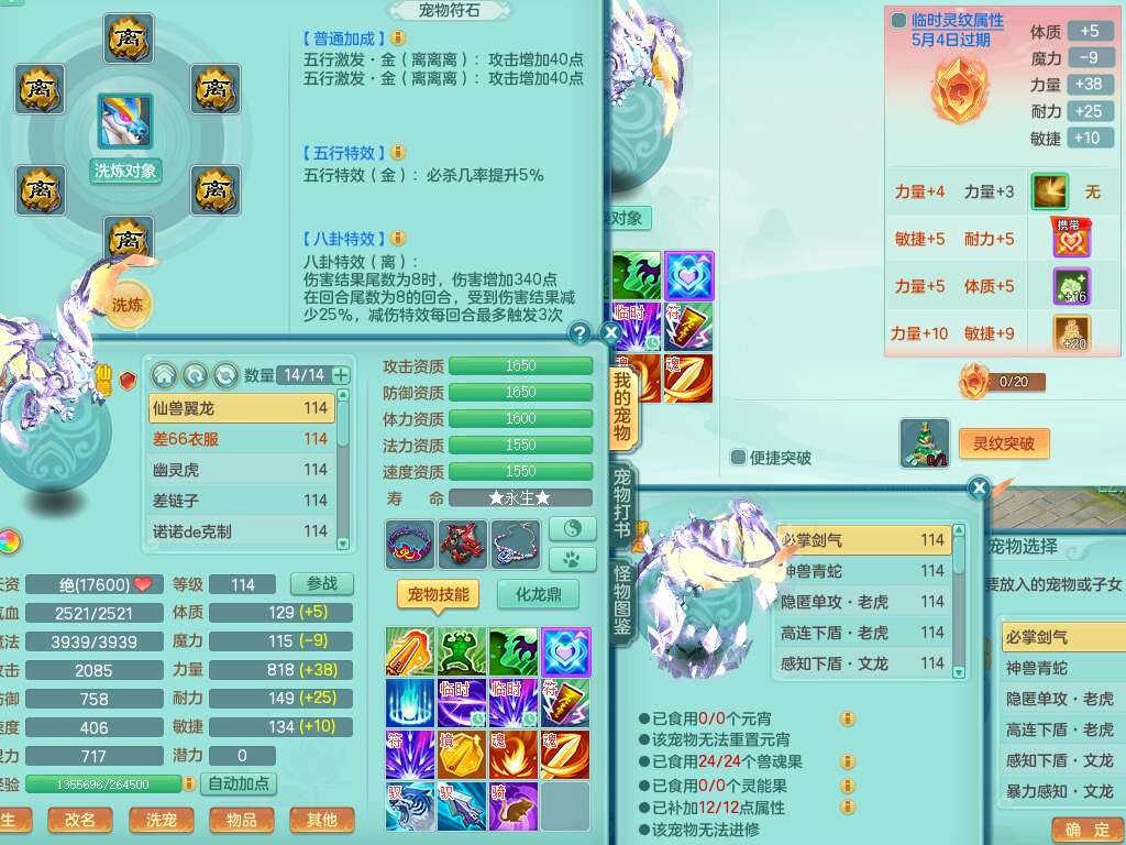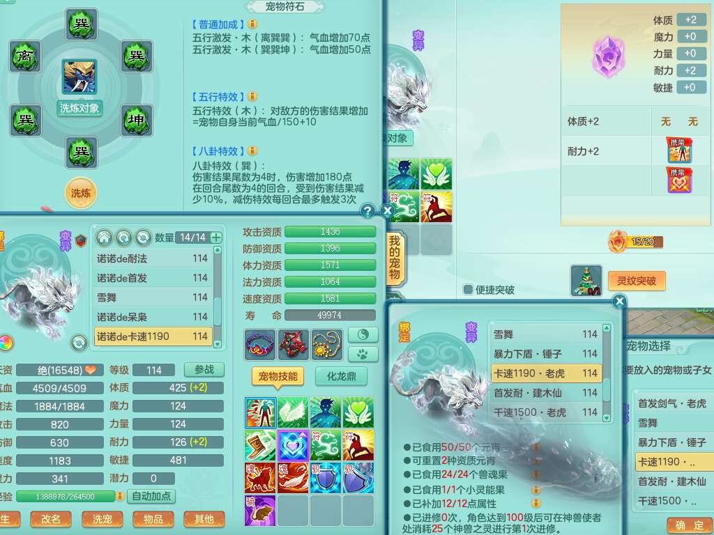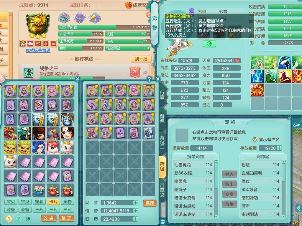 J22357风驰电掣109男力天宫,1龙1内胆神,1破镜,9只觉醒(潜龙条件化龙鼎满足,符石差2个附加属性,宠物1只满足),4宠皮,615必杀单加武器,匠心破血单加腰带,有愤怒玉清腰带,愤怒群体守备腰带,可玩辅助愤怒六特,2.5基础鼎+42攻+168血,3个纯六字,2个5字,16只满果子,宠排在榜,背包38神兽内胆碎片,3个黑白染色坐骑,月卡还有62天。➕109女无名谷,精灵歌,1神兽+36神兽内胆碎片,4只觉醒。