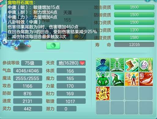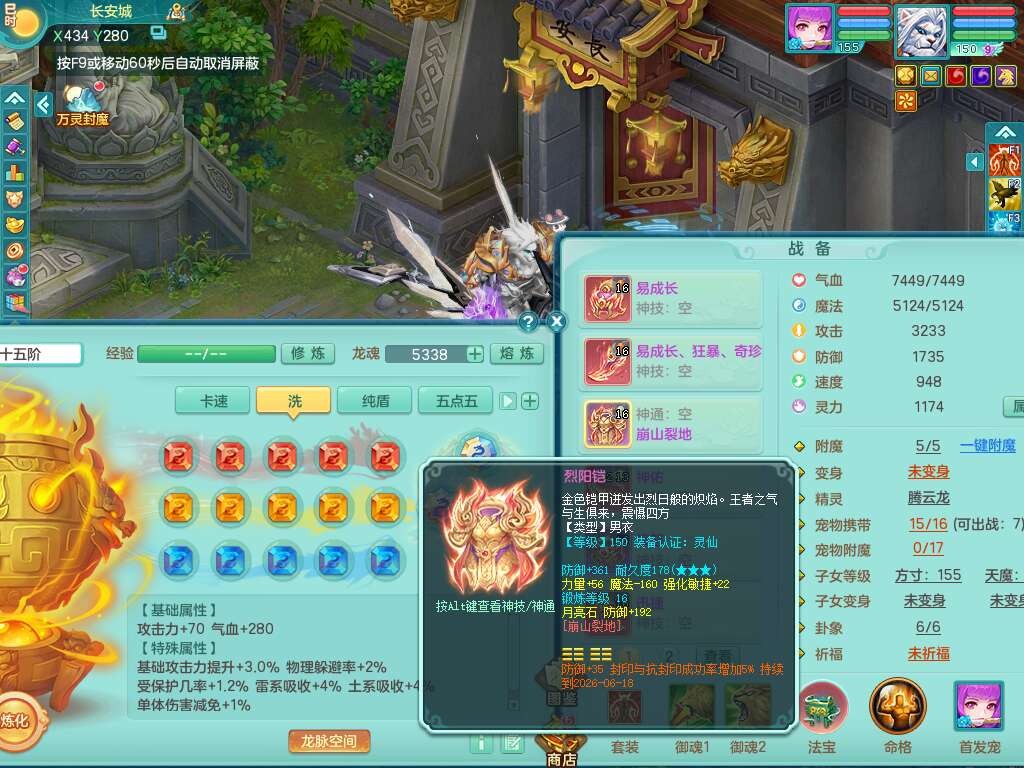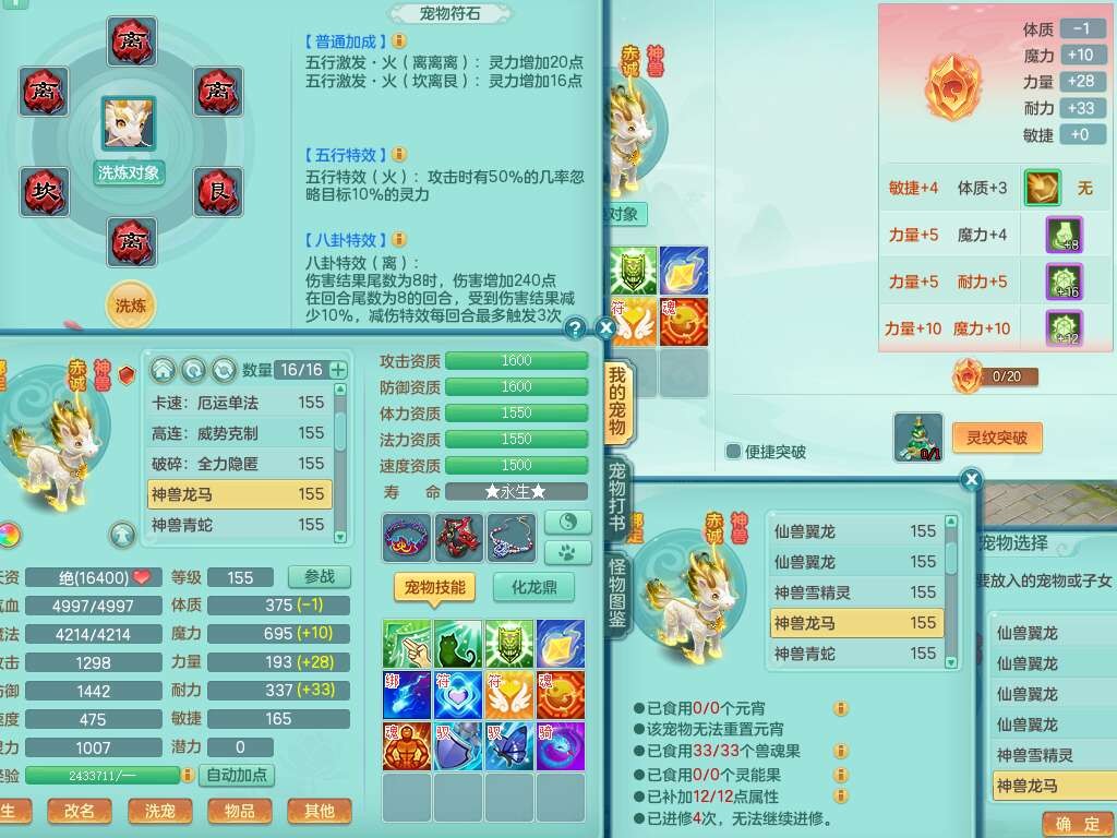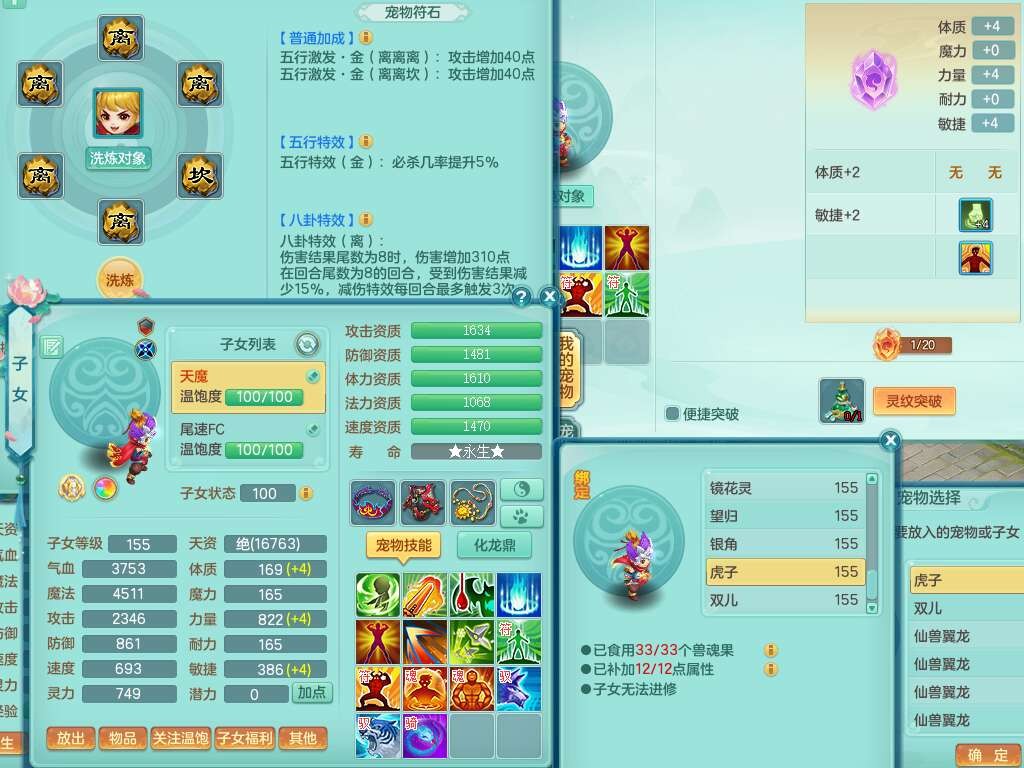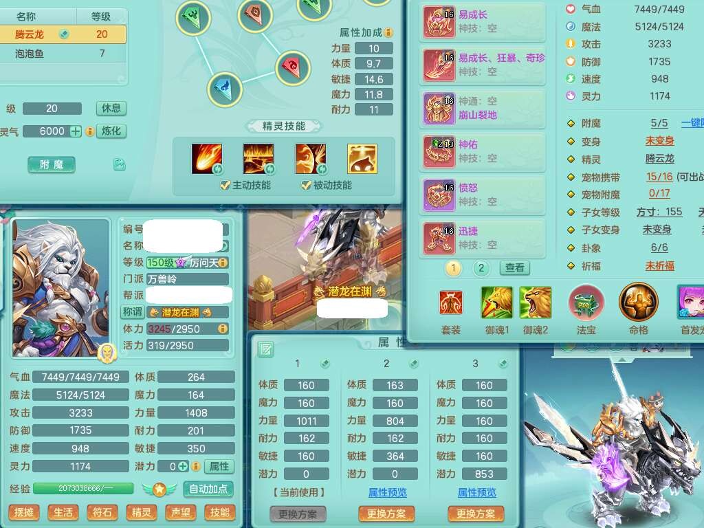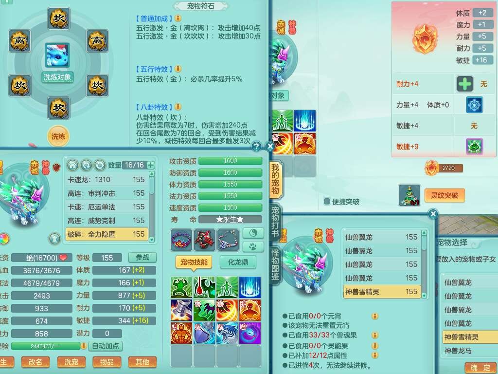 J22355少年游159男万兽,精灵歌,5龙(1龙无内),3内胆神,1破镜,【12只觉醒,已潜龙】,4位靓号不含4,6宠皮,1特殊(虎虎),5只六技能镜花灵,1只6技能龙姬,三红易成长狂暴奇珍武器,崩山裂地单加56衣服,神佑单加56链子,迅捷单加56鞋子,有易成长五雷单加55衣服,5.5基础鼎+70攻、280血,物理躲避10%,14个格子,9个纯六字,5个五字,21只满果子,宠排在榜,修炼在榜,3只坐骑,原始暴龙泰坦,月卡还有37天。