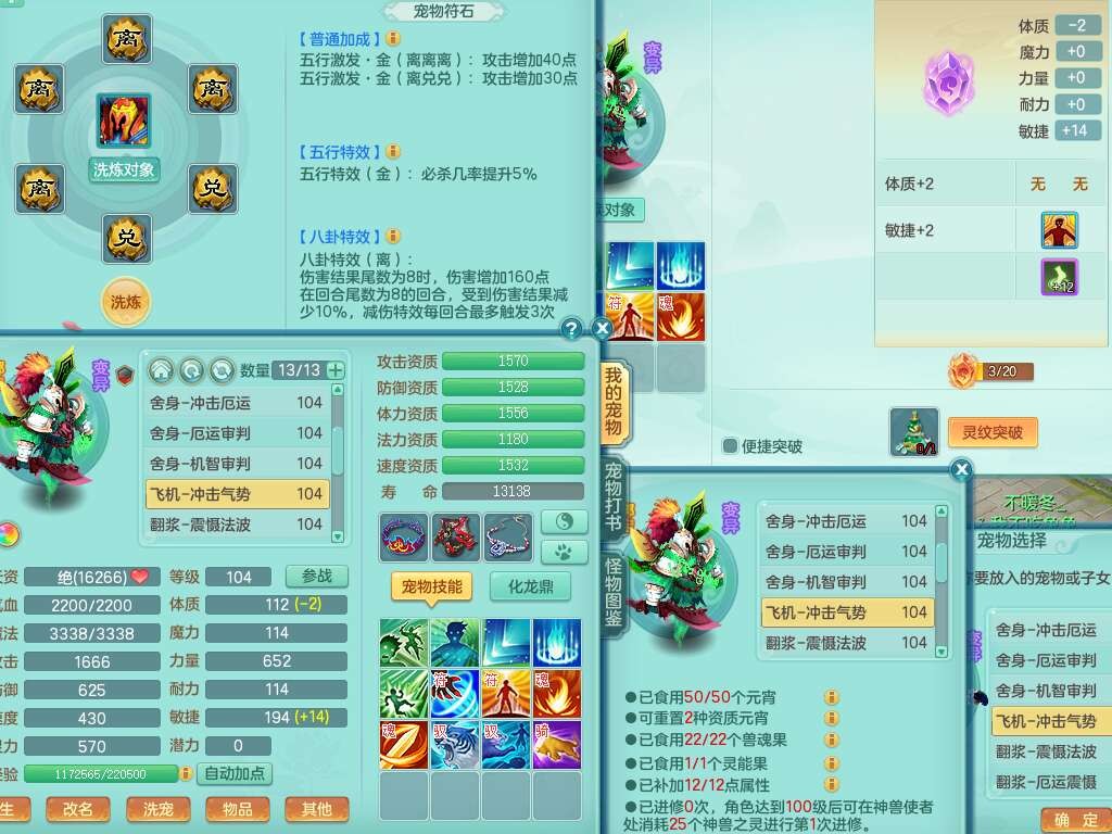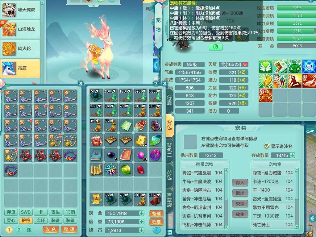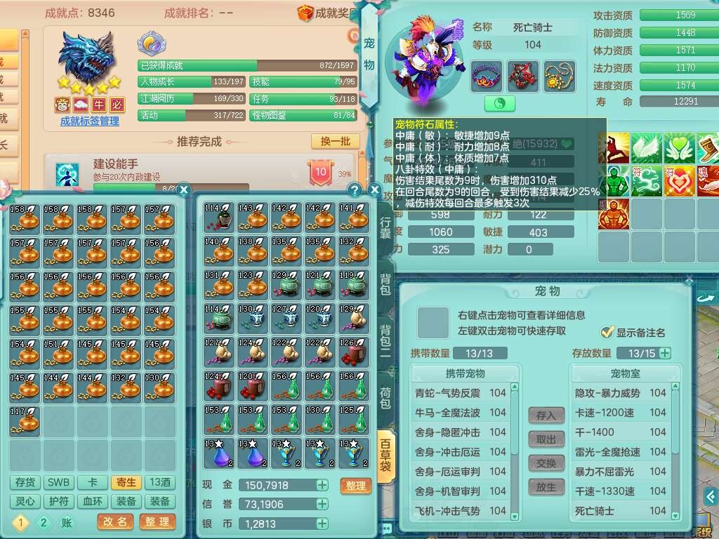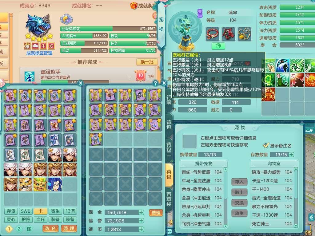 p22351风驰电掣99男万兽,2内胆神,4只觉醒,2套符石,556狂暴单加31武器,易成长崩山裂地衣服,神佑单加30链子,愤怒疾速单加腰带,易成长单加35鞋子,2套装备可玩愤怒六特,有162易成长疾速单加链子,五雷单加35鞋子,2.5基础鼎,17只满果子,3个坐骑,月卡还有51天。