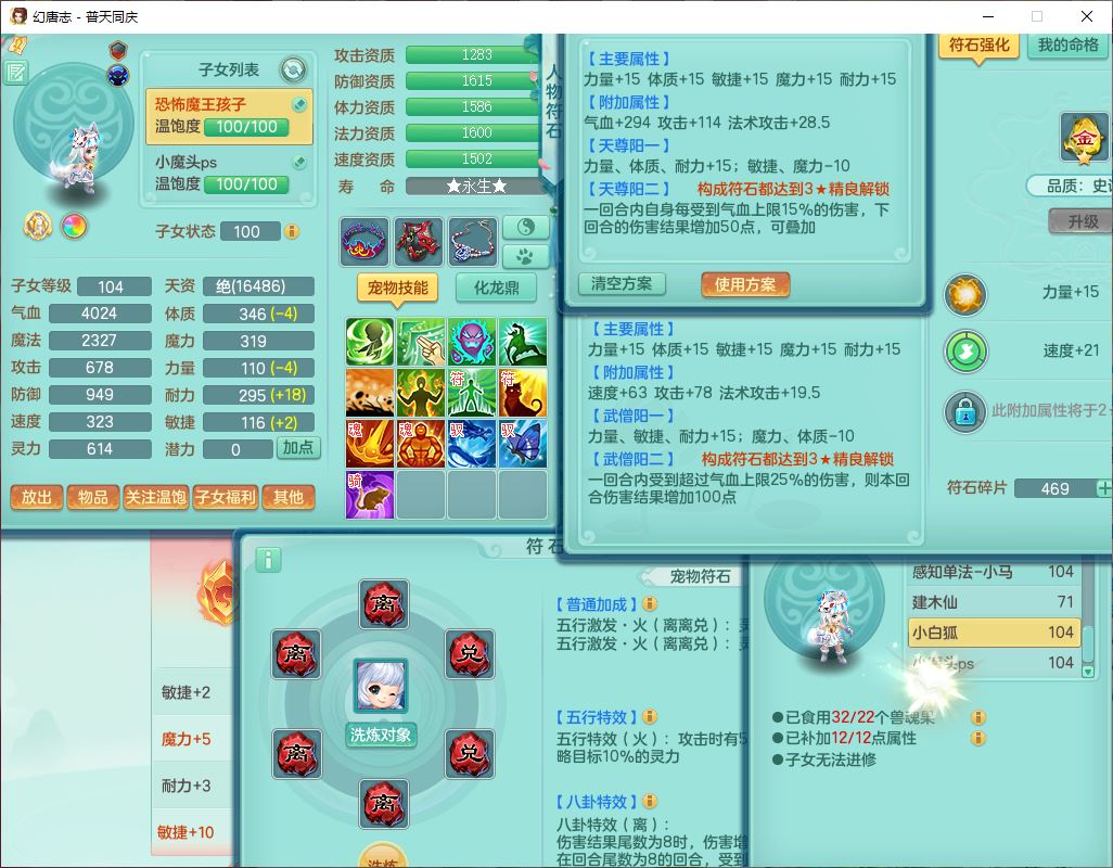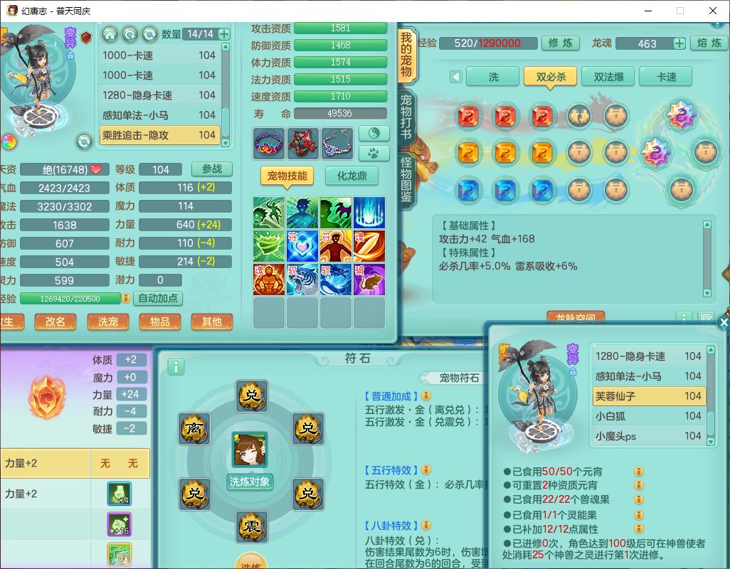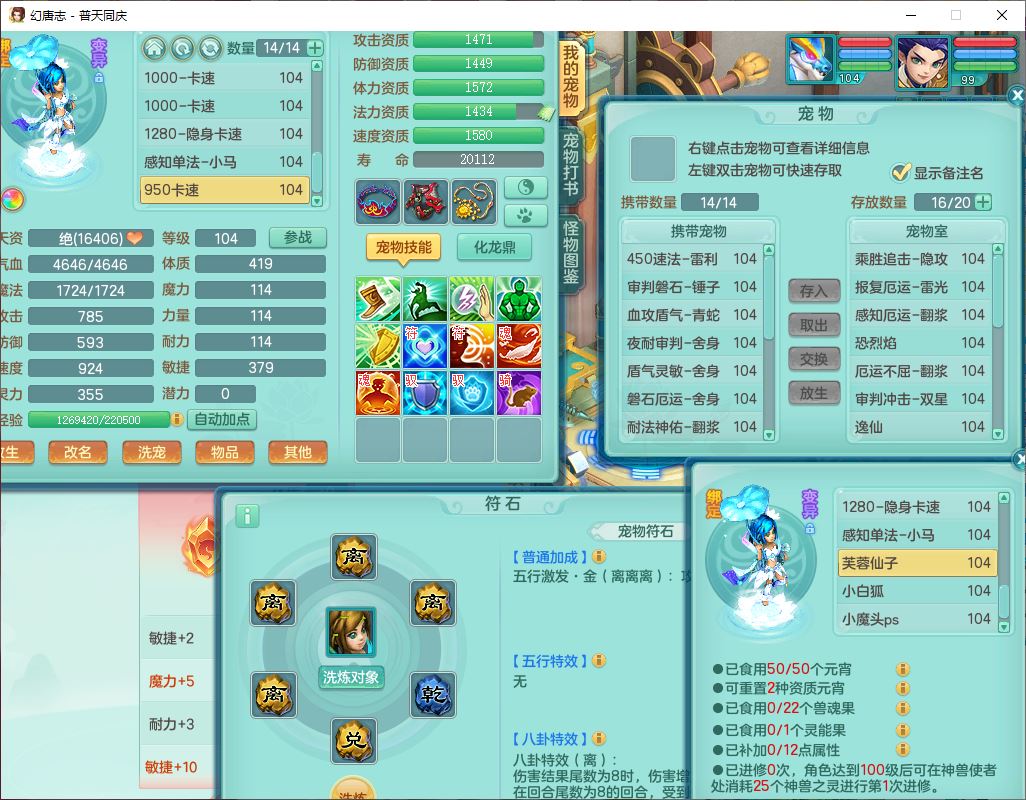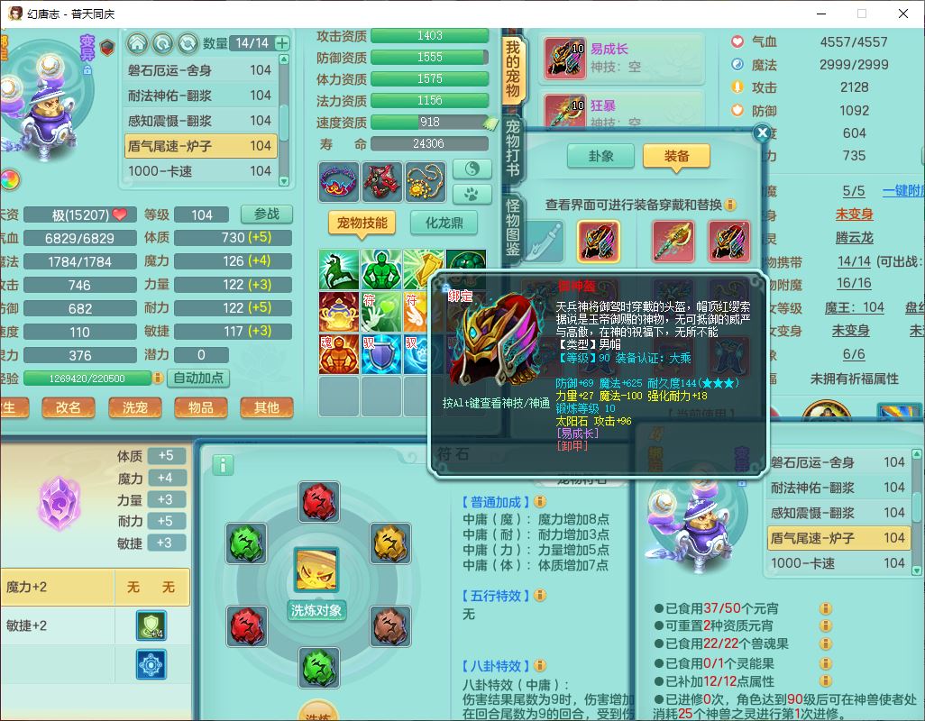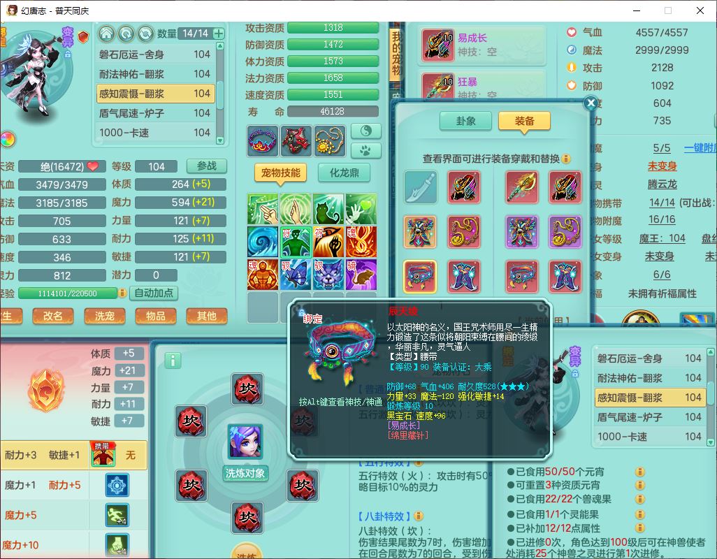62441普天同庆99男天宫【潜龙号】力敏、全魔双精灵,1龙(换,破境)3内(1青蛇1龙马,1破境)4翻江3舍身1金炉1童子,8觉醒6宠皮7六字11四字19只满果子,8红装备,狂暴武器,崩山衣服,神佑乱刃项链,Y四海鞋子,Y笑里腰带,Y卸甲帽子,鼎2.5+42+168,3套符石,77天月卡,庭院157房屋153,永久外观、精灵皮肤,46个内丹碎片,2坐骑