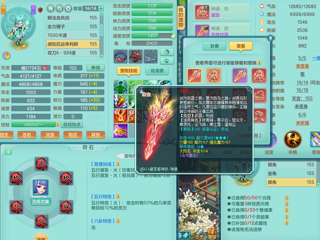jn10444今年勇159男普陀精灵舞,满级共鸣,1内丹龙1内丹神,1特殊(破碎)10只满果子2觉醒11个4字2个6字,愤怒5特,神佑止戈项链,法系法爆武器,Y双红衣服,272单加Y项链,鼎5.0,2套符石,庭院151