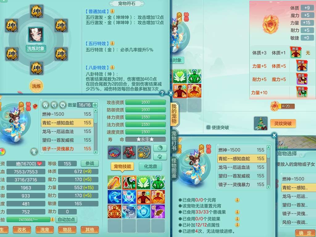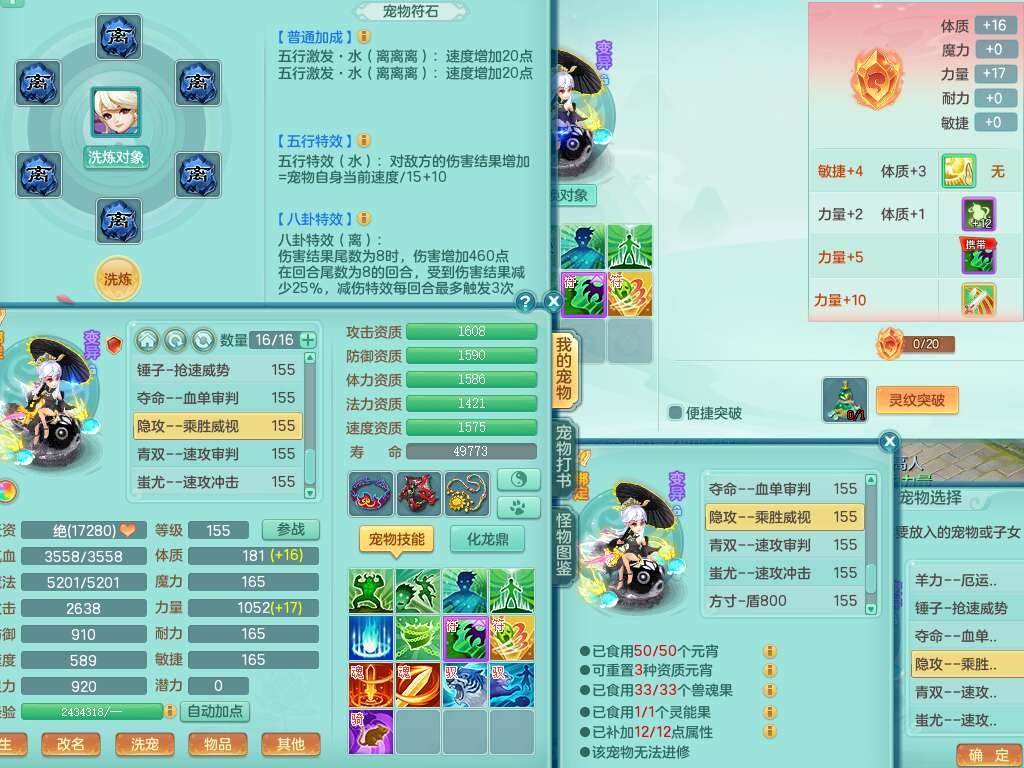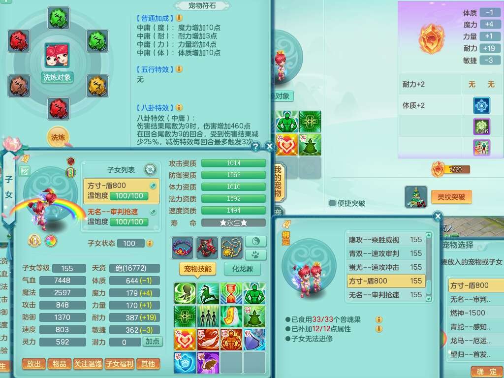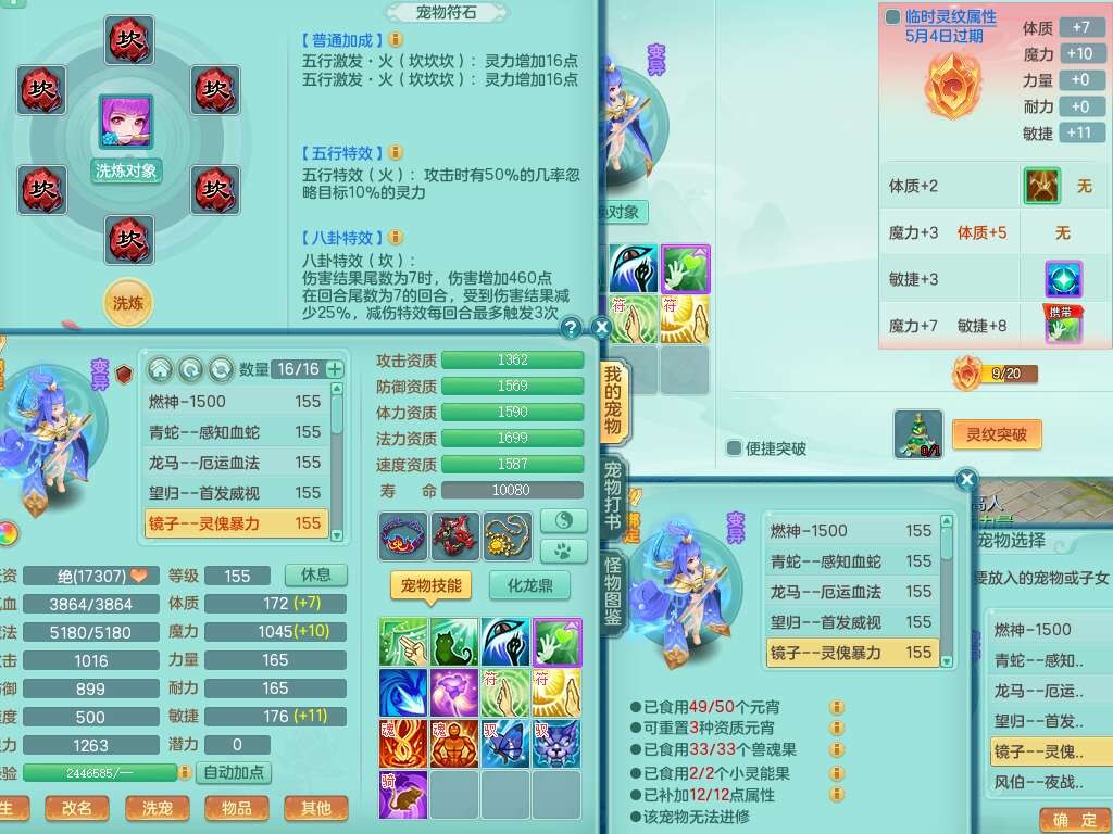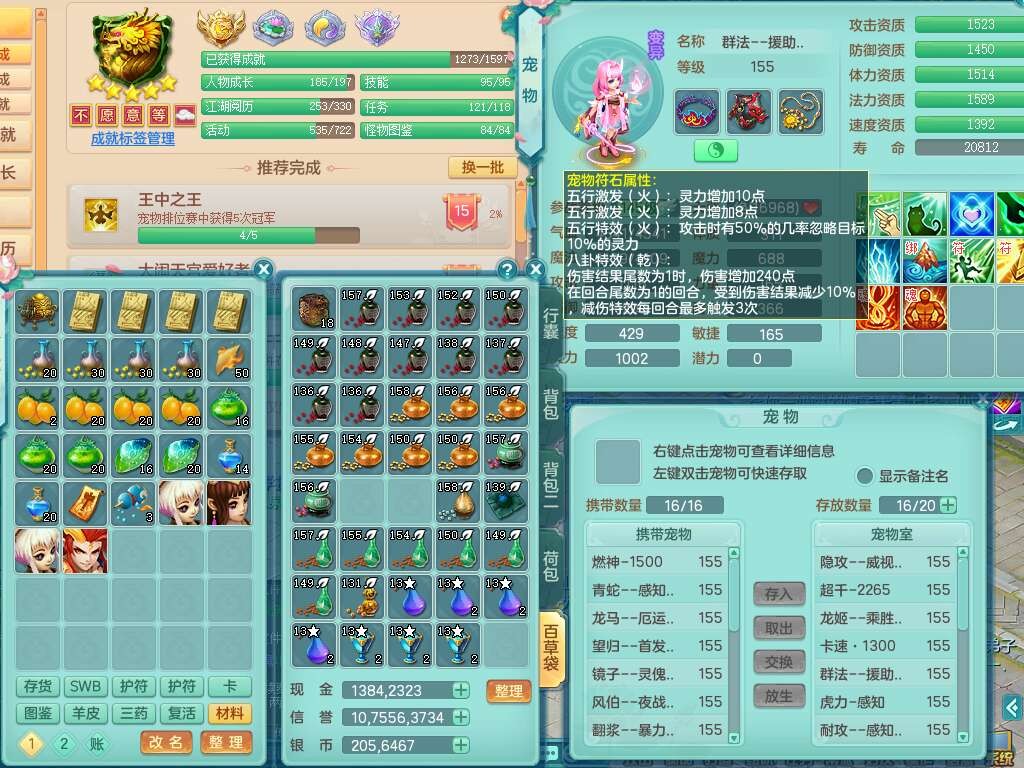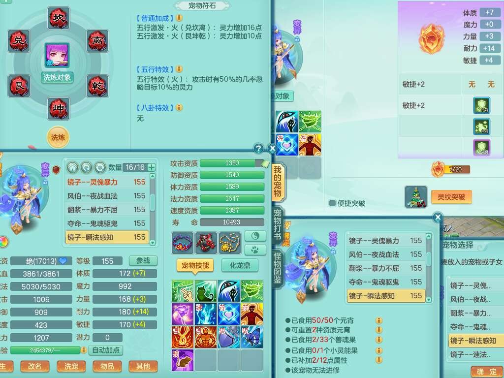 S22372风驰电掣159女方寸,精灵舞,1龙无内,1内胆神,【9只觉醒,已潜龙】,1宠皮,4特殊(青霜,夺命2,灵傀),3只六技能镜花灵,2只六技能龙姬,愤怒6特,可玩任何封辅,934易成长必杀单加武器,5.5基础鼎+70攻,280血,14个格子,8个纯六字,20只满果子,背包45神兽内丹碎片,经验成就在榜,火焰之力武器皮肤,双人飞行坐骑+火焰之力,带2272金币,205W银币,月卡还有53天。
