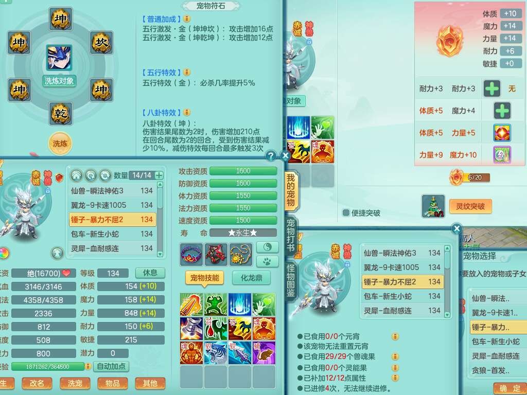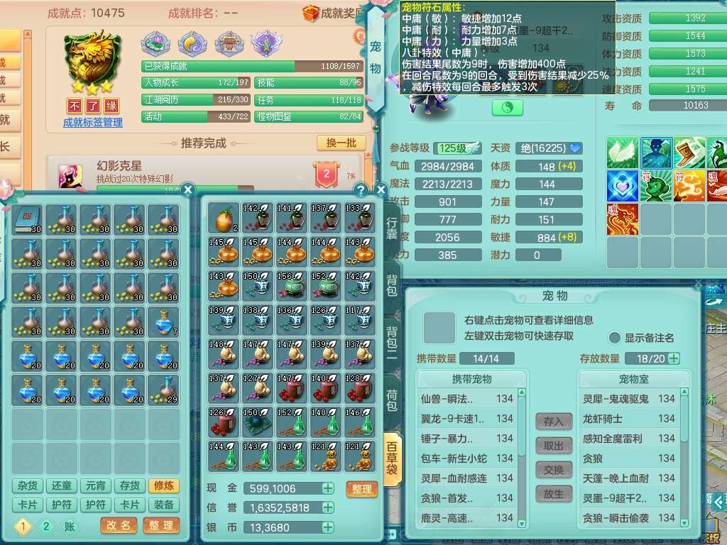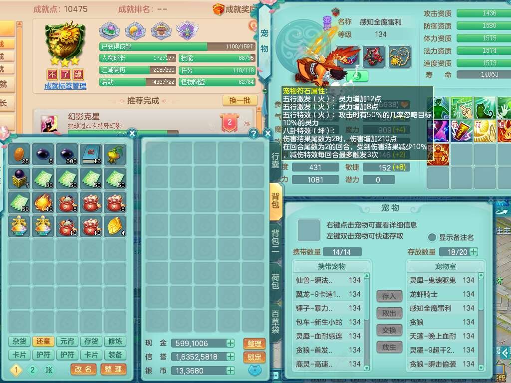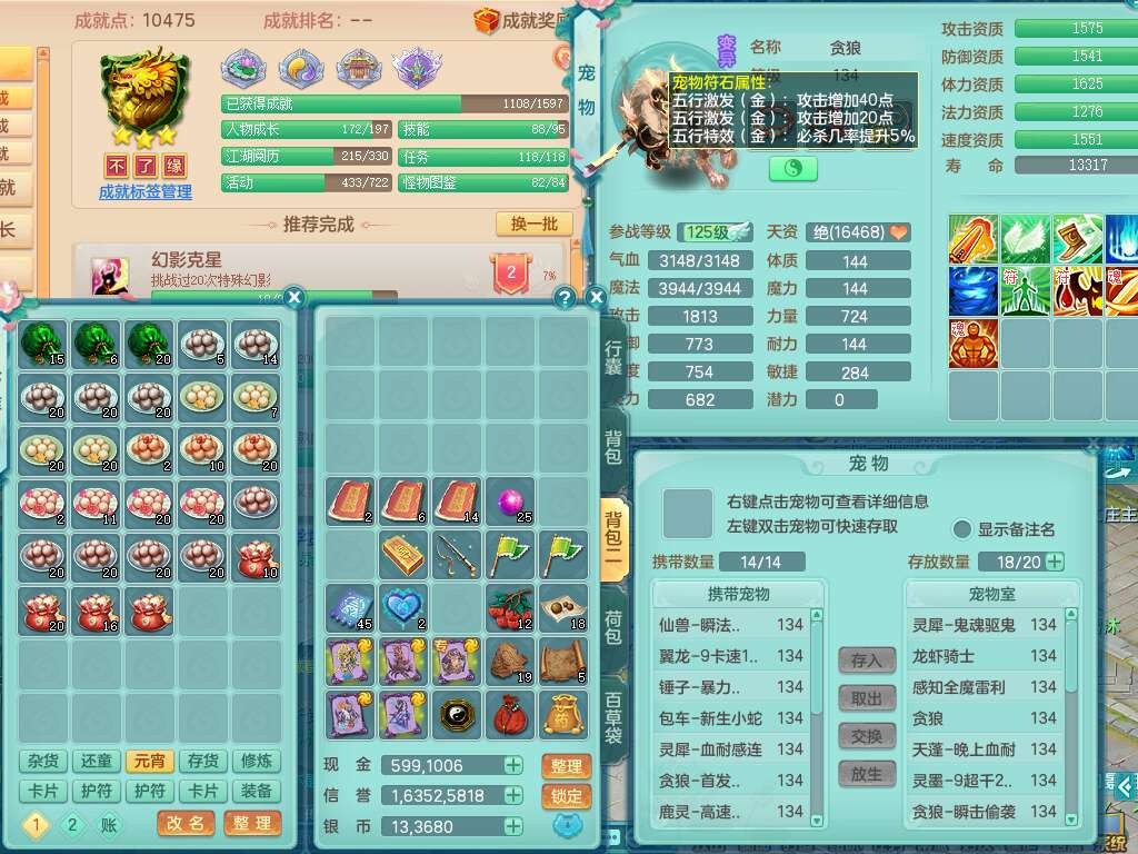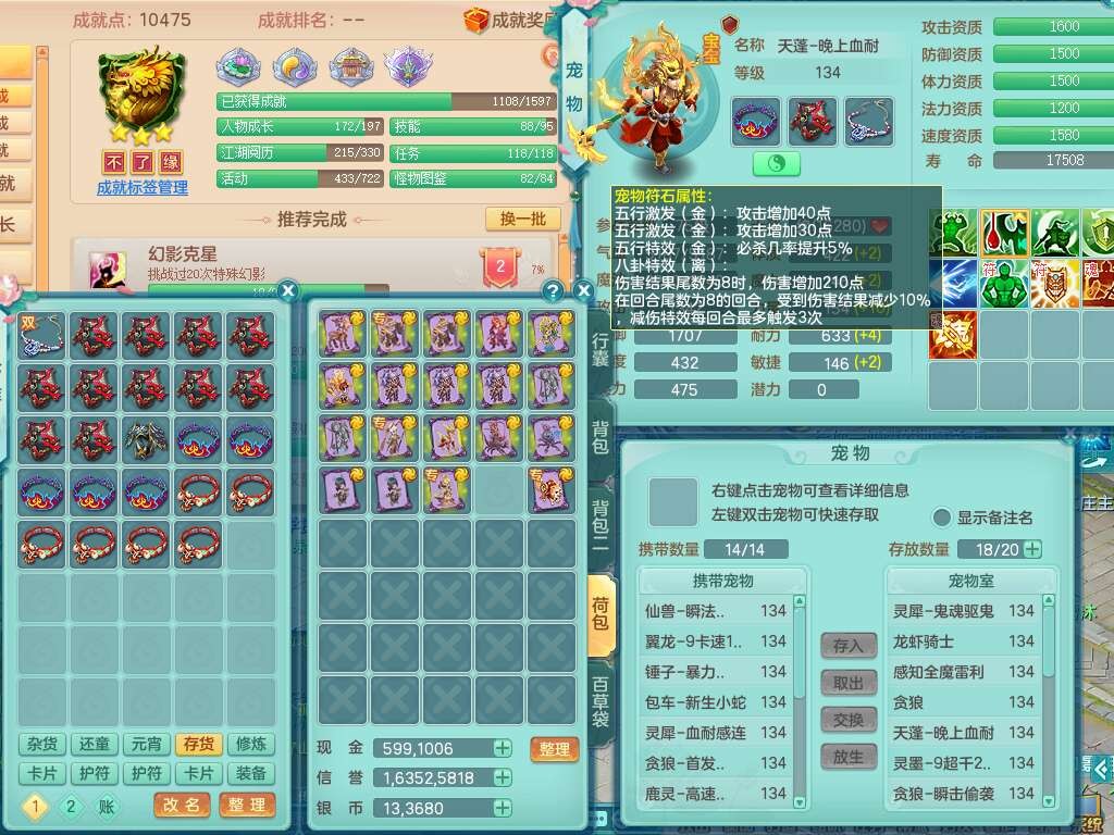 p22368风驰电掣129男万兽,精灵歌,2龙(1龙无内),1内胆神,1宠皮,6只觉醒,易成长单加40头,729狂暴武器,崩山衣服,神佑单加43项链,愤怒单加44腰带,匠心易鞋子,4.0基础鼎,15只满果子,宠排在榜,双人坐骑。