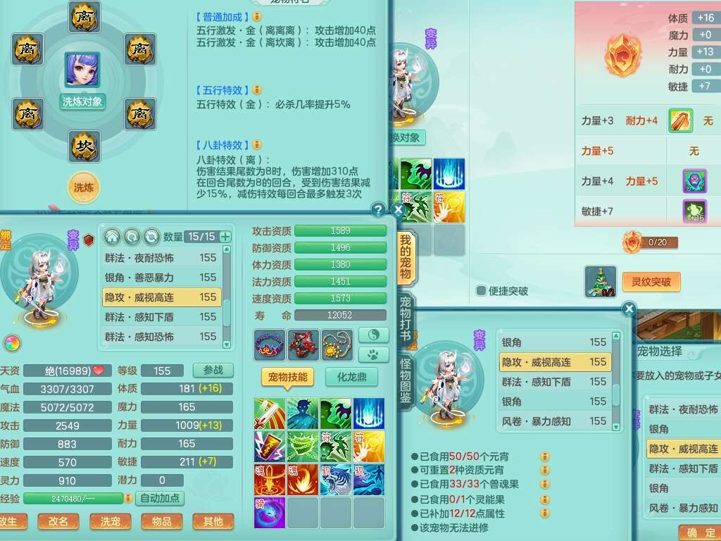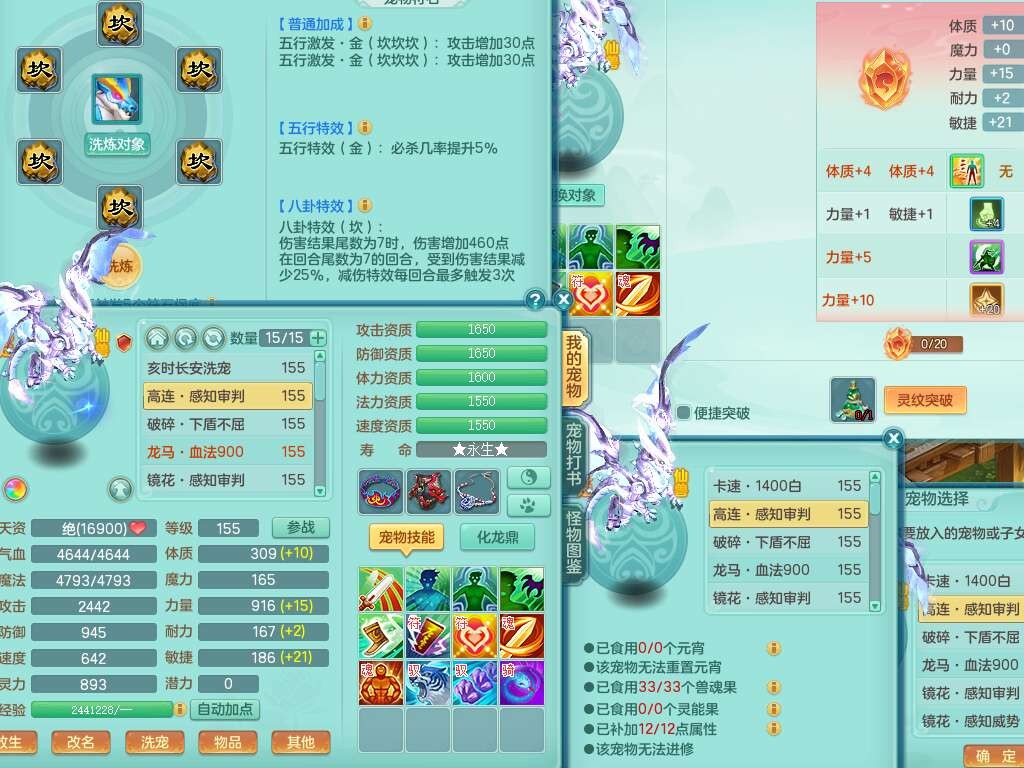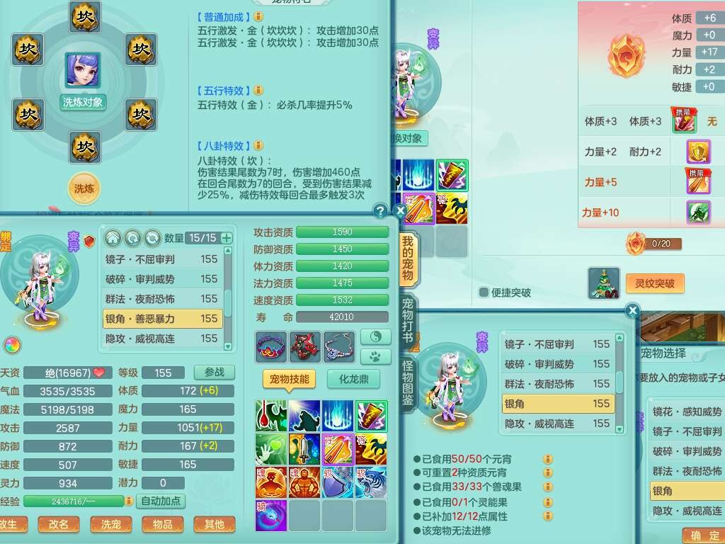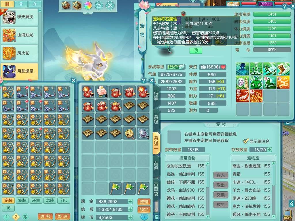 S22362风驰电掣159男灵月山,精灵舞,2龙2内胆神(1马),【10觉醒,已潜龙】,4位靓号不含4,3宠皮,3特殊(羽袭,善恶),4只六技能镜花灵,愤怒单加51腰带,易成长迟滞鞋子,五特,有愤怒单加57腰带,5.5基础鼎+70攻+280血,差174积分永久14个格子,7个纯六字,2个五字,18只满果子,双人坐骑,有40个神兽内丹碎片,87天月卡。