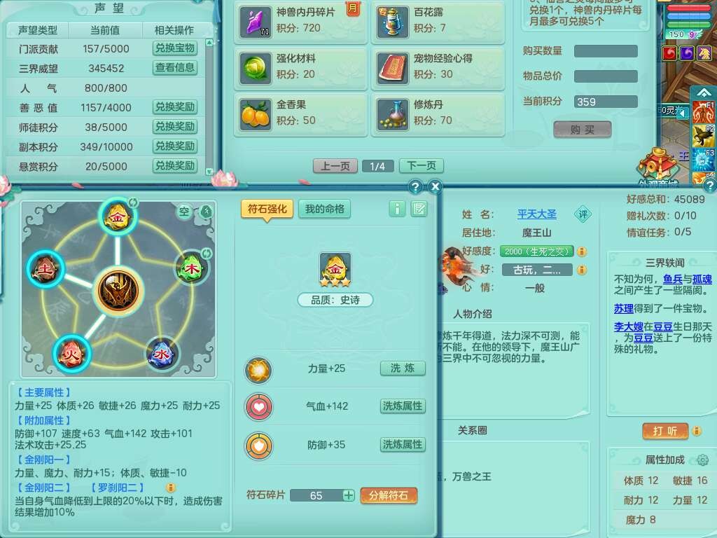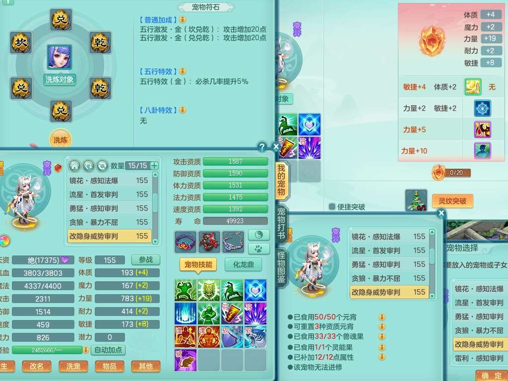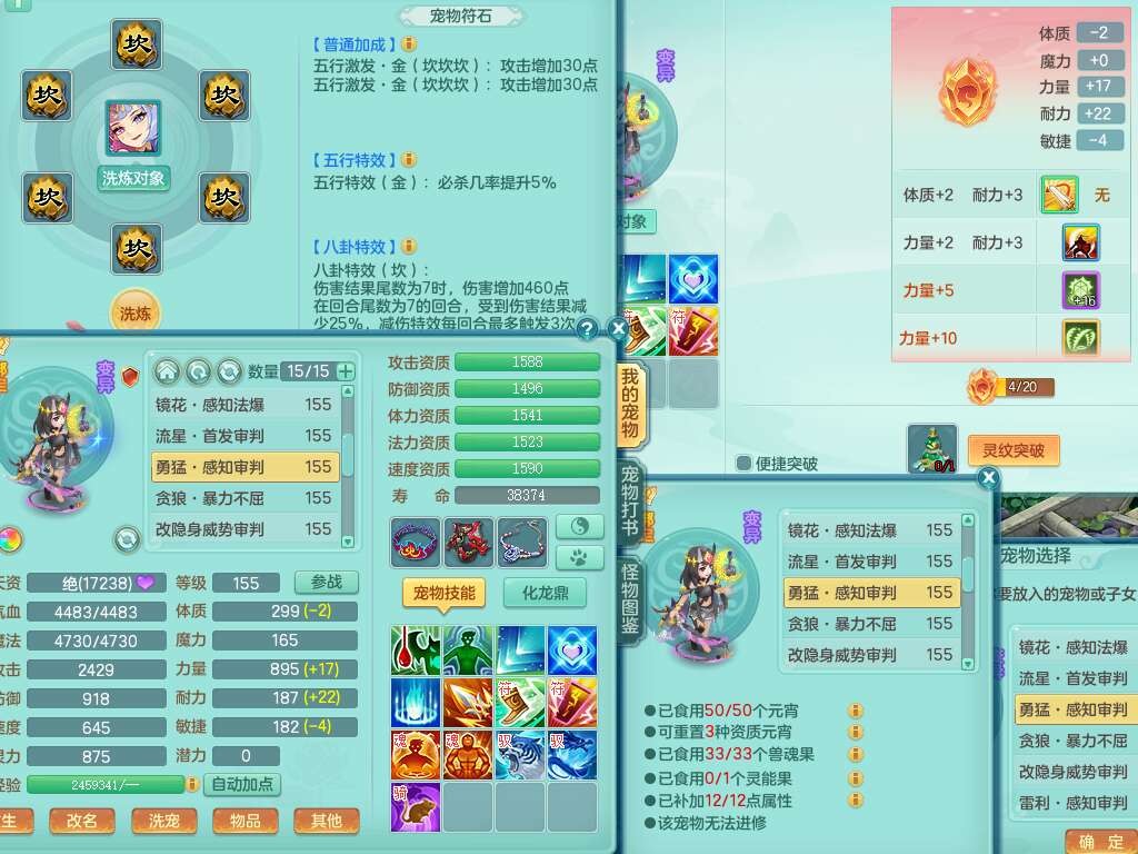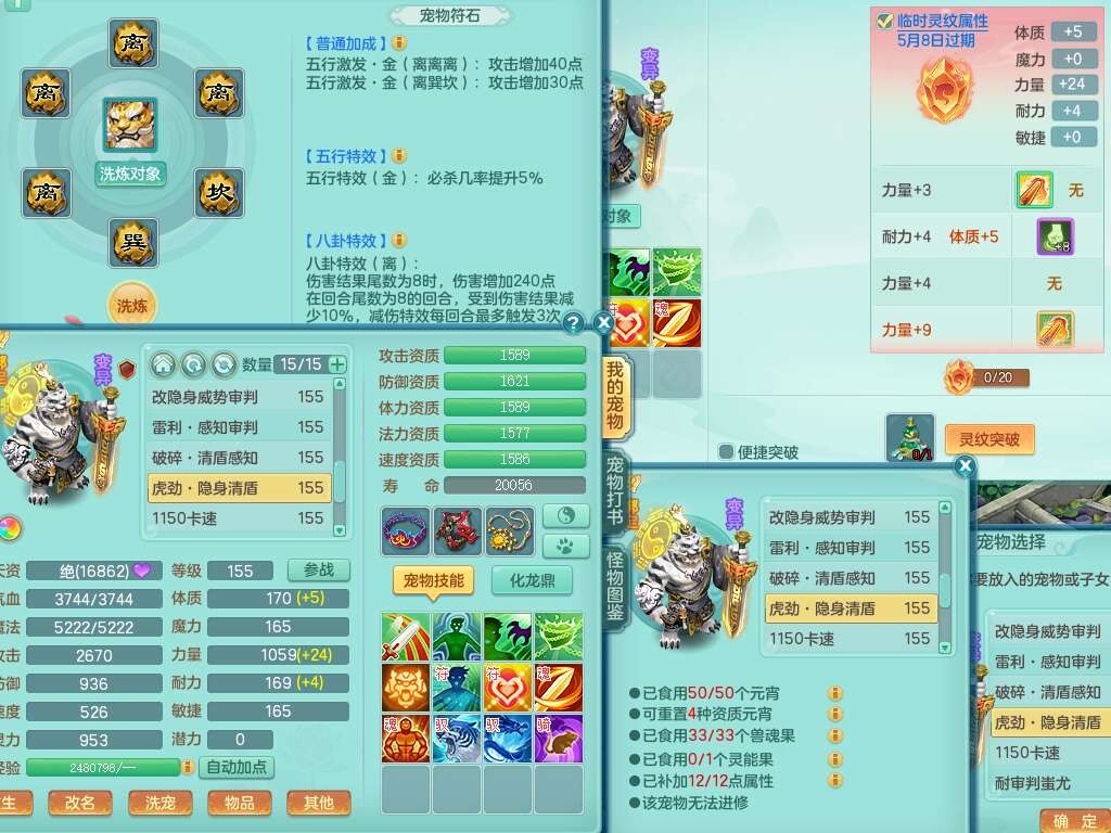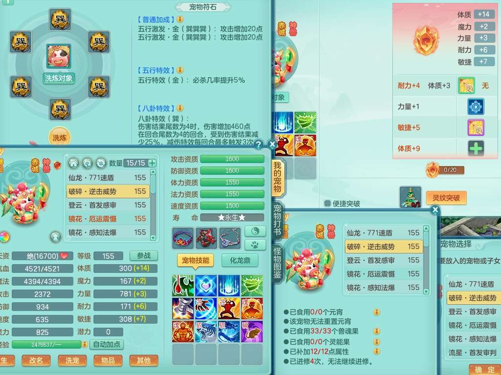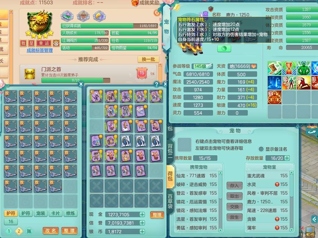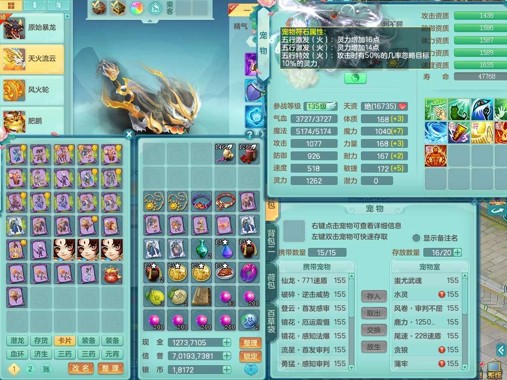 a22359普天同庆159男万兽,1龙没内,1内胆神,1神兽青蛇+32神兽内胆碎片,8只觉醒(准潜龙,化龙鼎满足,宠物只差1个觉醒,符石差3个26,2个附加),4宠皮,6特殊(流星,勇猛,噬风,雷厉,夺命,虎虎),3只六技能镜花灵,崩山单加55衣服,易成长晶清单加54鞋子,926易成长武器,易成长单加57腰带,5.5基础鼎+70攻+280血,物理躲避10%,13个格子,8个纯六字,16只满果子,仓库还有77个果子,2个双人坐骑,原始暴龙洪荒,带107天月卡。