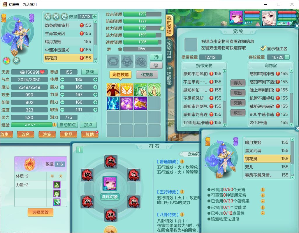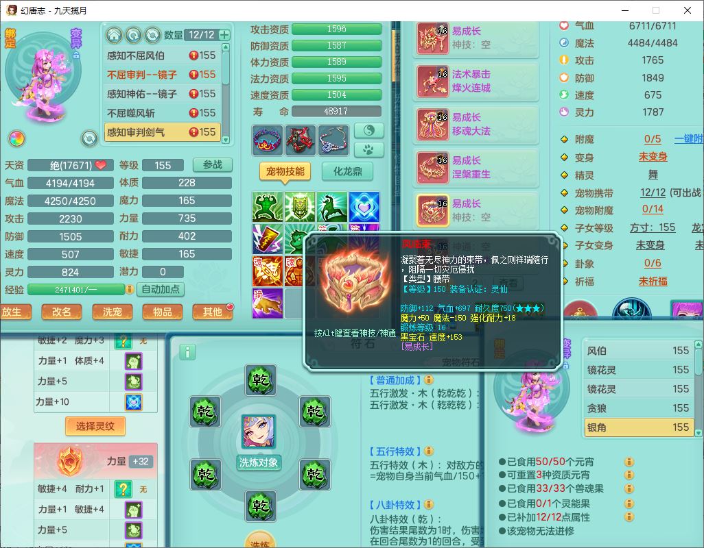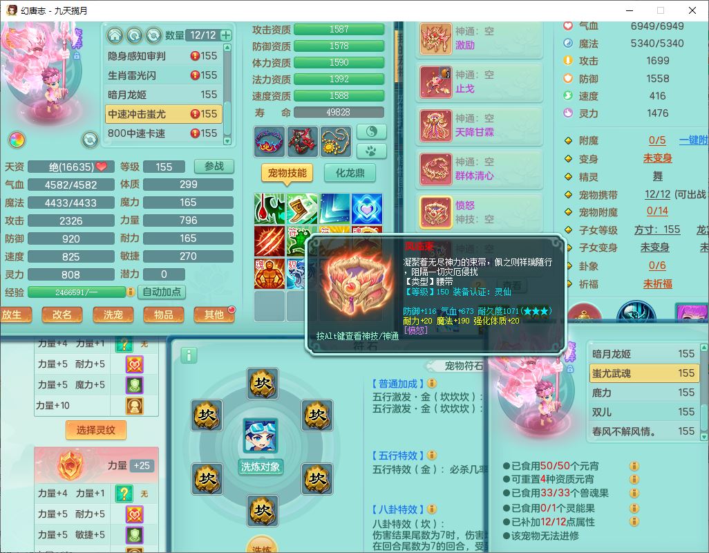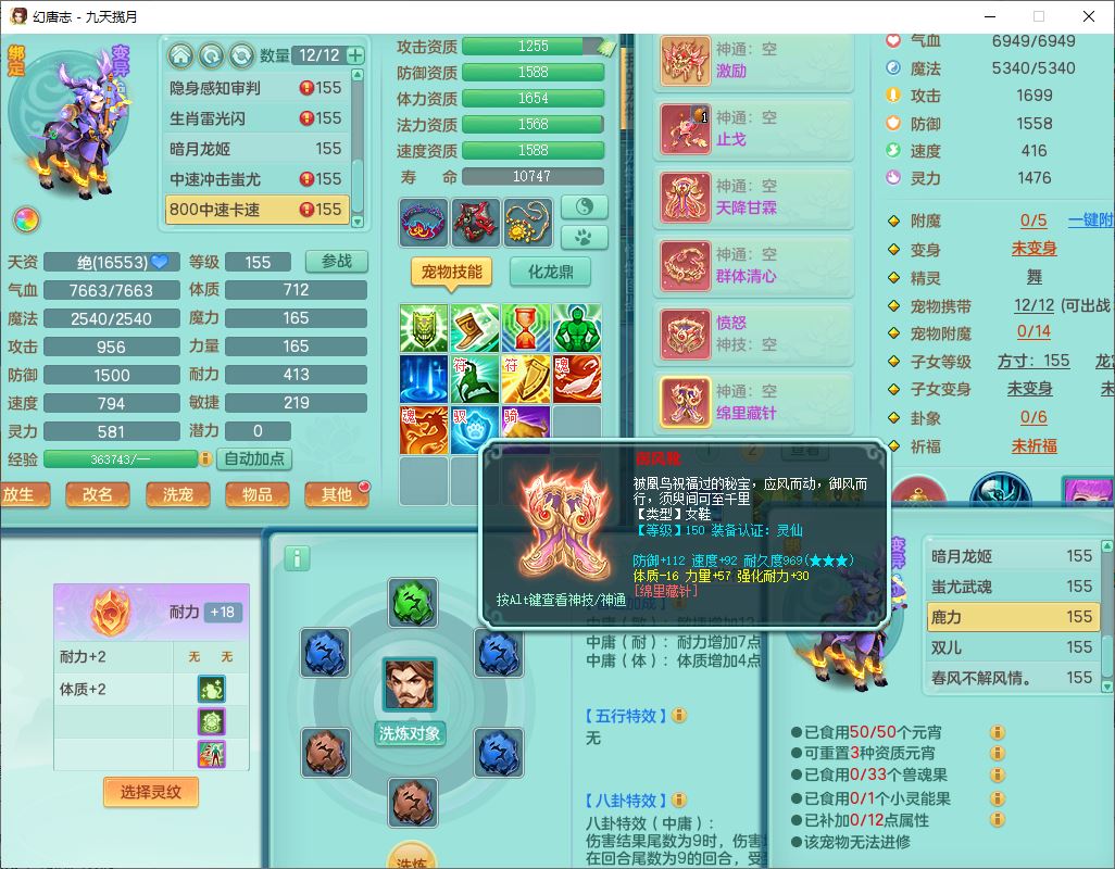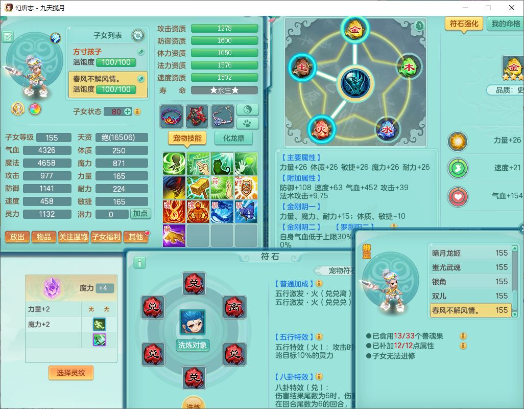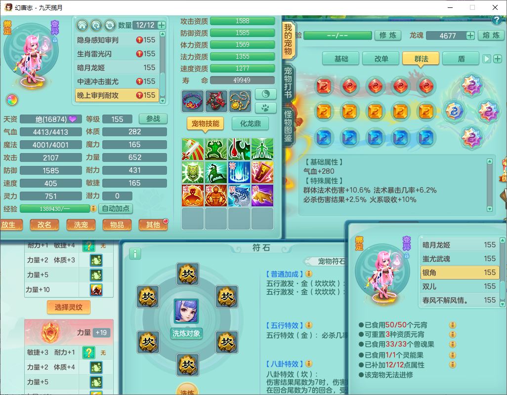 4381九天揽月159女魔王【潜龙号】精灵舞,1内1望归3镜花1龙姬1特殊兽决(琴音),8觉醒4宠皮7六字1五字10四字14只满果子,9红装备,法爆烽火武器,Y移魂衣服,Y慈航项链,五雷鞋子,一套辅助装备,鼎5.5+70+280,庭院153,56个仙兽灵,1双人飞行坐骑
