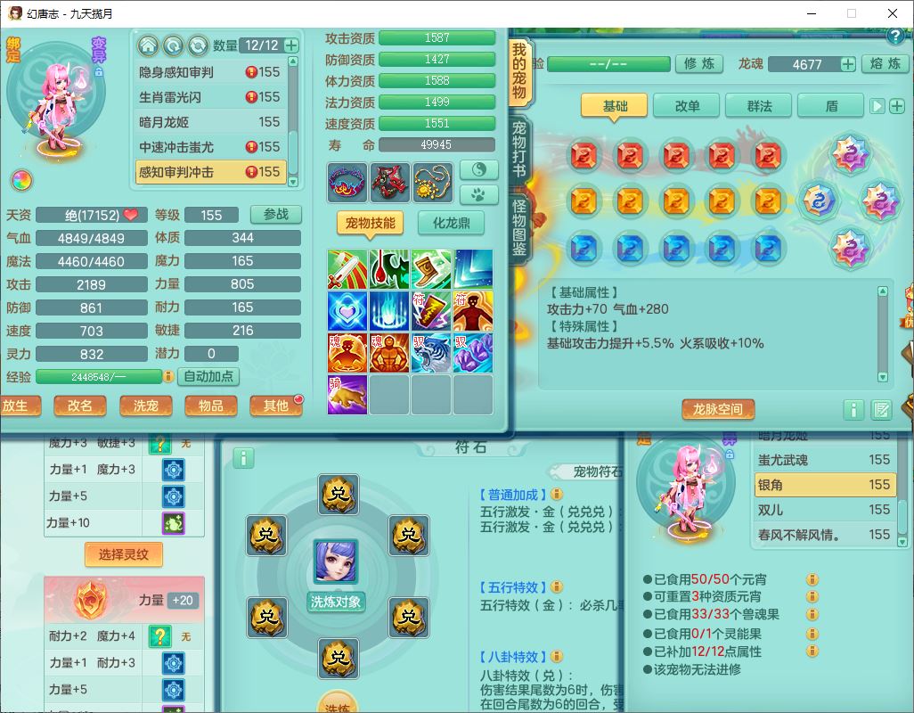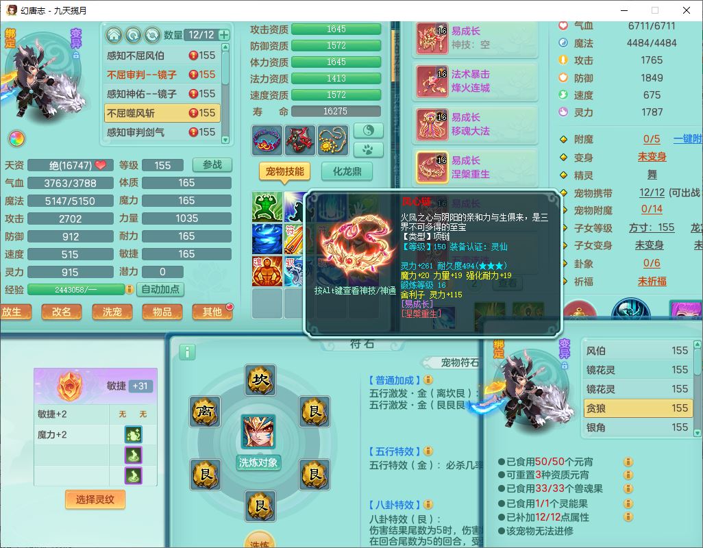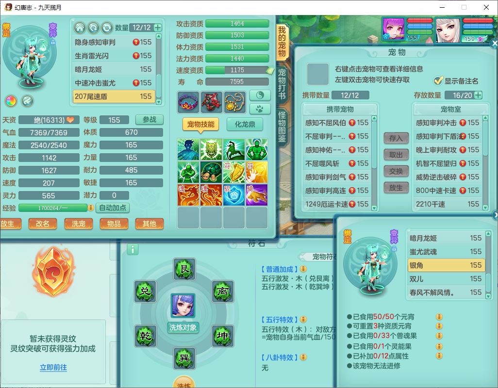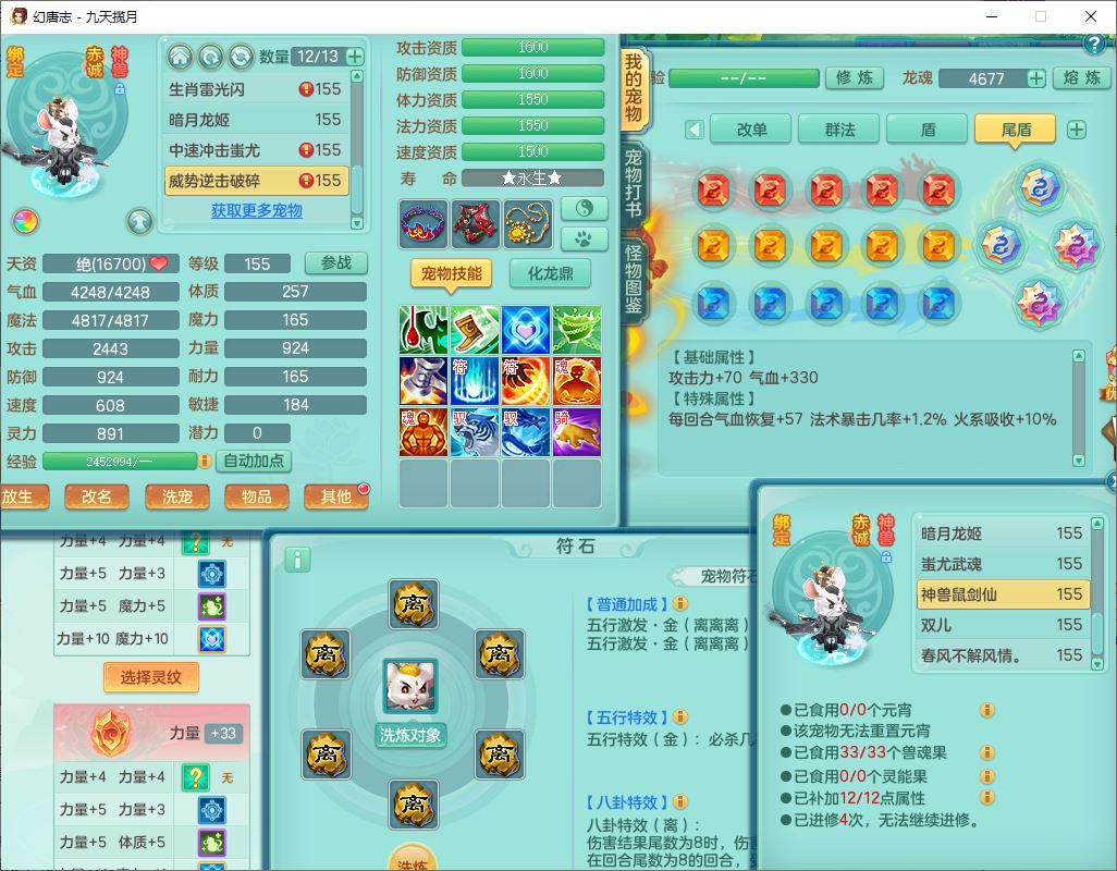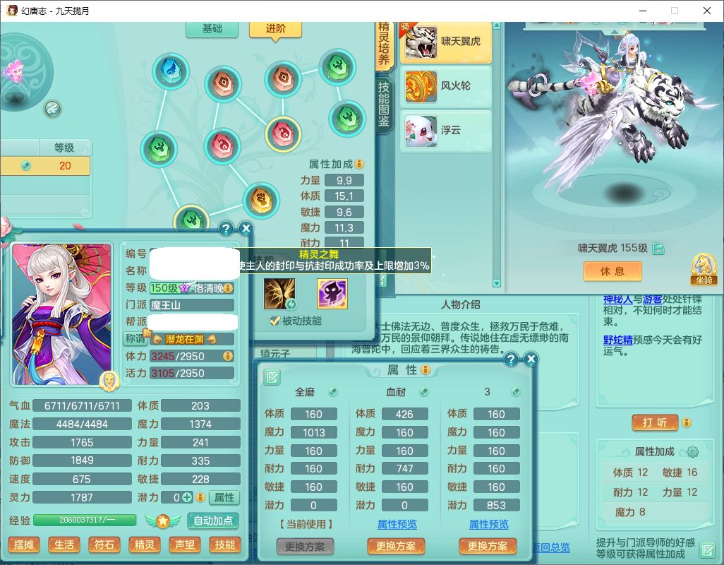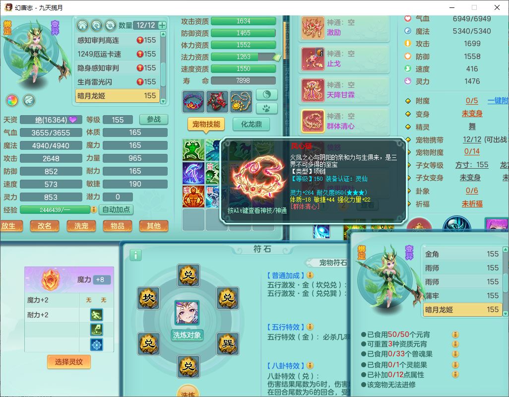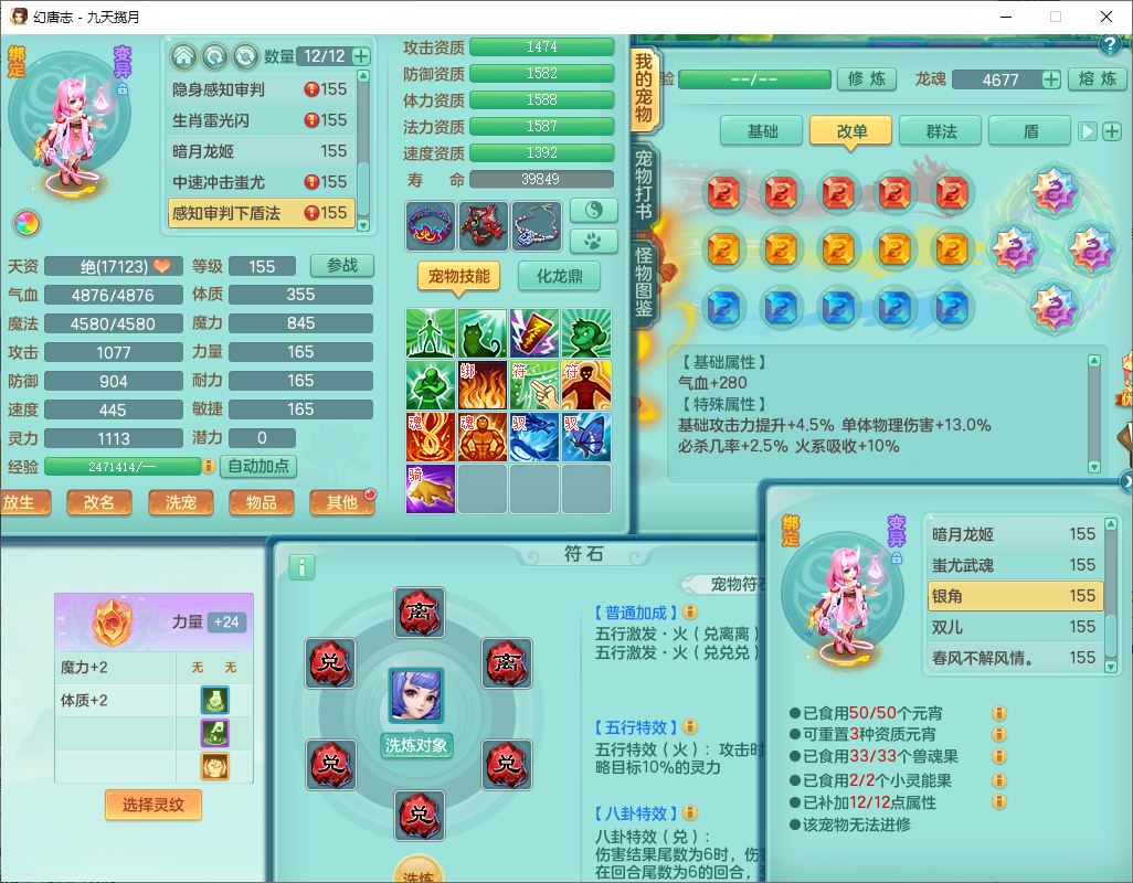4381九天揽月159女魔王【潜龙号】精灵舞,1内1望归3镜花1龙姬1特殊兽决(琴音),8觉醒4宠皮7六字1五字10四字14只满果子,9红装备,法爆烽火武器,Y移魂衣服,Y慈航项链,五雷鞋子,一套辅助装备,鼎5.5+70+280,庭院153,56个仙兽灵,1双人飞行坐骑