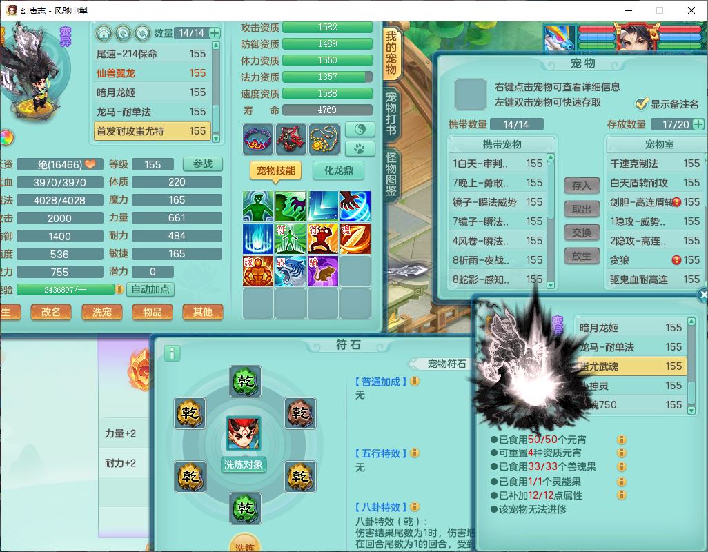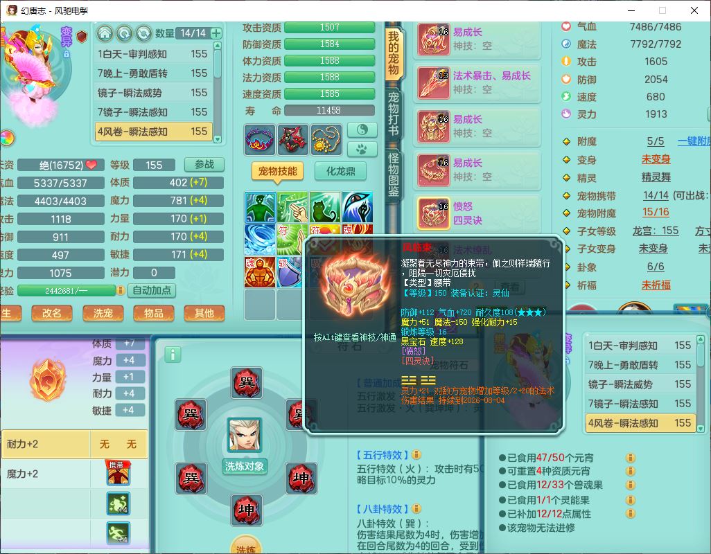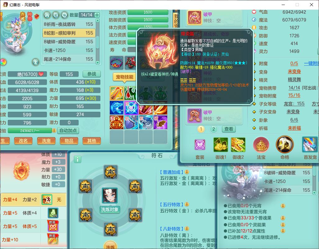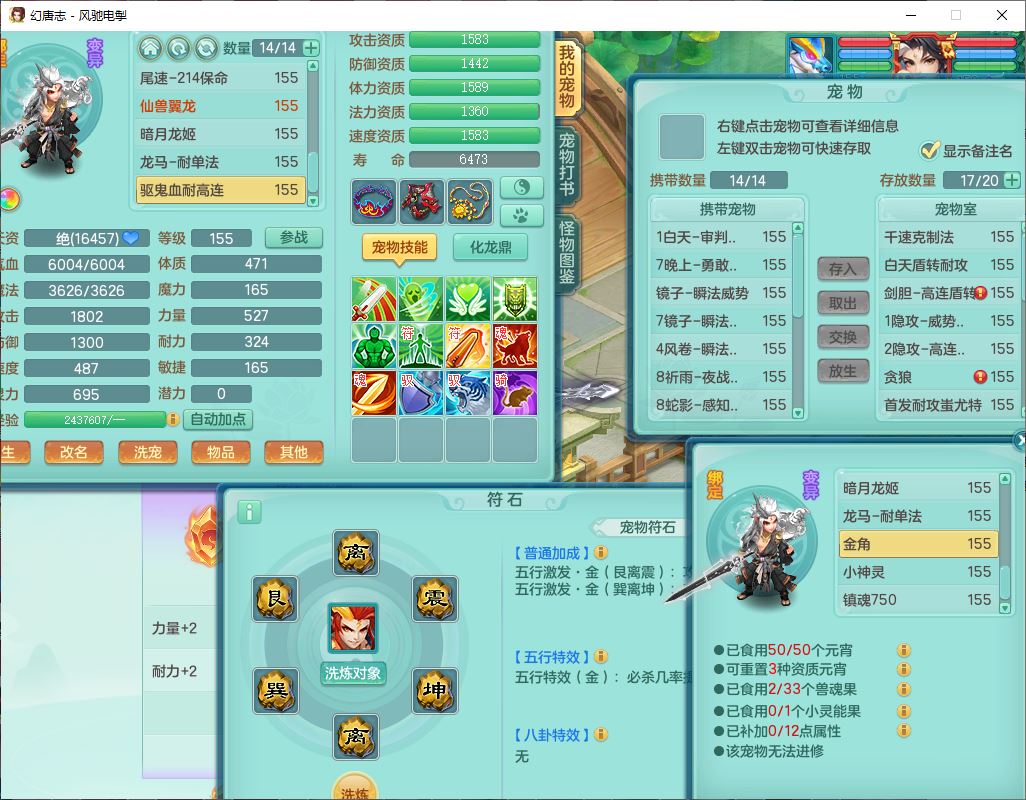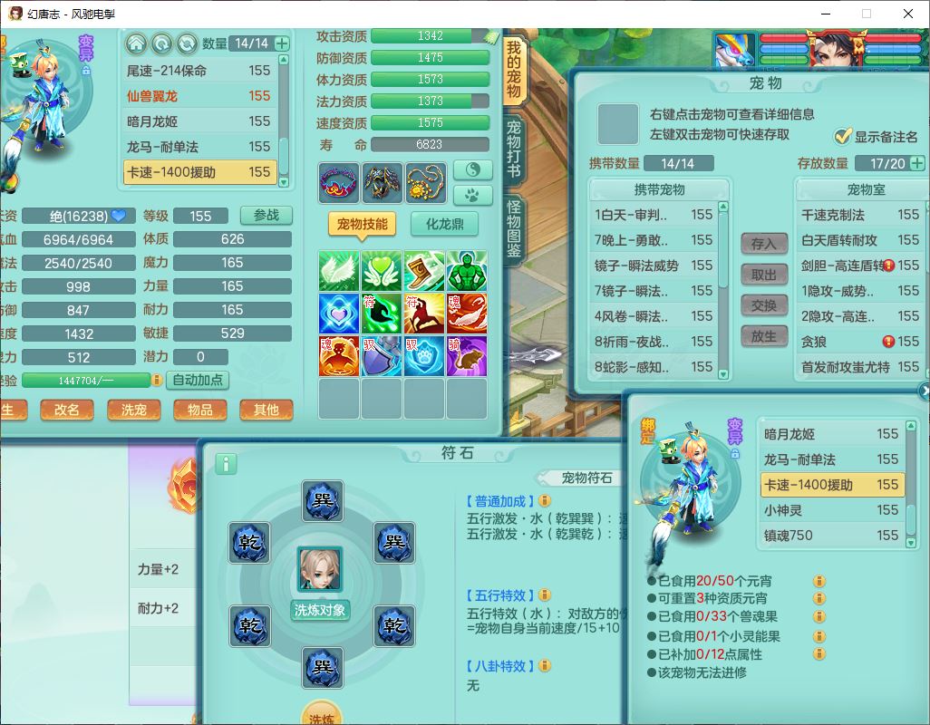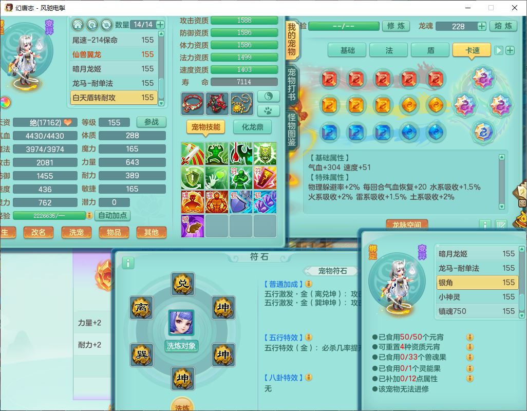62443风驰电掣159男龙宫精灵舞,2龙(无内,1换)2内(1青蛇1龙马)1望归3镜花3特殊(风卷、破碎、剑胆)1龙姬,4觉醒2六字3五字11四字10只满果子,全单加9红星辰之拥装备,法爆Y武器,271Y项链,愤怒四灵腰带,法缭晶清鞋子,一套8红双破甲物理装备,破甲帽子、鞋子,Y疾速武器,神佑项链,鼎4.5,永久外观、精灵皮肤,15个内丹碎片,1飞行坐骑