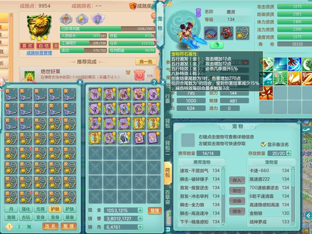 L22392任剑逍遥129男龙宫,精灵歌,1龙没内,2内胆神,6只觉醒,8宠皮,714法爆烽火单加45武器,212双红易成长驾驭术单加41链子,4.0基础鼎,9个纯六字,4个五字,17只满果子,宠排在榜,3只坐骑。