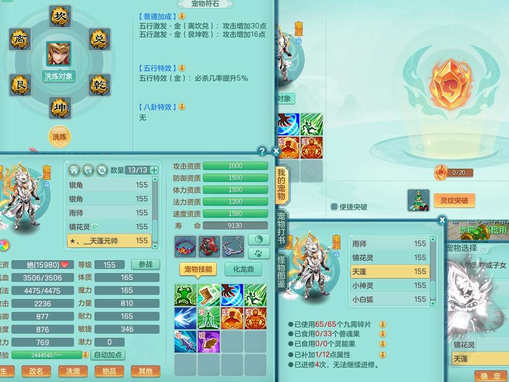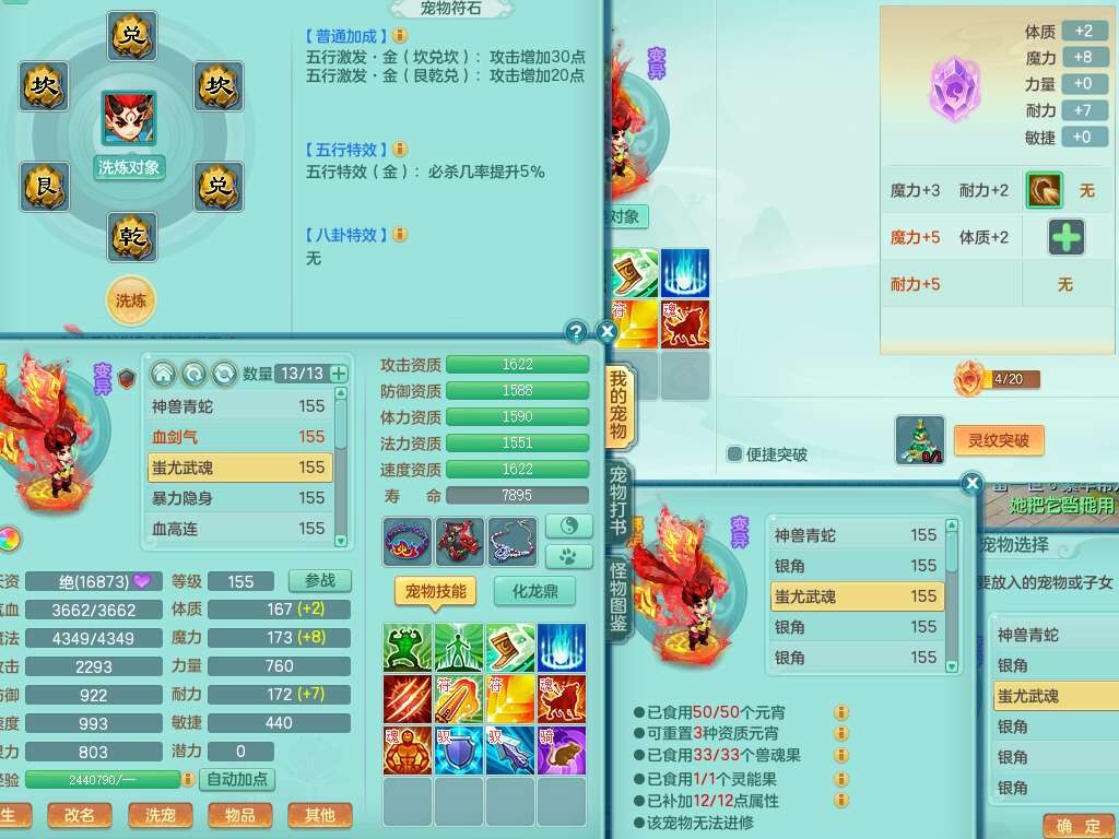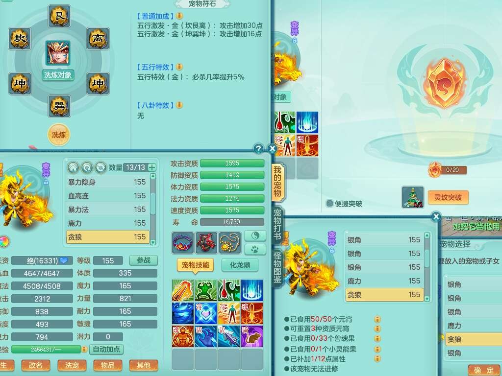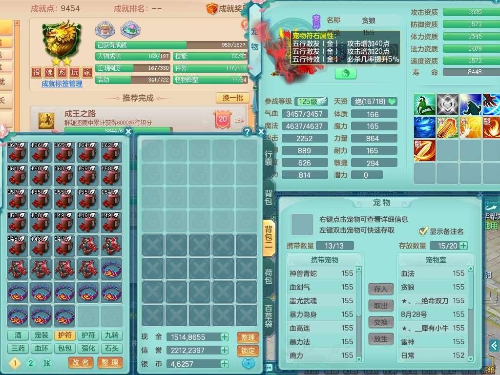 S22388风华绝代159男龙宫,精灵歌,1内胆神,1特殊(月光),击退单加56武器,有928法暴单加55武器,易成长单加56衣服,易成长激励单加52鞋子,4.5基础鼎,综合4只满果子。