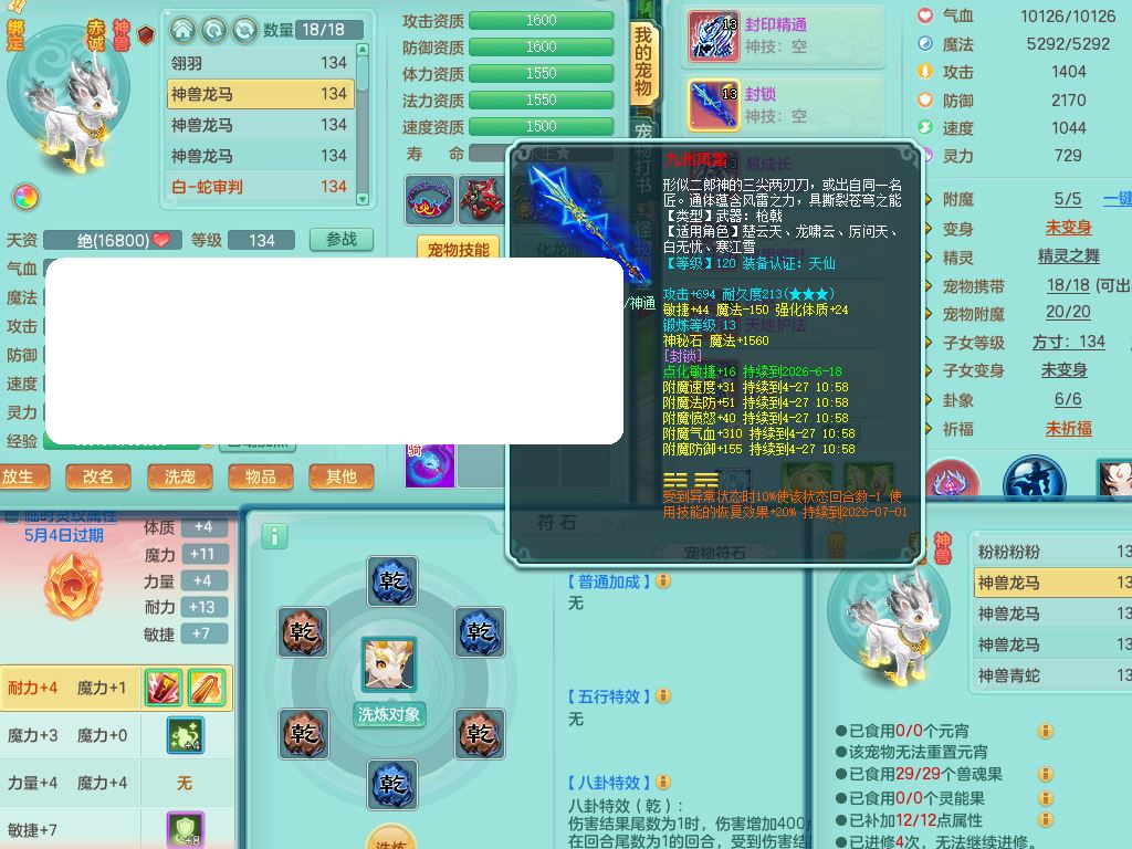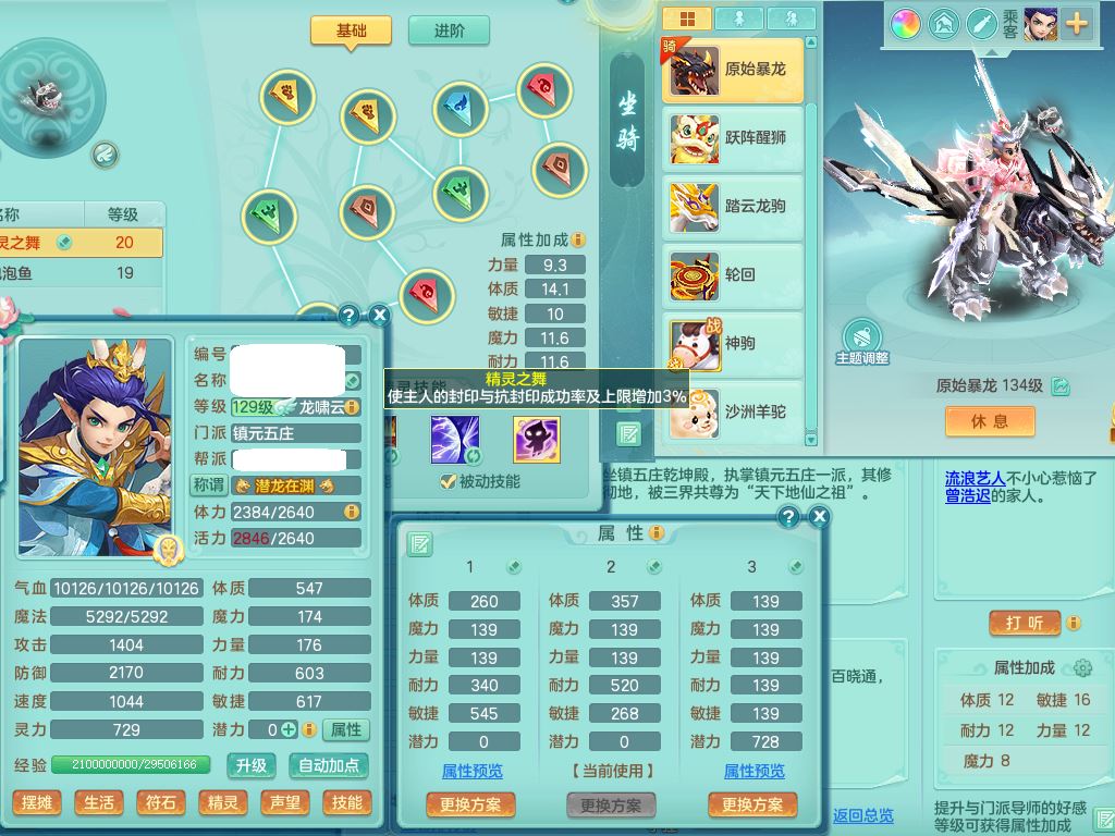 52699九天揽月129男五庄【潜龙号+龙皮+神驹心想事成+暴龙泰坦+西瓜冰】精灵舞,8字靓号,8龙(换)2龙皮5内(2蛇3马)9破境10宠皮(2幻灵果),18格子32只满果子13觉醒25个纯6字(1洗练珠),9红,封锁武器,封印头,Y晶清衣服,愤怒罗汉腰带,Y止戈鞋,物理701必杀崩山武器,强壮Y破血衣服,破甲头,鼎4.5+56+224,2套符石,永久外观精灵皮肤,4503金币,80多果子,69内丹碎片,6坐骑(4只双人)带永久称谓