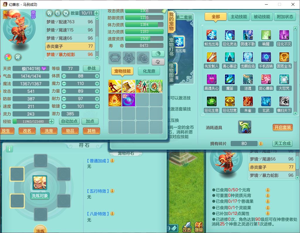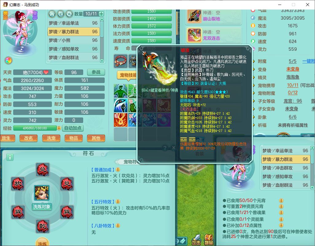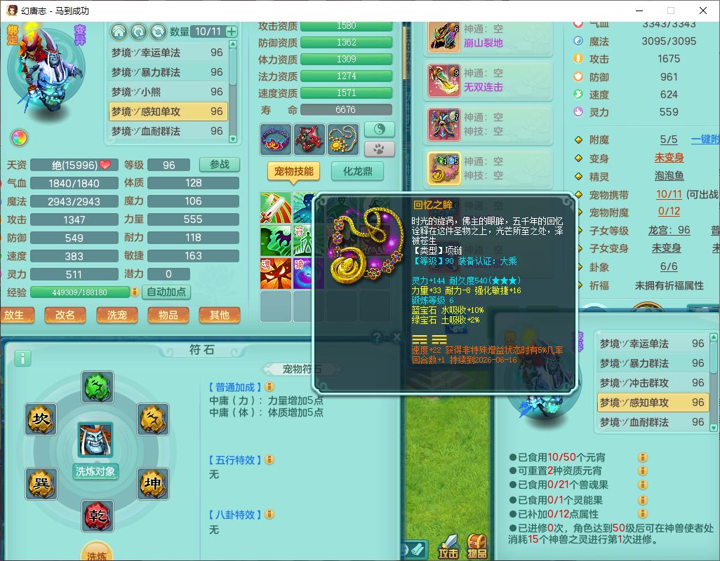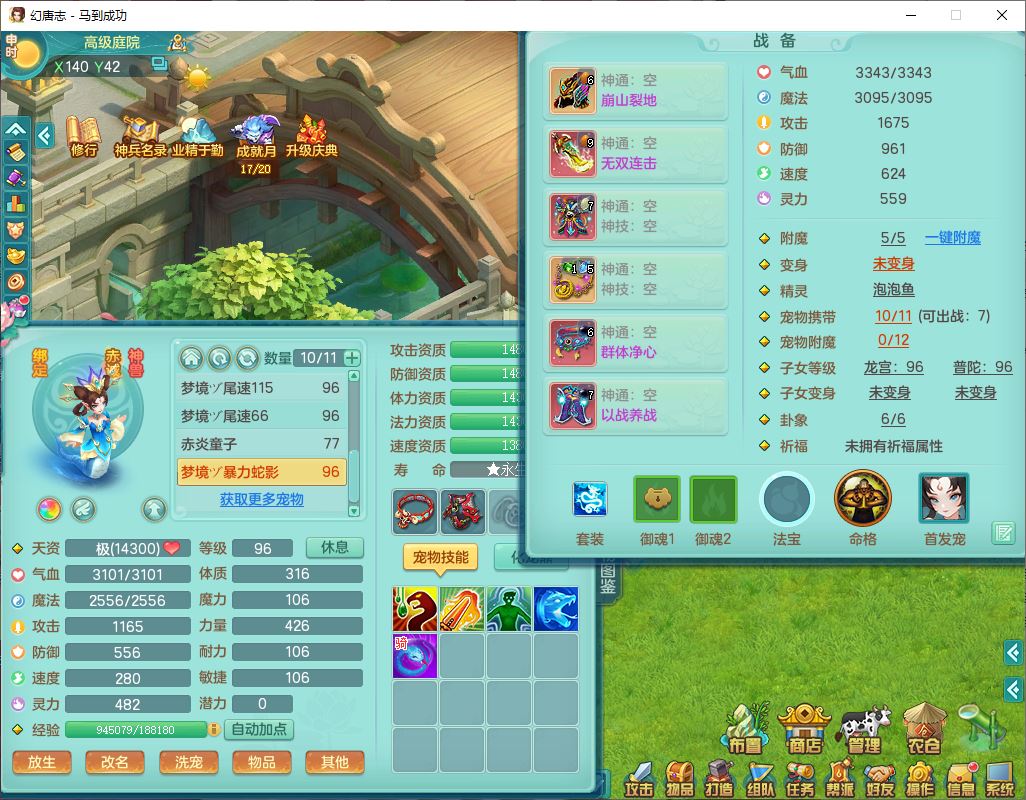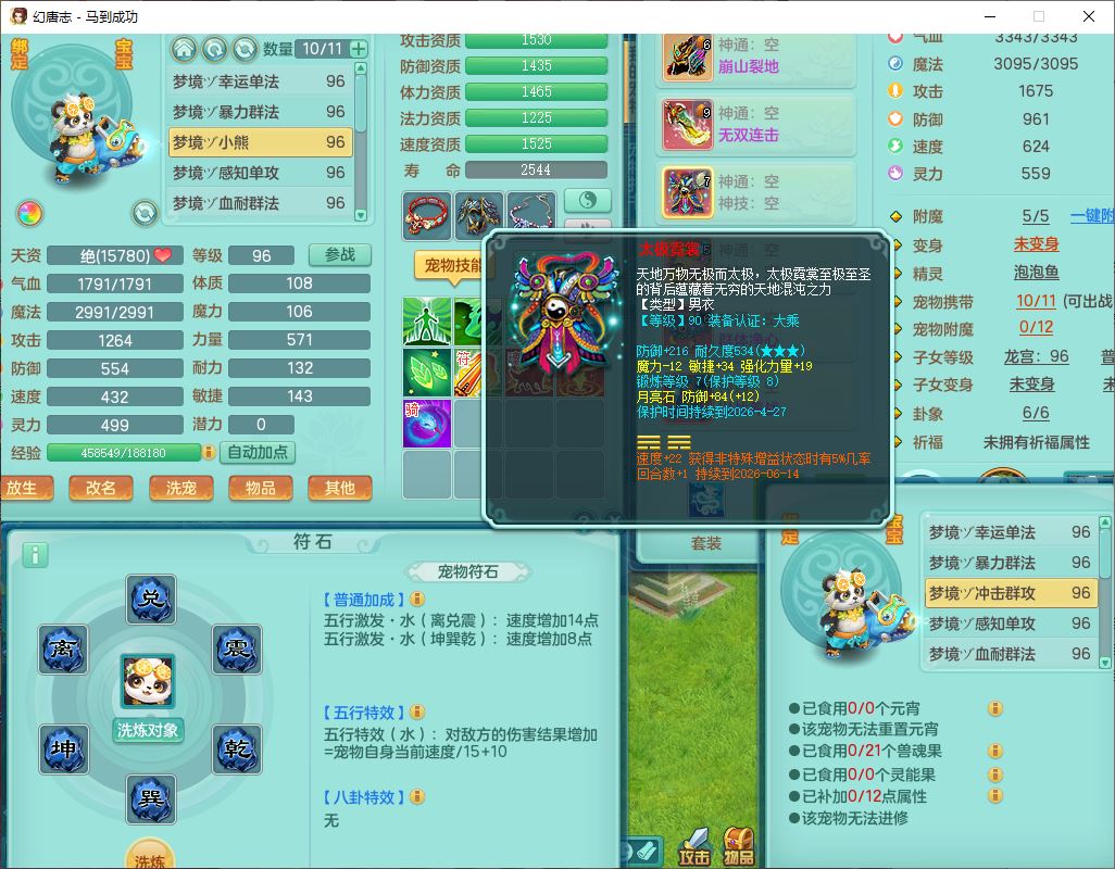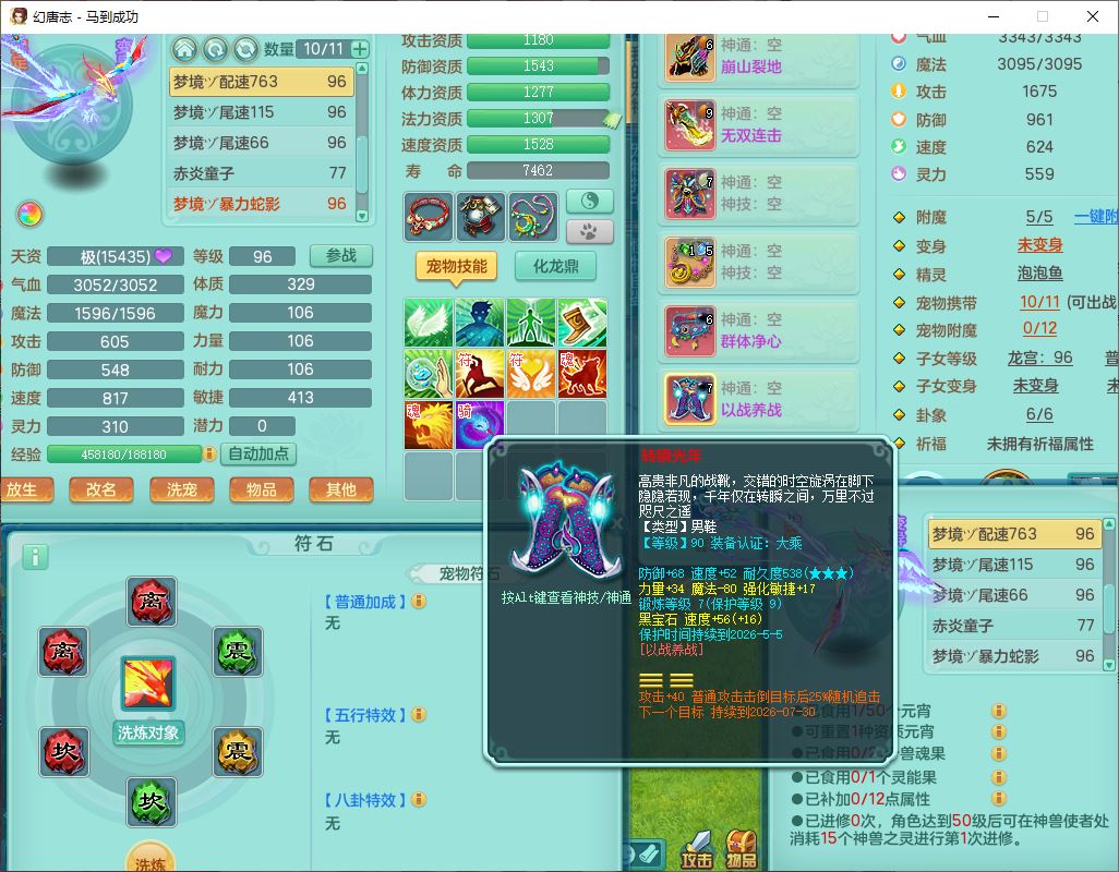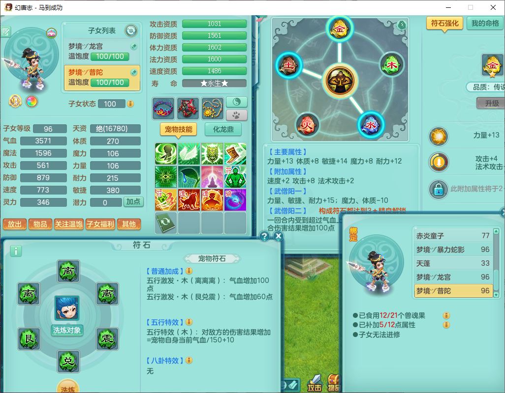 99801马到成功91男无名体敏耐精灵,2神兽无内(1龙马1青蛇)1金炉1童子,七只成品满高书宝宝,2孩子(龙宫+普陀),装备齐全,破血武器,崩山帽子,以战鞋子,蛟龙五件套,142天月卡,6个内丹碎片,成就、宠排在榜,有时装头像,1双人飞行坐骑,带双重可换绑