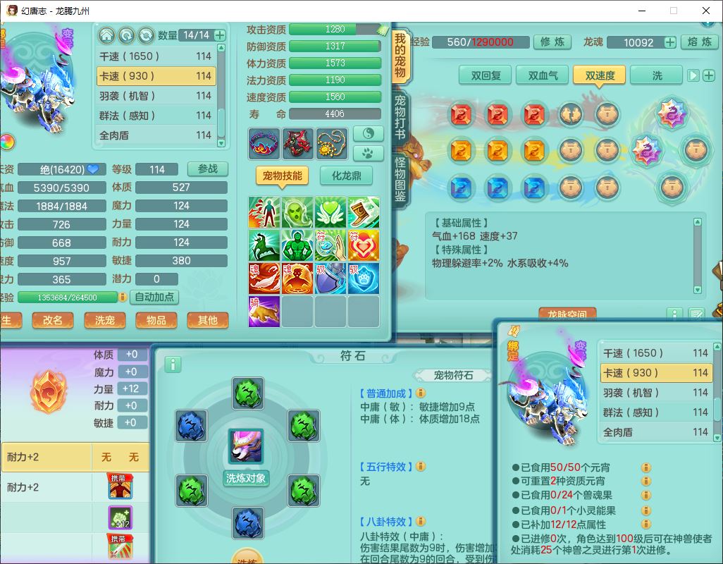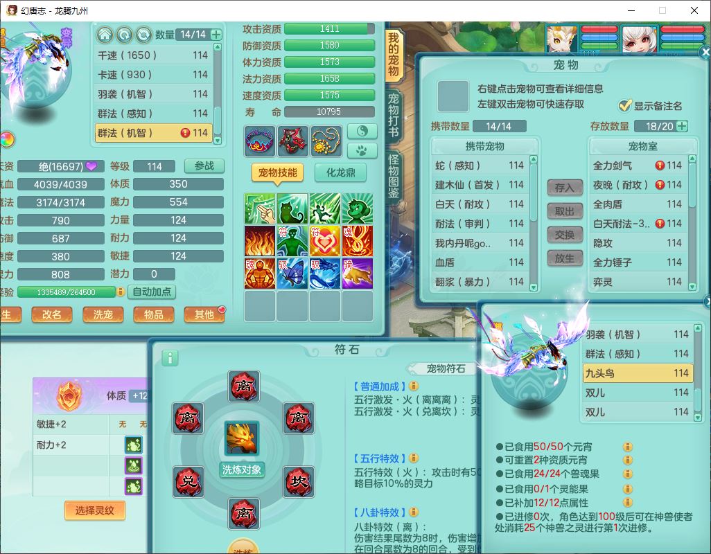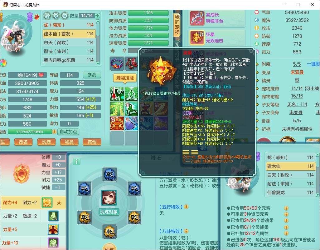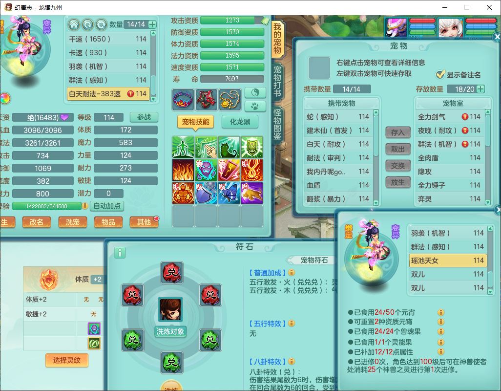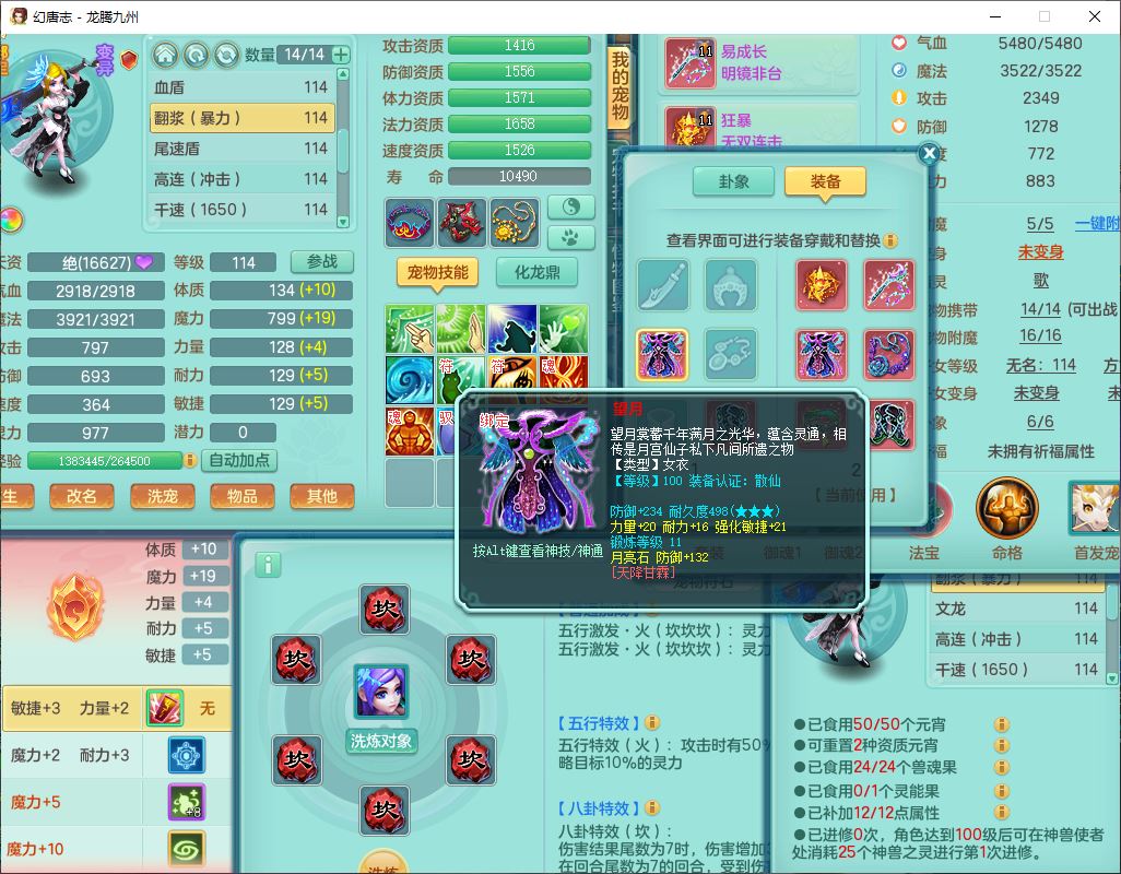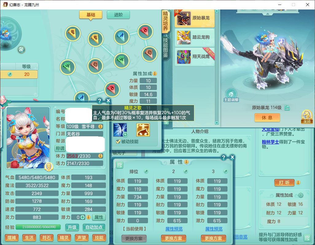 24354龙腾九州109女无名【潜龙号+暴龙洪荒】精灵歌,1龙(换、无内)1内丹龙马(破境)1建木1飞羽2羽袭,8觉醒1宠皮7六字9四字18只满果子,11红装备,Y明镜帽子,狂暴破血武器,幸运9激励衣服,神佑晶清项链,愤怒Y腰带,幸运4四海鞋子,鼎3.0+42+168,2套符石,57天月卡,永久头饰、精灵皮肤,31个内丹碎片,1双人坐骑