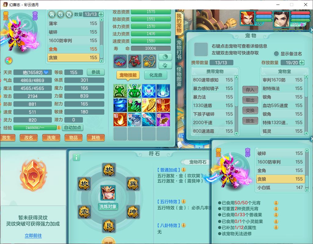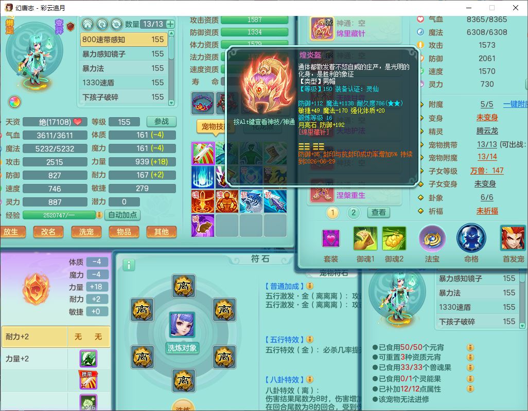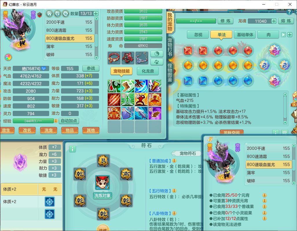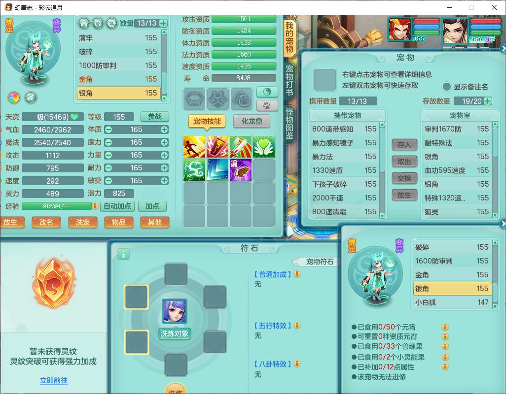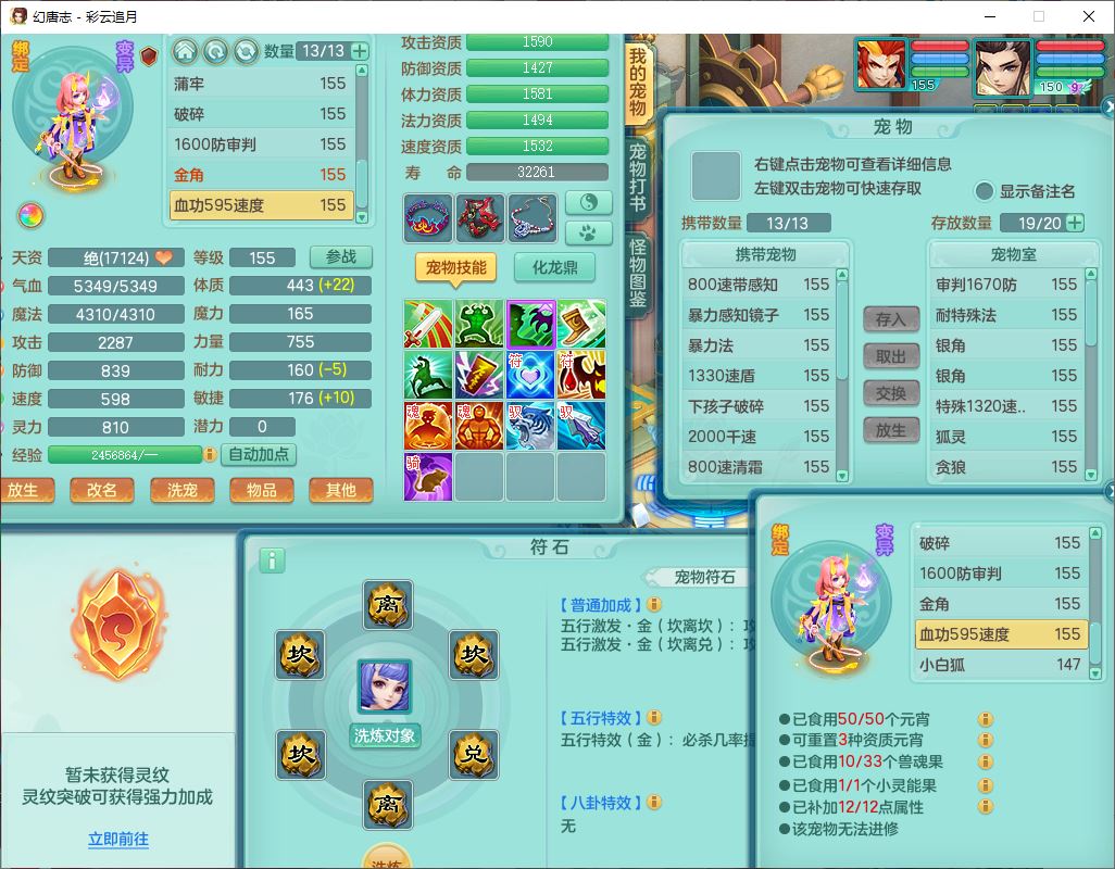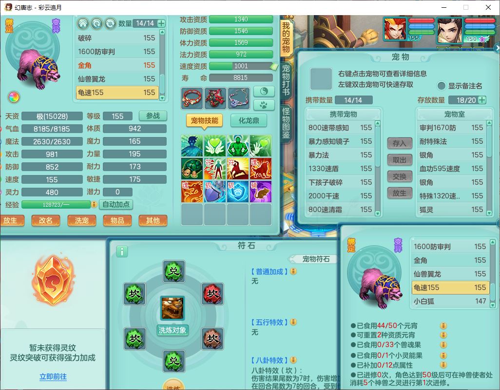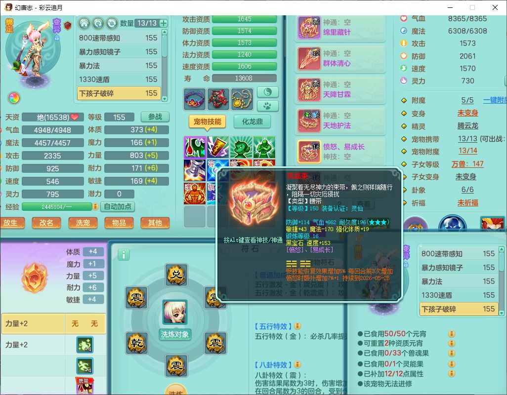 24347彩云追月159男方寸精灵舞,1龙(换,无内)1内1望归1镜花灵2特殊(烈焰,兽决虎虎),1觉醒2宠皮(1幻灵果)2六字10四字综合8只满果子,7红装备,愤怒Y腰带,鼎5.5+70,庭院163,永久头饰,1山海烛龙坐骑