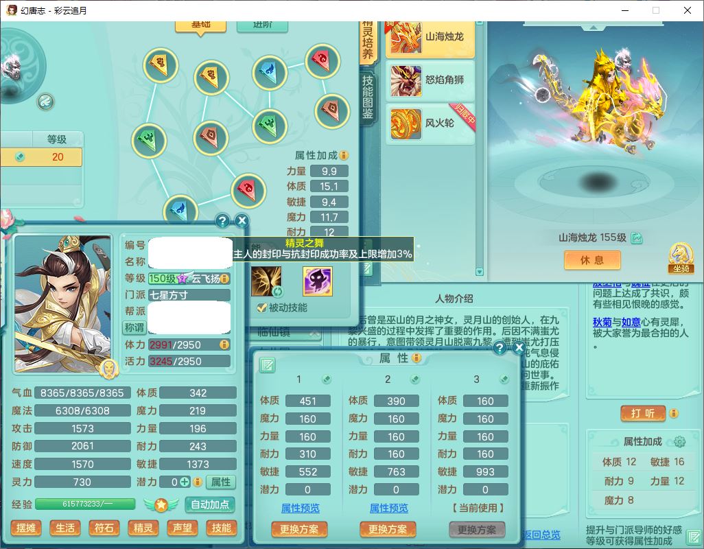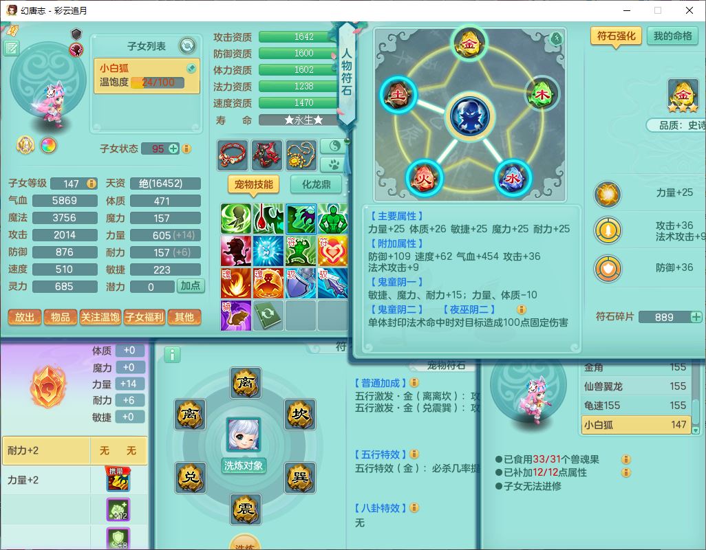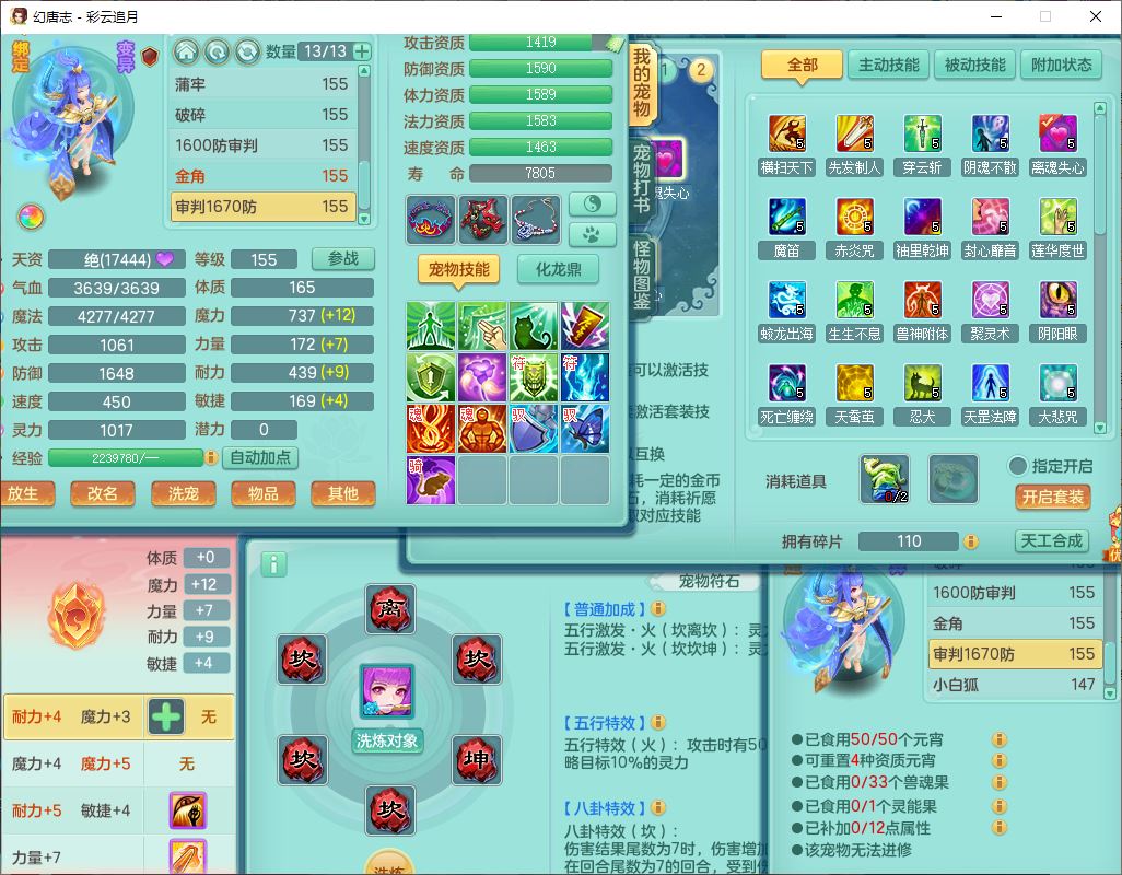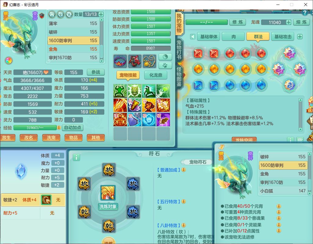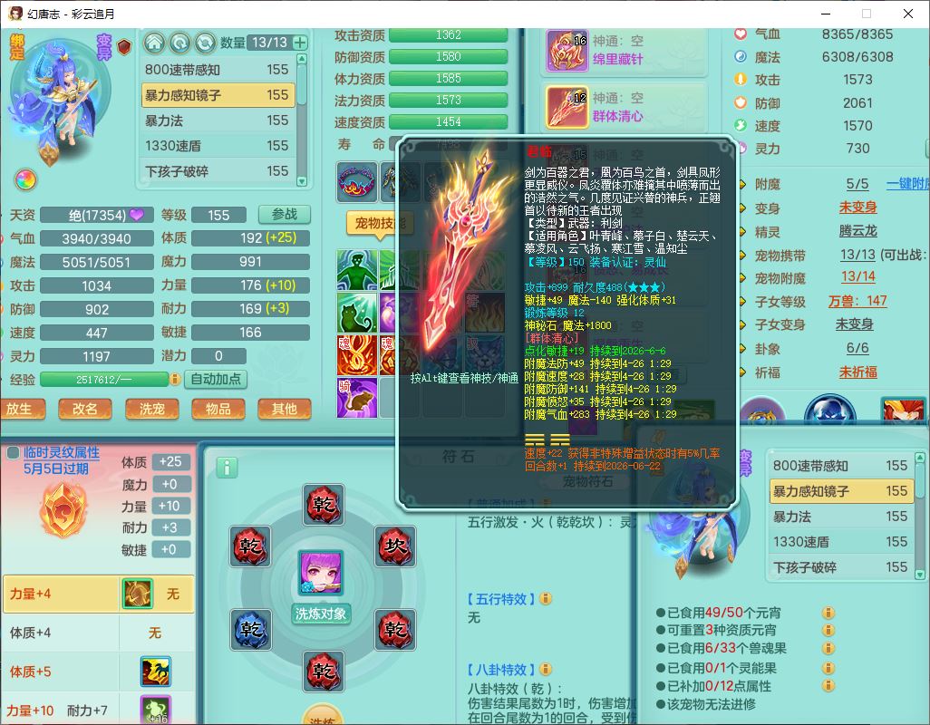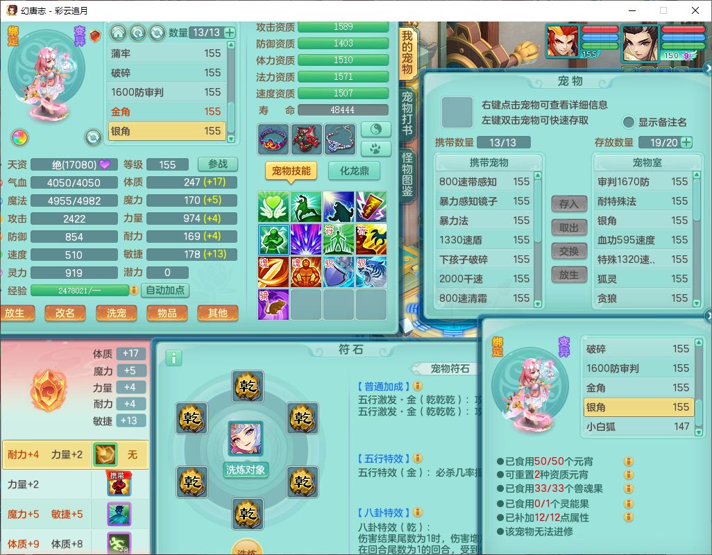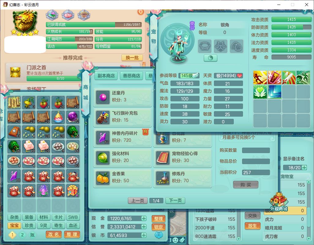 24347彩云追月159男方寸精灵舞,1龙(换,无内)1内1望归1镜花灵2特殊(烈焰,兽决虎虎),1觉醒2宠皮(1幻灵果)2六字10四字综合8只满果子,7红装备,愤怒Y腰带,鼎5.5+70,庭院163,永久头饰,1山海烛龙坐骑