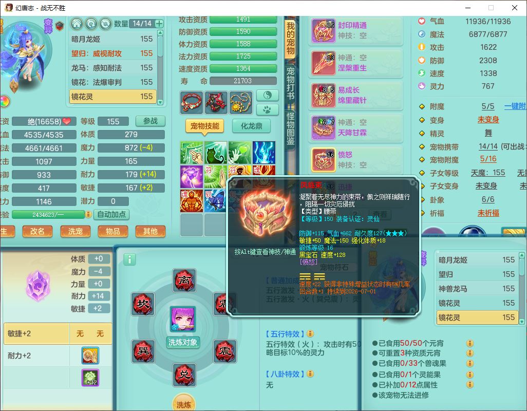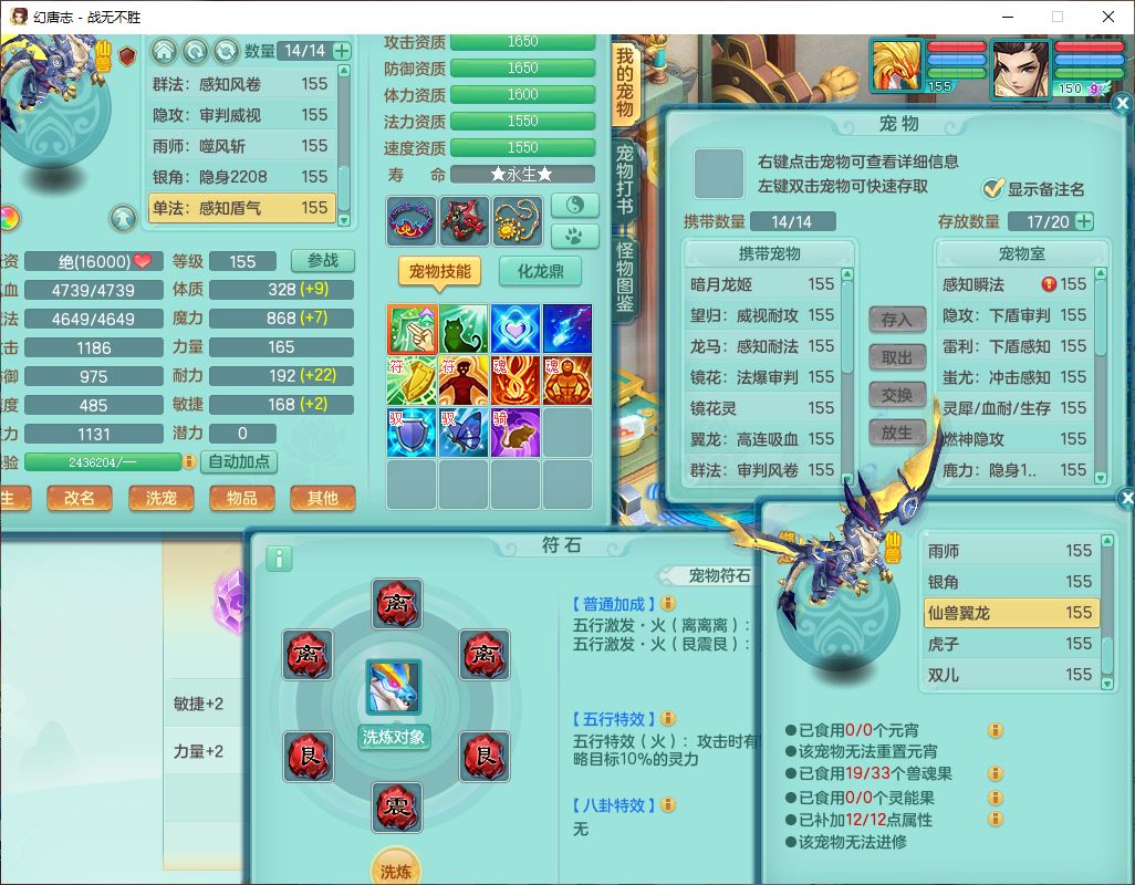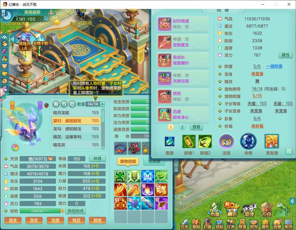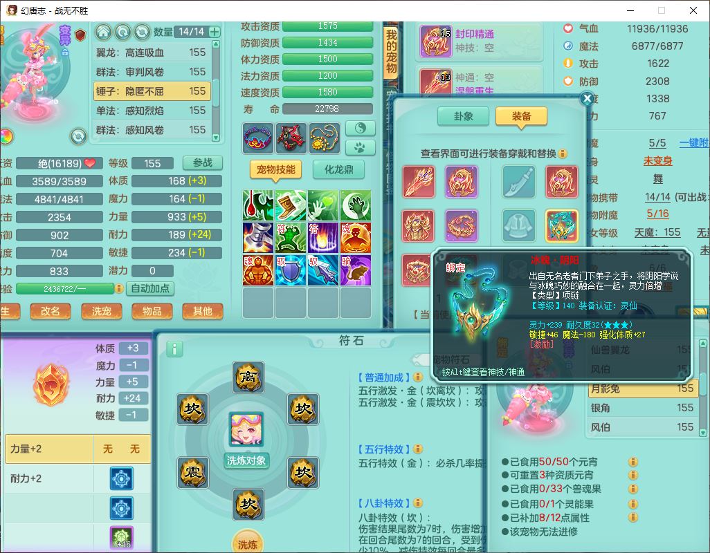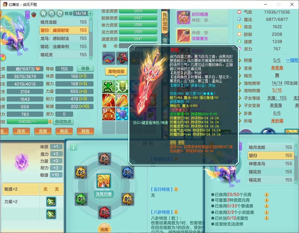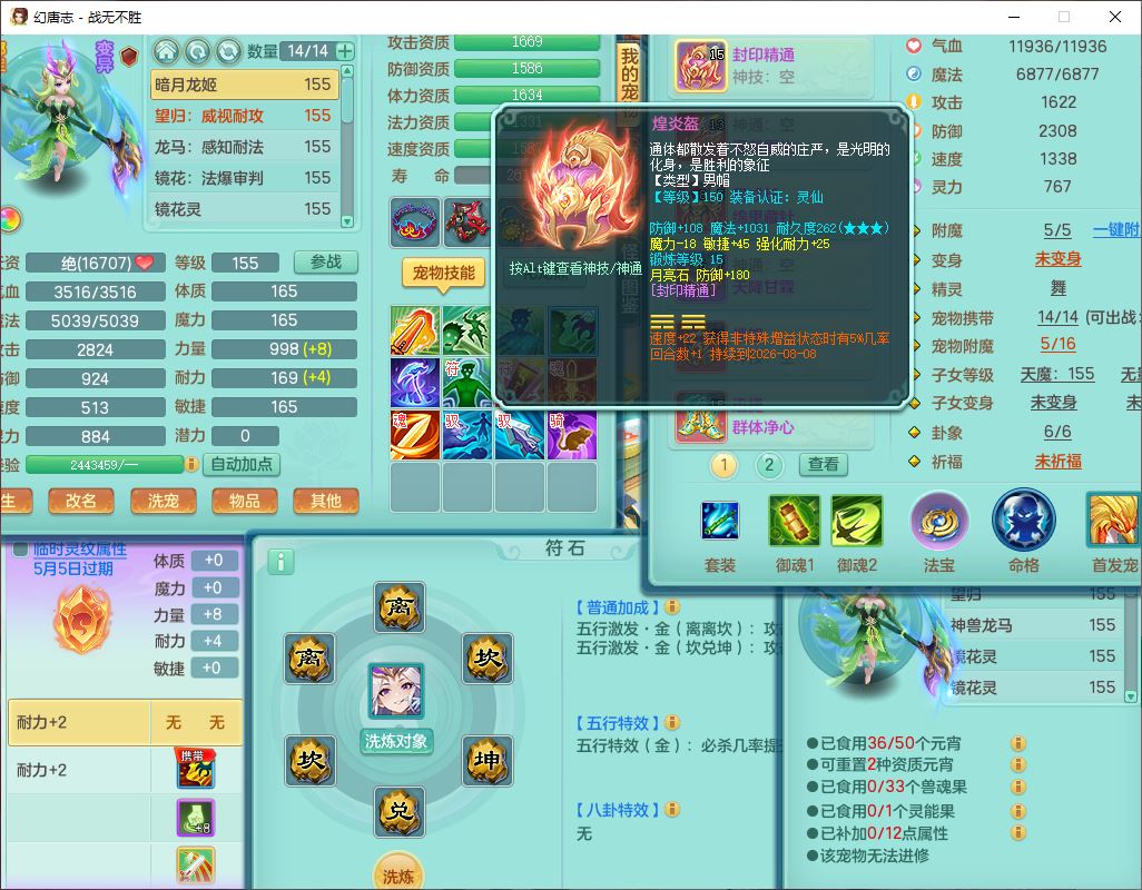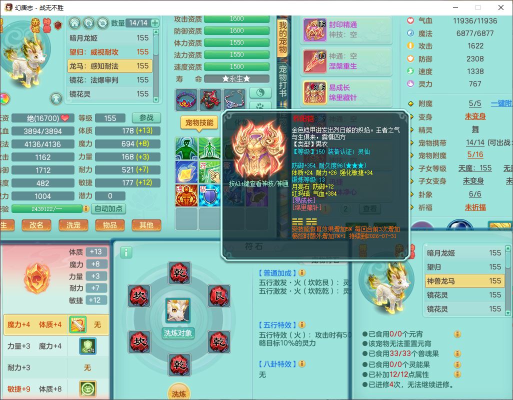 24338战无不胜159男天魔【暴龙逍客+西瓜冰】精灵舞,2龙(1换、无内)1望归1内丹龙马1龙姬2镜花2特殊(焚心、噬风),2觉醒3宠皮1六字1五字3四字,8红装备,封印精通帽子,Y笑里衣服,迅捷晶清鞋子,Y罗汉帽子,鼎5.0+70,永久外观、精灵皮肤,3双人坐骑
