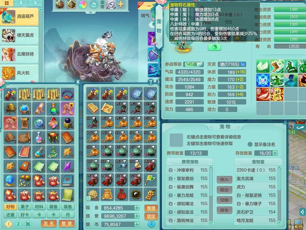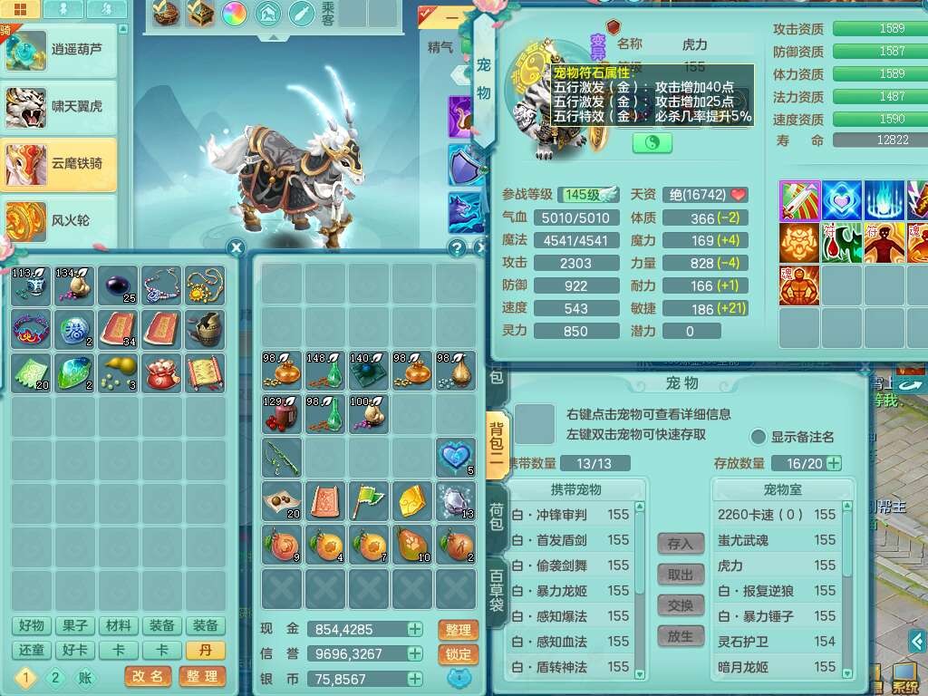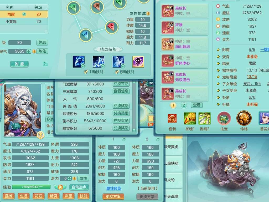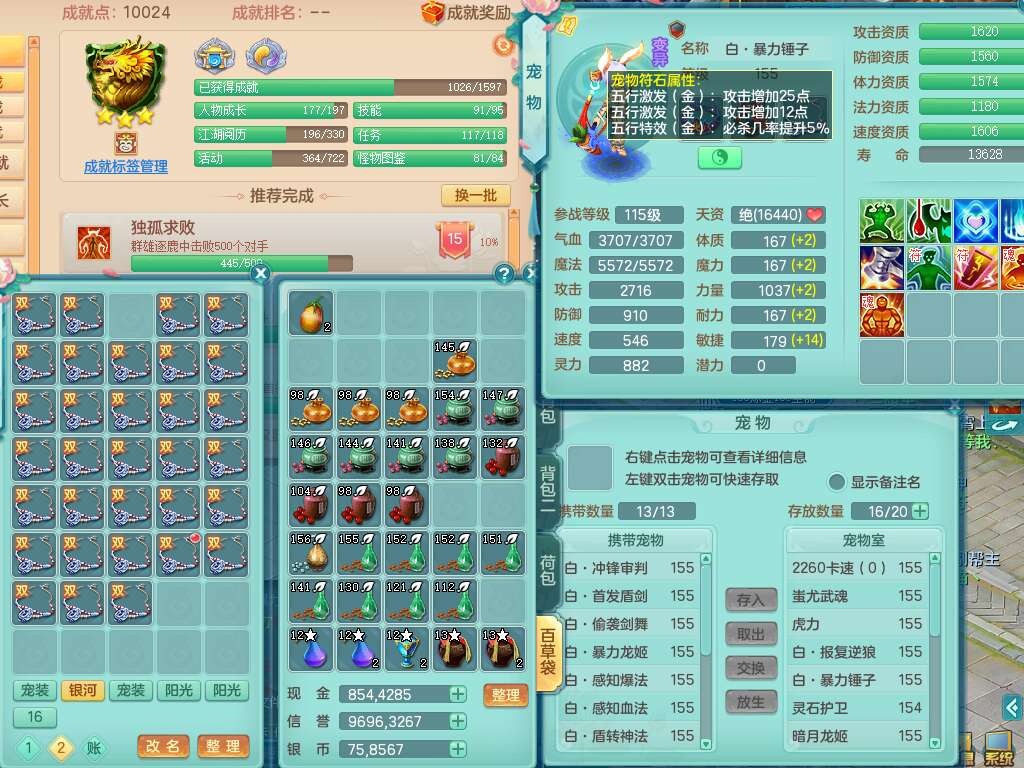 a22406扬名立万159男万兽,精灵舞,1内胆神青蛇,3只觉醒,3特殊(号角,青霜,烈焰),1只六技能龙姬,2只六技能镜花灵,934狂暴武器,崩山衣服,易成长破血单加腰带,易成长单加56头,易成长单加57鞋子,可玩法系封系,全部满宝石,封系封印四海头,封印慈航头,愤怒慈航腰带,回春群体止戈武器,封锁武器,5.5基础鼎+70攻+280血,2个纯六字,17只满果子,宠排在榜,3个双人坐骑,带133天月卡。