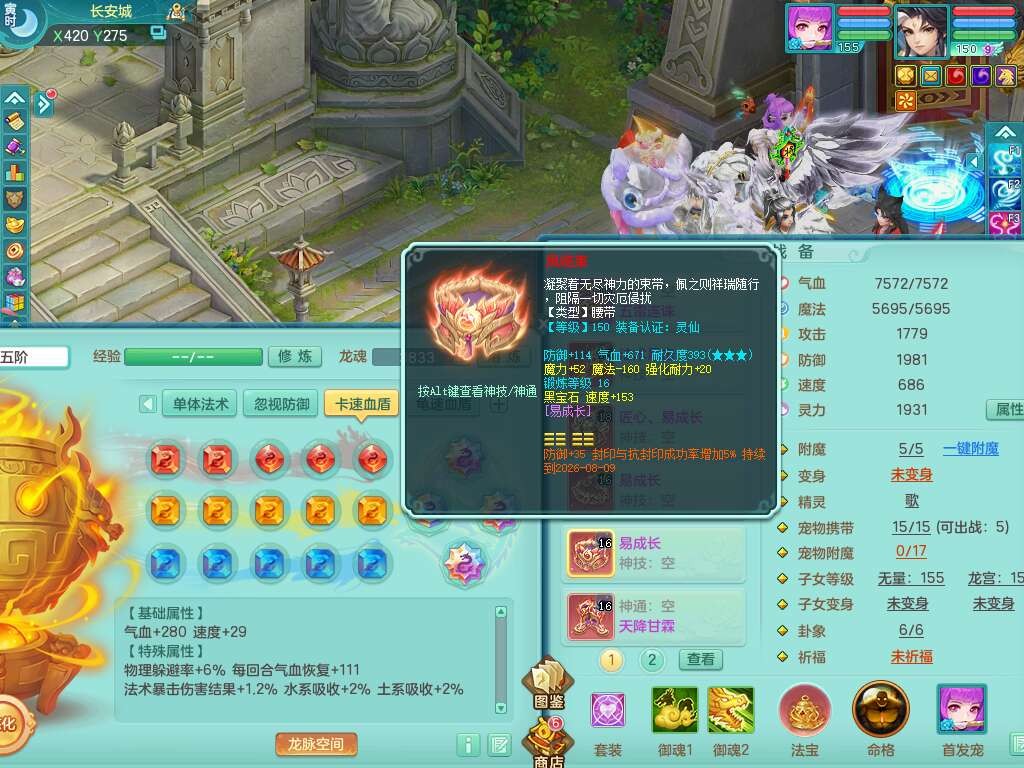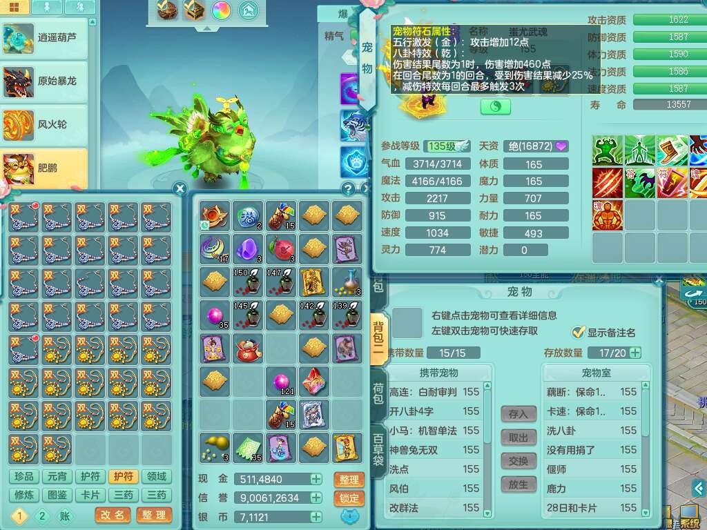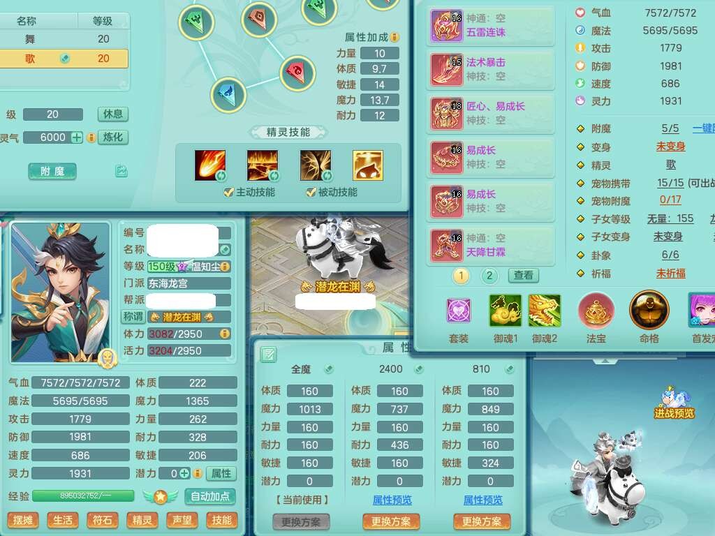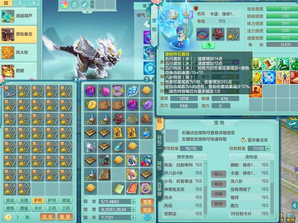 J22401今年勇159男龙宫,精灵歌+舞,2龙(1龙无内),准3内胆神(仓库47神兽内胆碎片),【8只觉醒,已潜龙】,4位靓号不含4,2宠皮+1幻灵果,2特殊(藕断,怒破),3只六技能镜花灵,1只六技能龙姬,五雷单加头,法爆单加57衣服,18段匠心易成长衣服,275易成长项链,四海单加52鞋子,有法缭鞋子,5.5基础鼎+70攻+280血,7个纯六字,1个五字,24只满果子,宠排在榜,4个孩子,4个坐骑,神驹马上发财+暴龙洪荒+西瓜冰武器,带86天月卡。