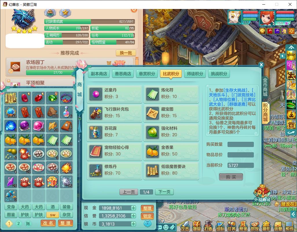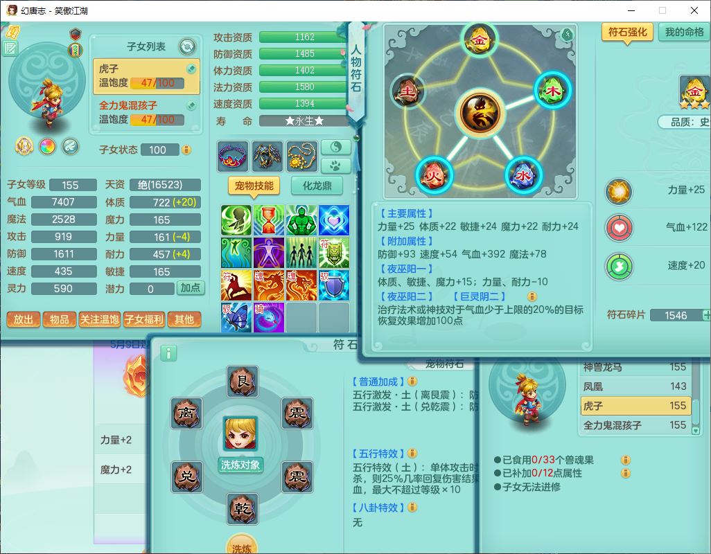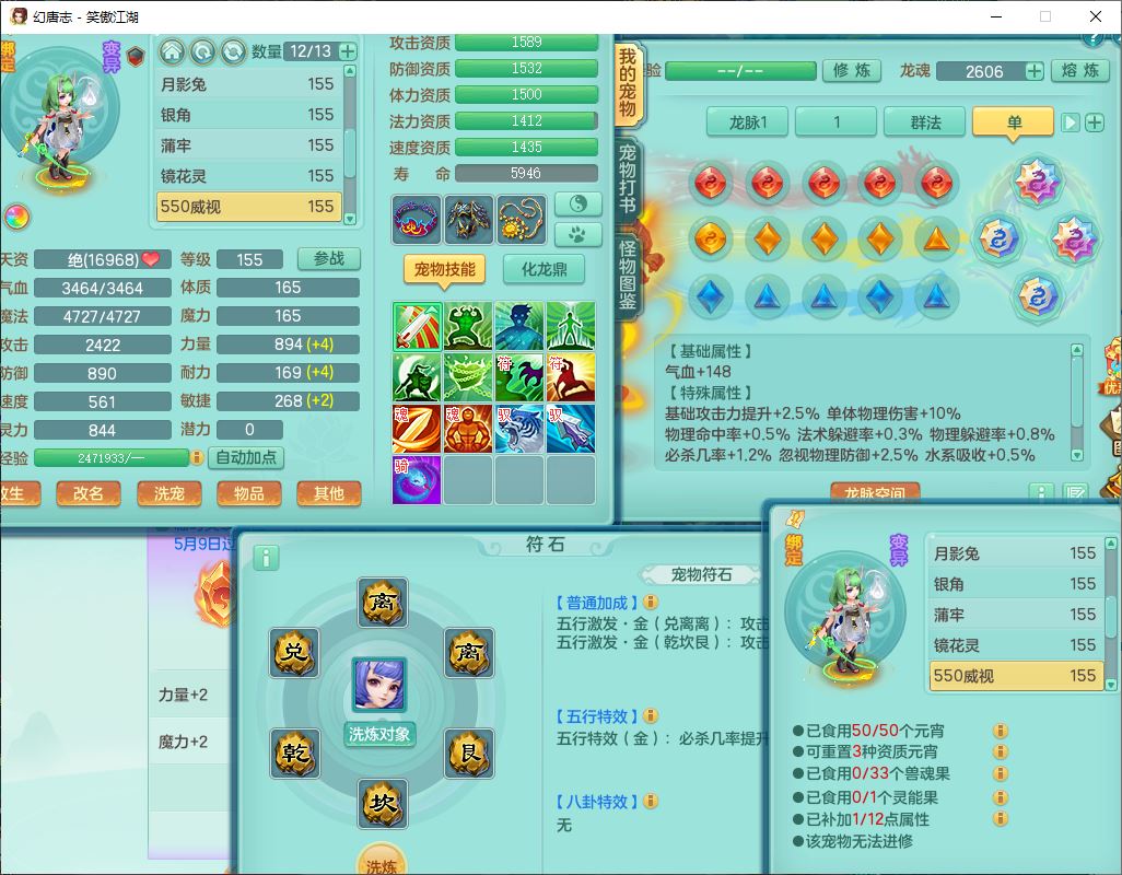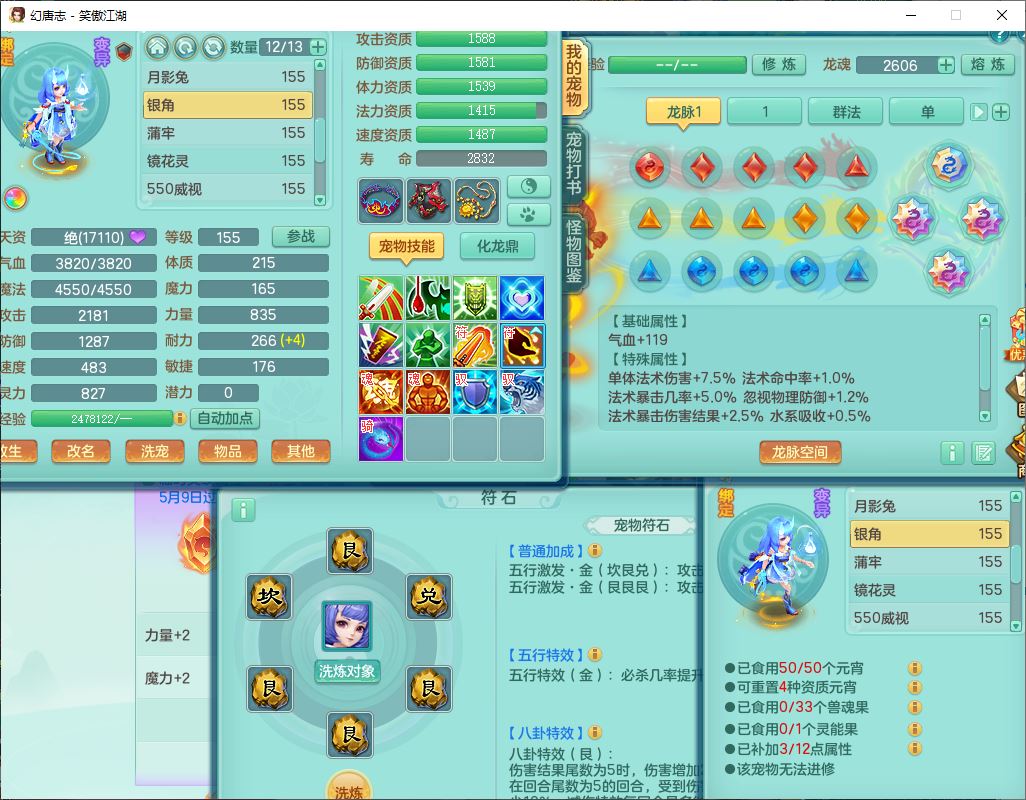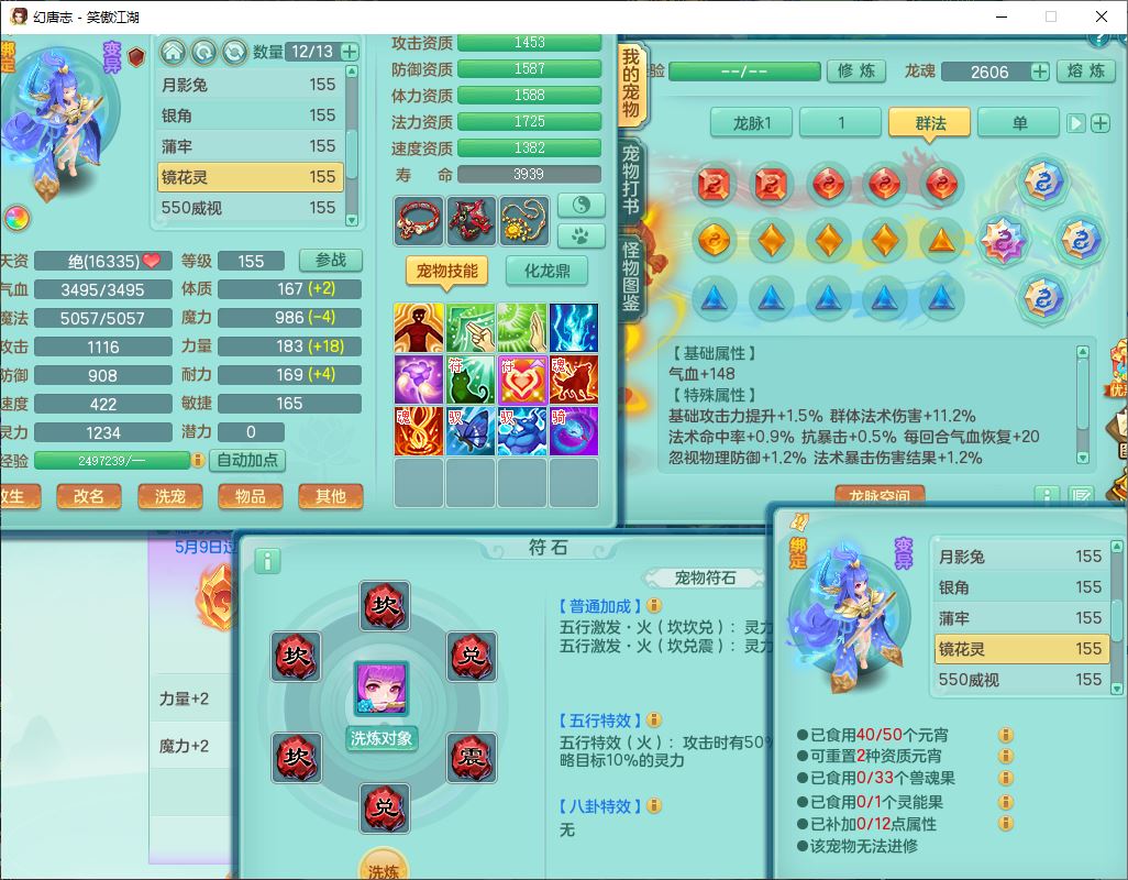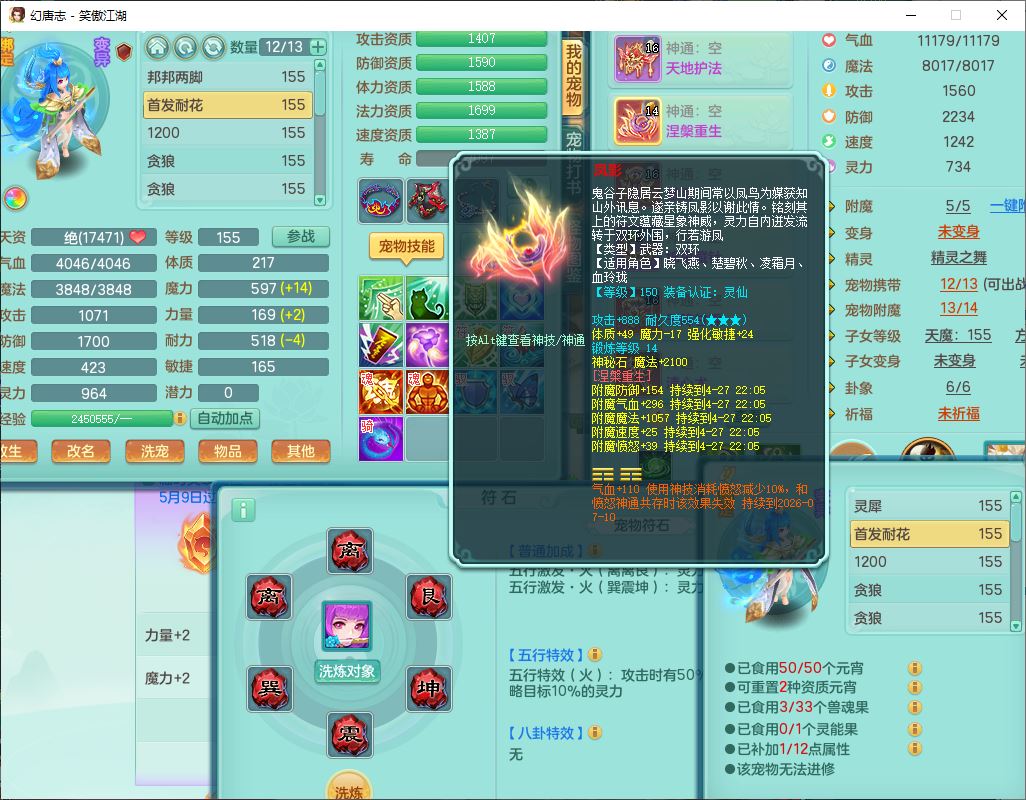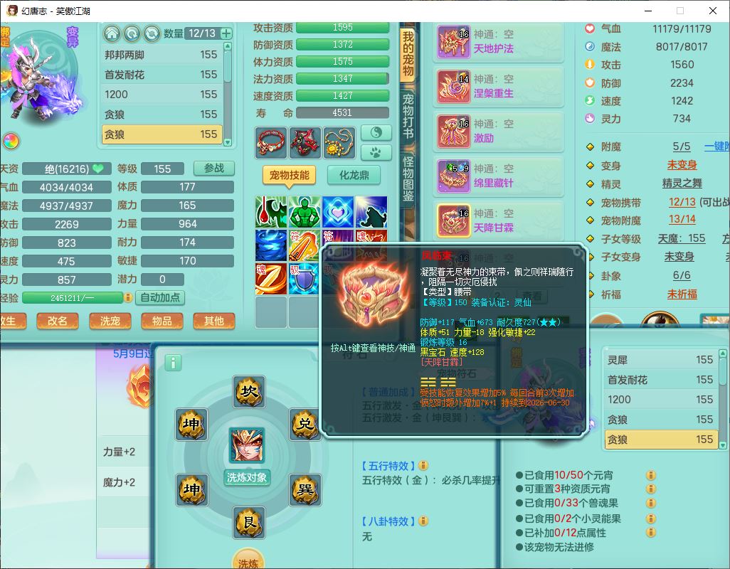 4385笑傲江湖159女无量精灵舞,1龙马(无内)2镜花,宝宝种类齐全,装备齐全,11个仙兽灵,25个内丹碎片