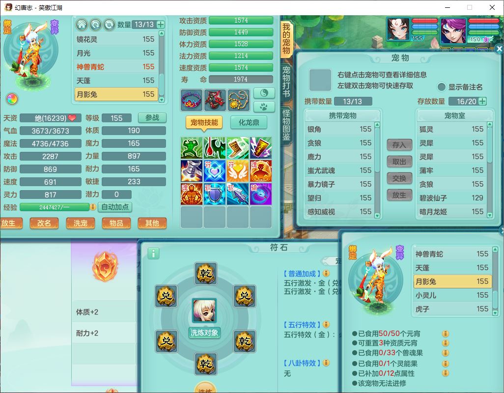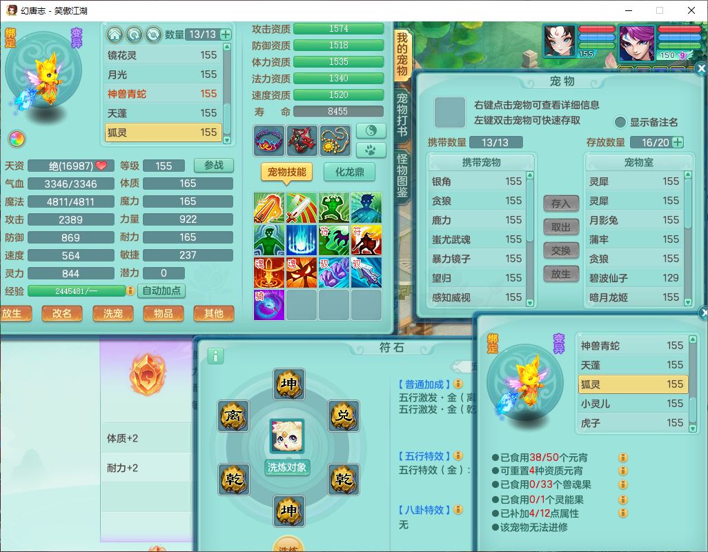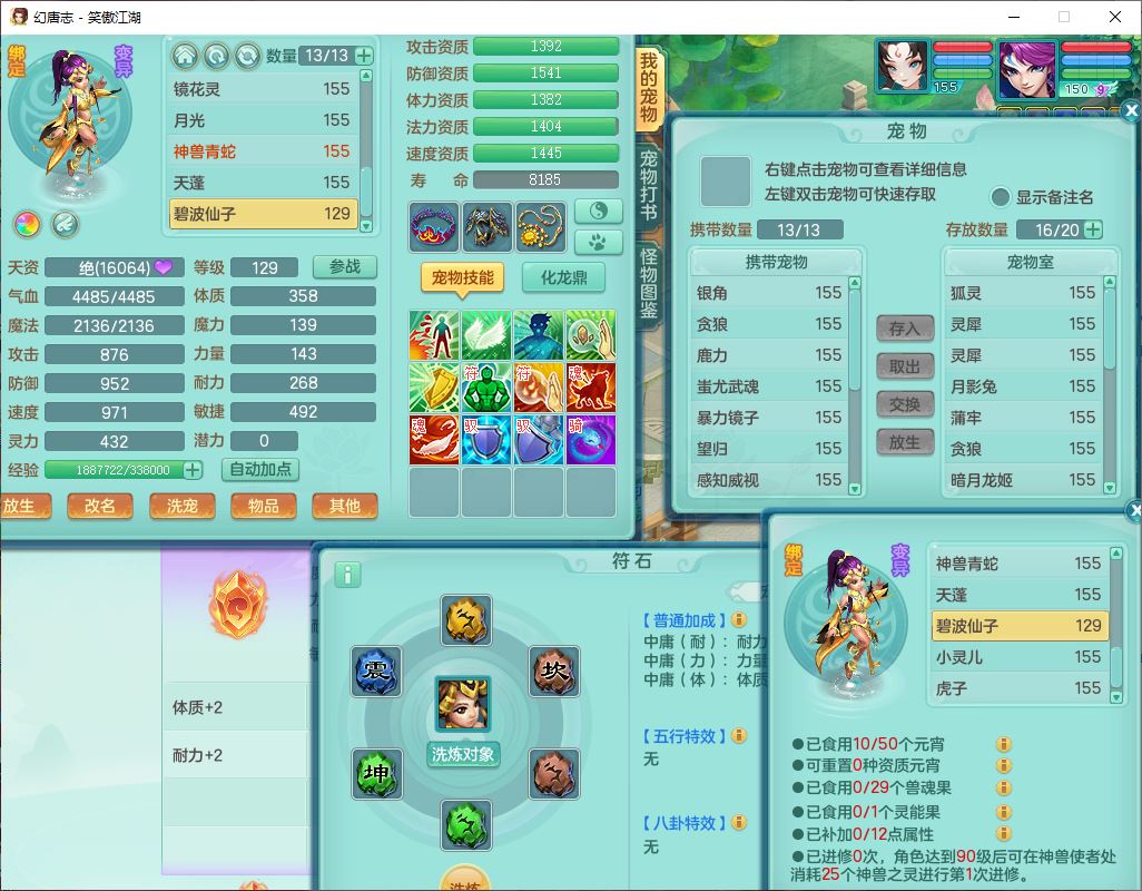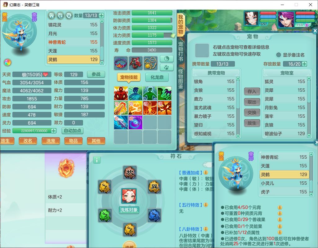 4384笑傲江湖159男万兽精灵歌,1青蛇(无内)1望归2镜花,宝宝种类齐全,装备齐全,狂暴武器,34个内丹碎片,1飞行坐骑,带成品159奶粉精灵舞,装备宝宝齐全