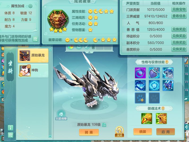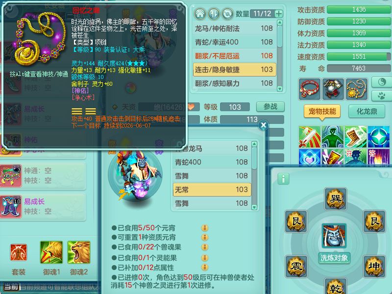 91447,2026区103男万兽,黑白泰坦暴龙+黑白神驹心想事成+神驹马上发财+神驹马到成功+火焰之力武器,2内(蛇+马),仓库64碎片准3内,装备散拼崩山神佑,精灵10级,符石9附加,化龙鼎8阶,共鸣3级,12+高书宝宝,龙宫孩子,2雪舞1建木1赤炎1炉子,200万神武币,4300金币,永久背饰流光翎,套装齐全,仓库库存很多,4满果子,仓库还有44颗果子,35神兽蛋,1.5W左右还童丹,目前在卡回溯 威望在榜,底子不错,战盟可换