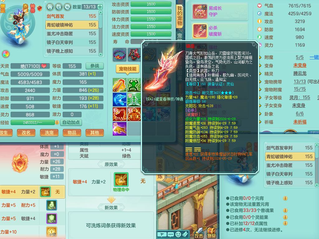 tx10477天下无双159男万兽精灵歌,满级共鸣,1内丹青蛇(破境)1皮,2镜花1龙姬,全身单加8红,912必杀双红武器,Y守护头,崩山项链,10只满果子5觉醒,鼎5.5,永久头饰精灵皮肤,22仙兽灵,36内丹碎片,3坐骑(2只双人)