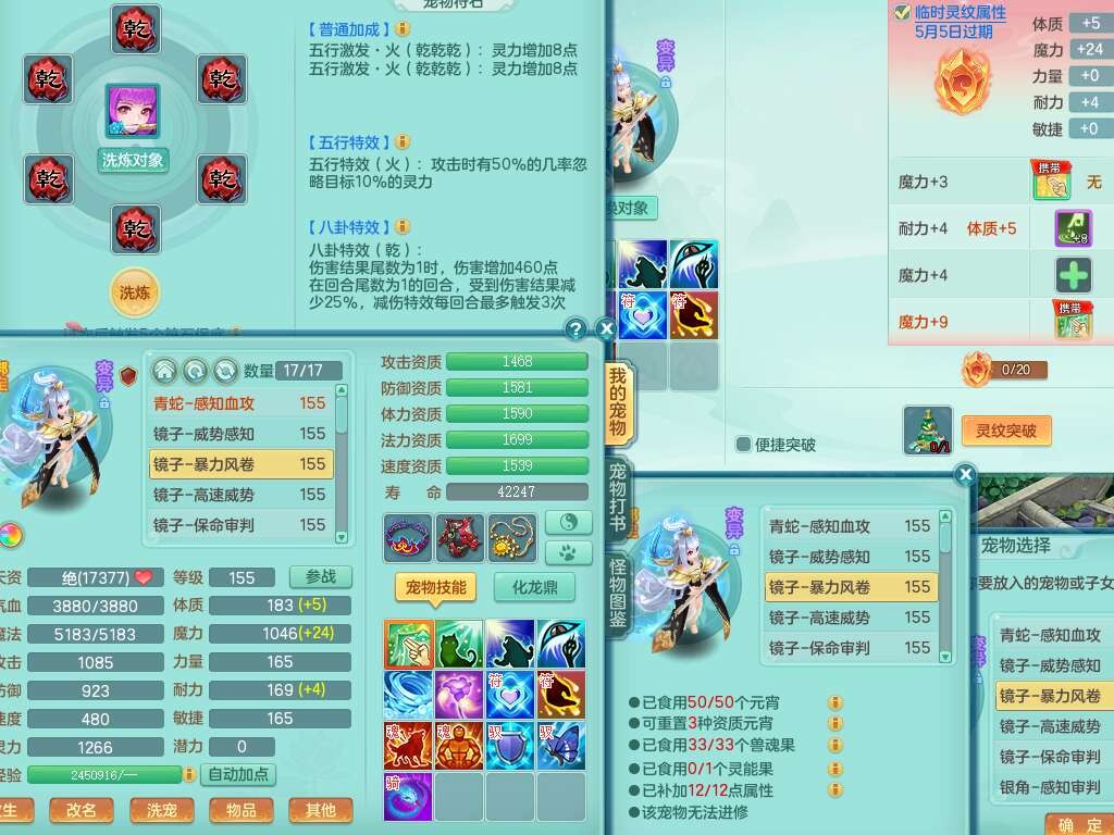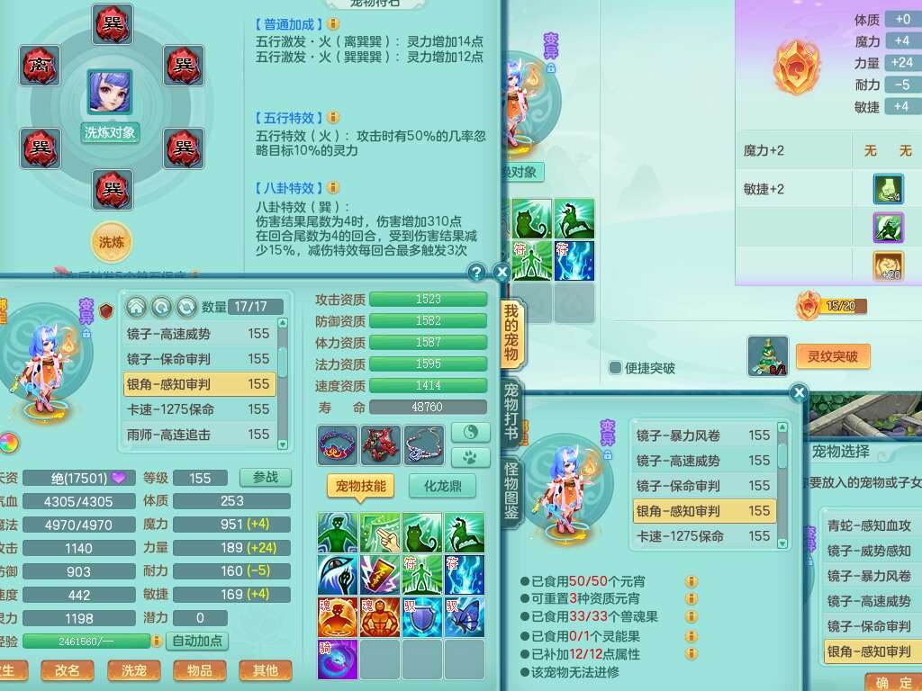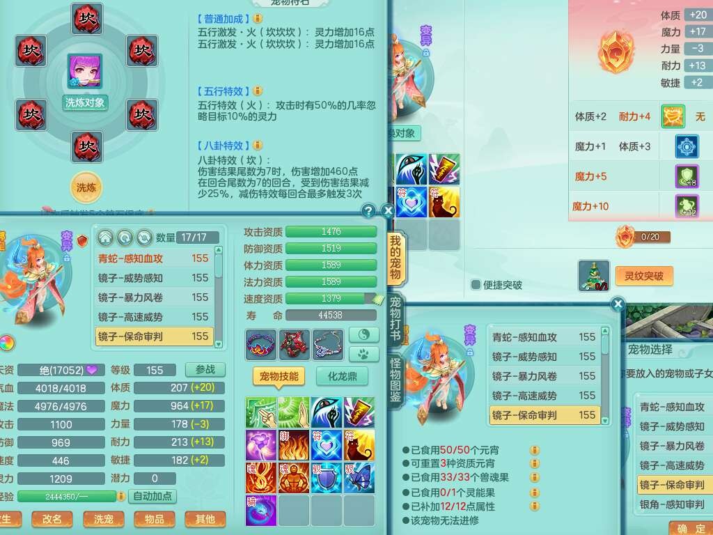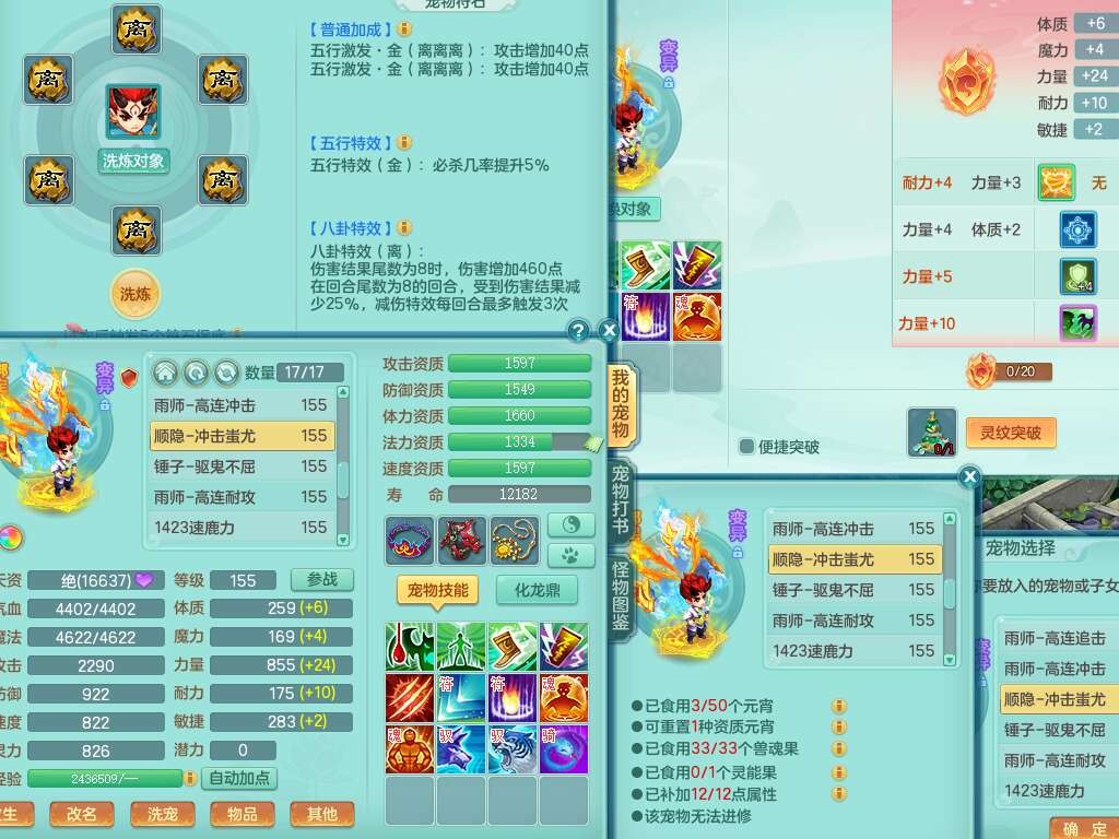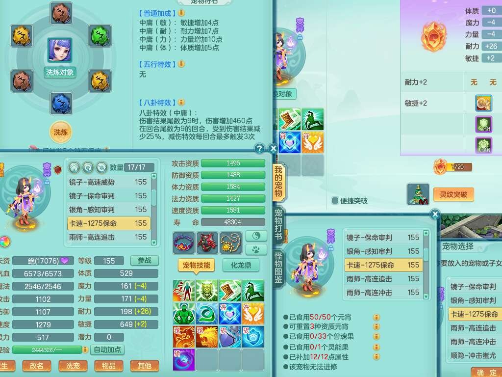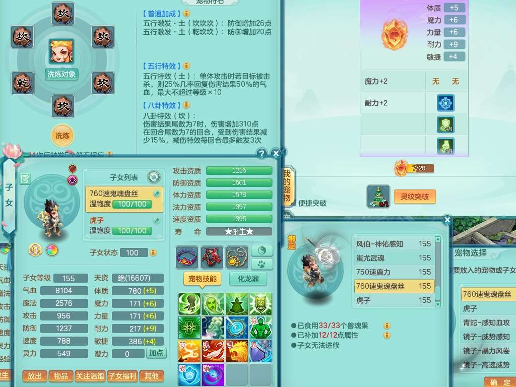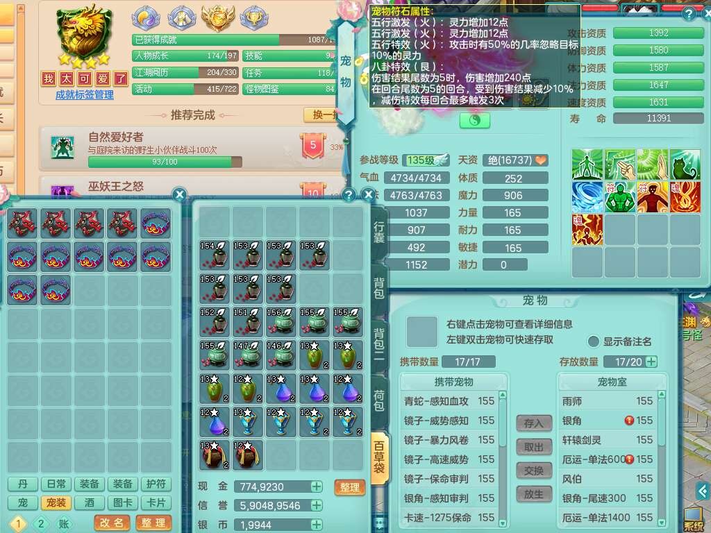 K22424醉生梦死159男万兽,精灵歌+舞,1龙没内,1内丹蛇,【7觉醒,已潜龙】,1特殊(风卷),4只六技能镜花灵,1只六技能龙姬,易成长破魔斩单加57头,911狂暴易成长单加武器,崩山单加55衣服,神佑群体守备单加52链子,易成长慈航单加56腰带,破甲鞋子,5.5基础鼎+70攻+280血,15个永久格子,7个纯六字,5个五字,14只满果子,仓库还有55个果子,52个神兽内丹碎片,宠排在榜,经验在榜,双人坐骑,神驹马上发财+火焰之力武器,带162天月卡。➕159男无量,1神兽,3觉醒,1特殊(剑气),3只六技能镜花灵,易成长野兽衣服,愤怒移魂大法腰带,六特。➕159女盘丝,2只六技能镜花灵,易成长明镜非台单加52头,易成长野兽单加55武器,愤怒迟滞腰带,六特。➕159男魔王,易成长五雷衣服,法缭鞋子。