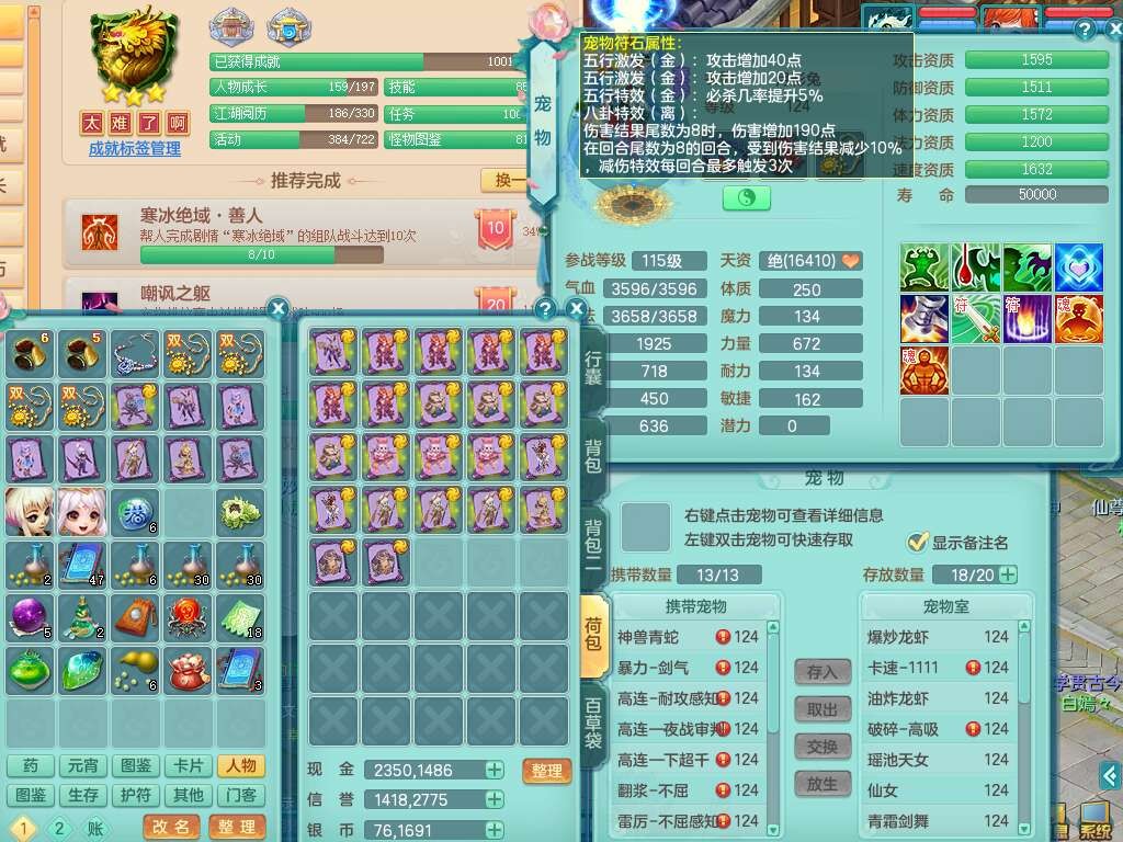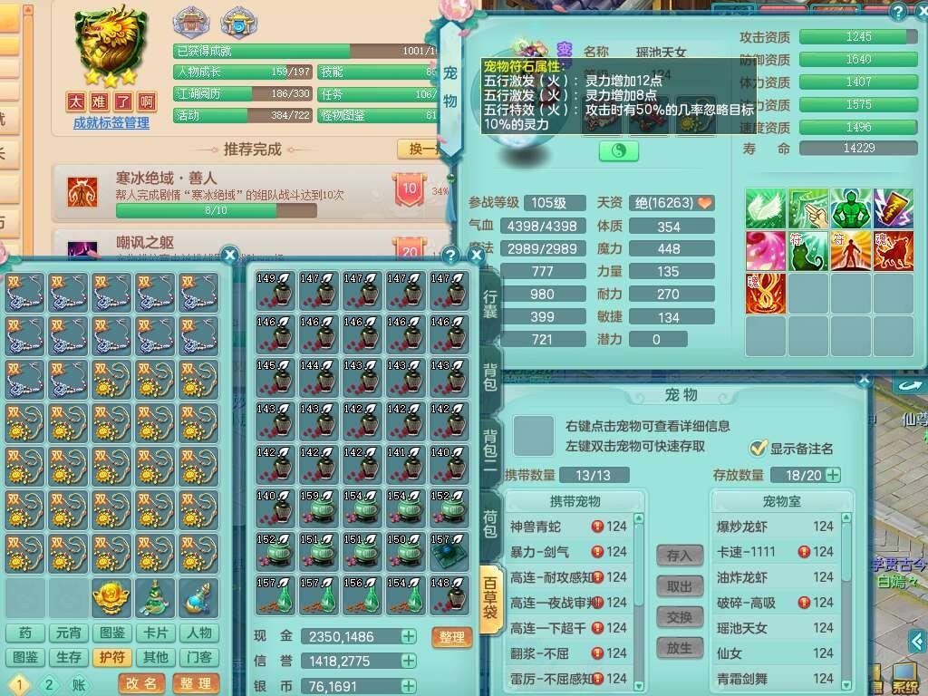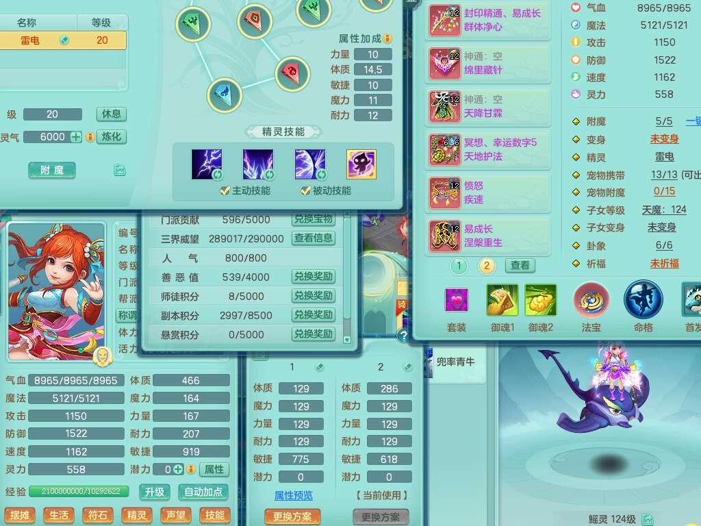 p22423阳春白雪119女方寸,精灵舞,1内丹蛇,11觉醒,(准潜龙,宝宝满足6只,化龙鼎差2个厚土龙纹),1宠皮,三红封印精通易成长玉清头,三红冥想幸运5罗汉单加链子,愤怒疾速腰带,易成长慈航单加42鞋子,4.0基础鼎,7个纯六字,11只满果子,仓库还有52个果子,宠排在榜,有22个仙兽蛋,52个神兽内丹碎片,157天月卡。➕119女龙宫,1内丹蛇,6觉醒,幸运6慈航单加头,五雷单加武器,易成长单加40衣服,190易成长单加链子,易成长四海单加41腰带,幸运9魔音摄心单加41鞋子,2个纯六字,1个五字,3只满果子,带1315金币,2216w神武币。