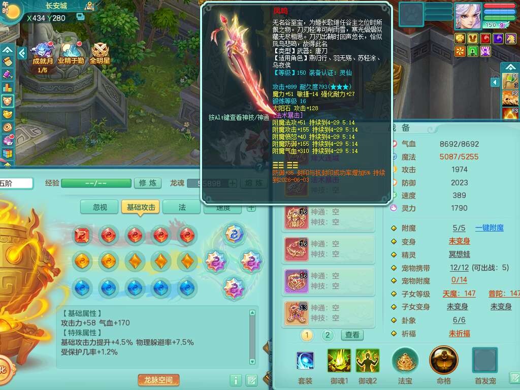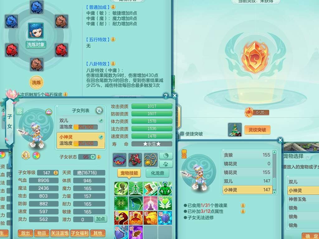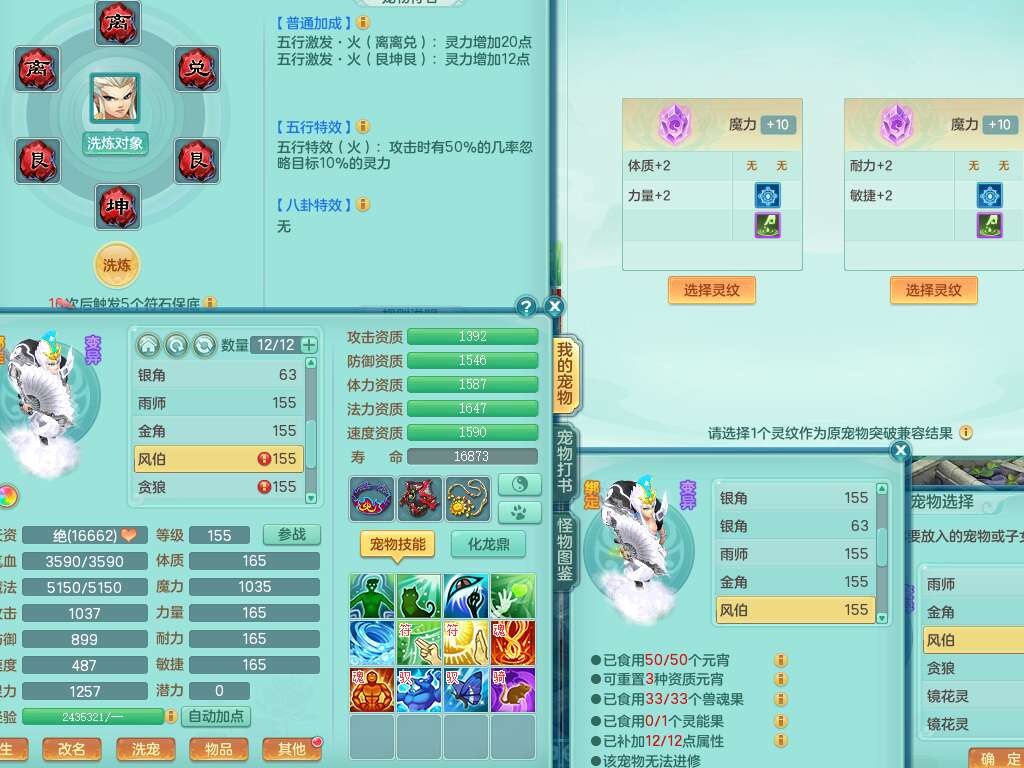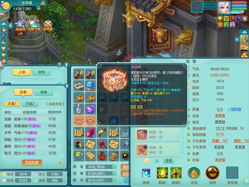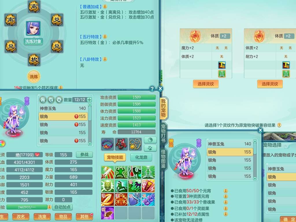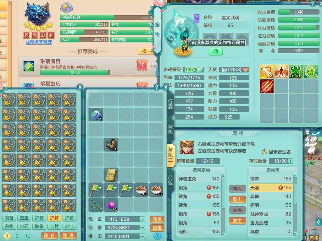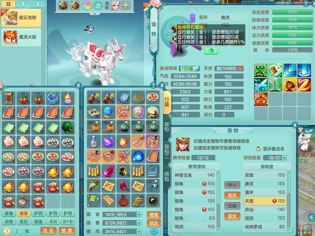 K22419超凡入圣159男魔王,1神兽,1只六技能镜花灵,法爆单加51武器,243易成长单加50链子,4.5基础鼎,4只满果子,仓库还有31个果子,双人坐骑,带3994金币,2416w神武币。