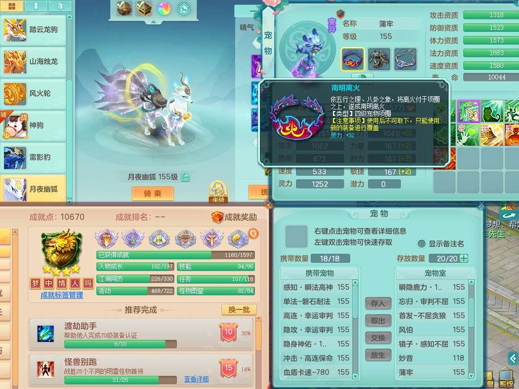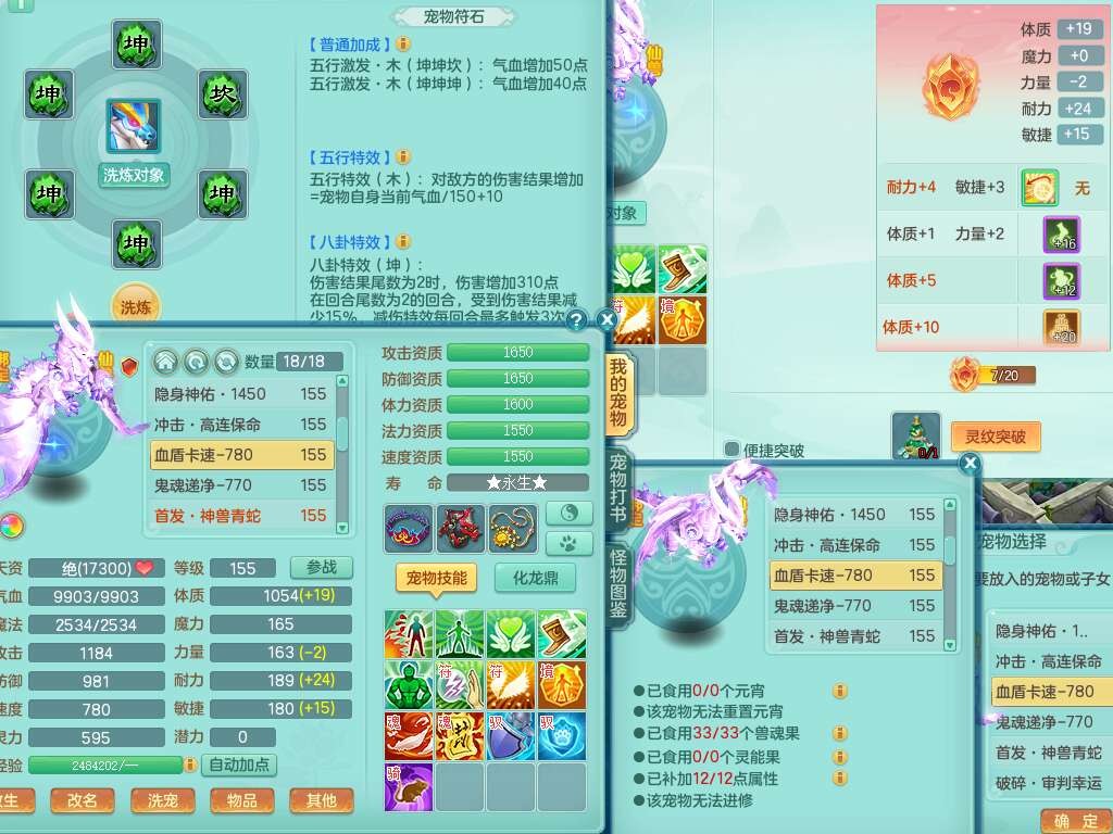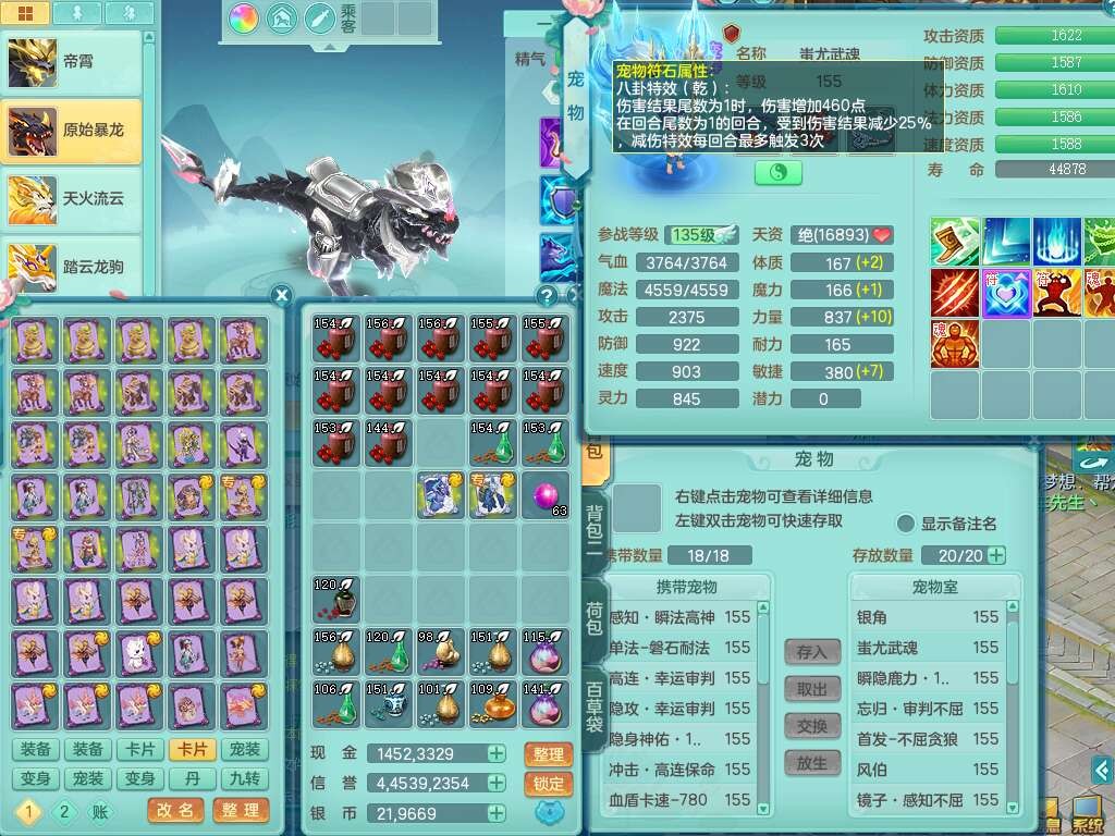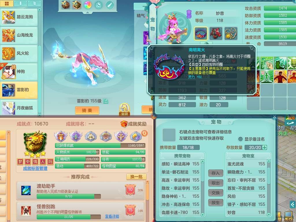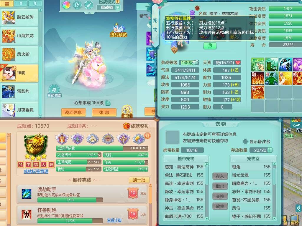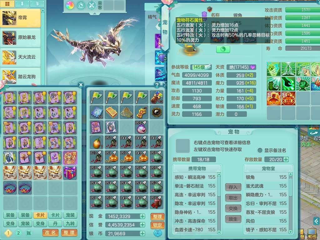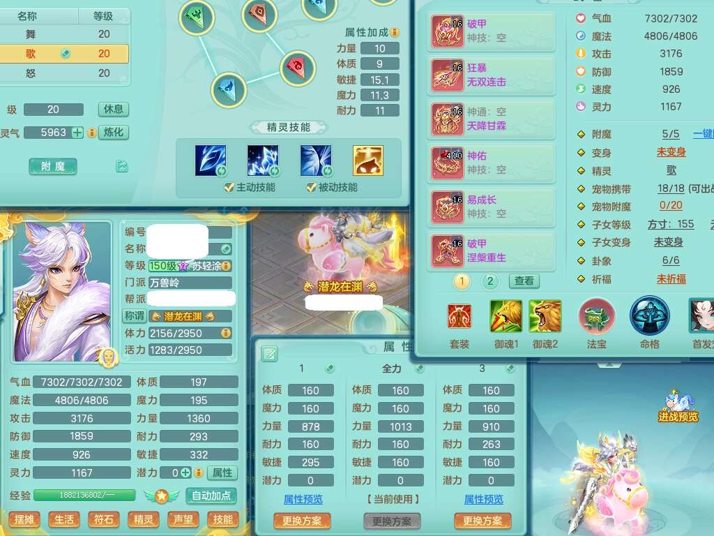 J22440风驰电掣159男万兽,精灵歌+舞,8龙4内胆神(2蛇1马),2破镜,【20只觉醒,已潜龙】,4位靓号ABAB不含4,4宠皮,1特殊(雷光),1只六技能龙姬,5只六技能镜花灵,6.0基础鼎+70攻、280血,双破甲,破甲单加头,破甲慈航鞋子,919狂暴破血武器,有双易成长崩山单加51鞋子,可玩法系,法暴单加53武器,法缭野兽衣服,五雷鞋,275易成长单加项链,266易成长单加54项链,回春封锁武器都有,15个永久格子,13个纯六字,6个五字,30只+满果子,宠排在榜,修炼在榜,永久称谓,7个坐骑,暴龙逍客+神驹心想事成+火焰之力武器皮肤,带159天月卡。