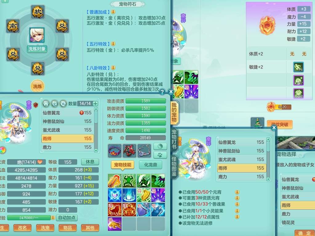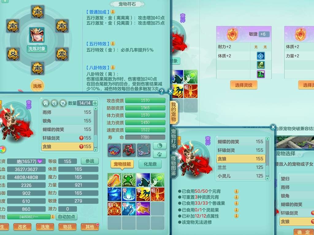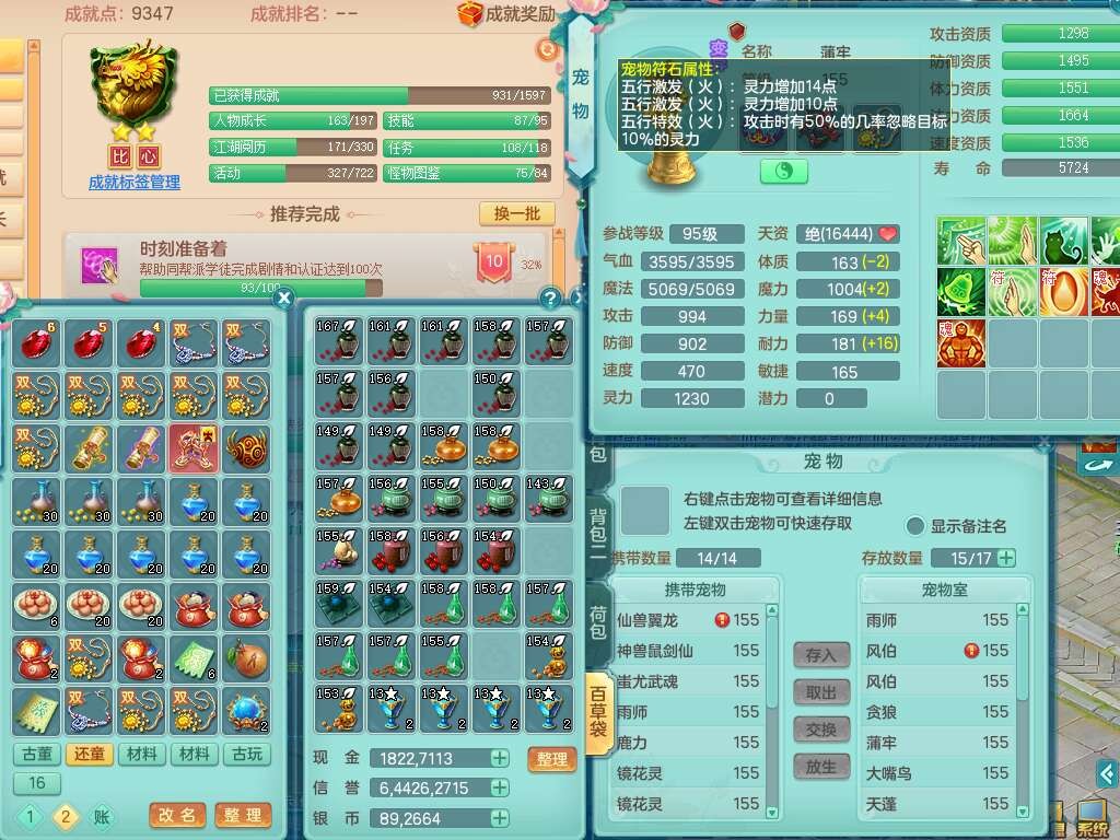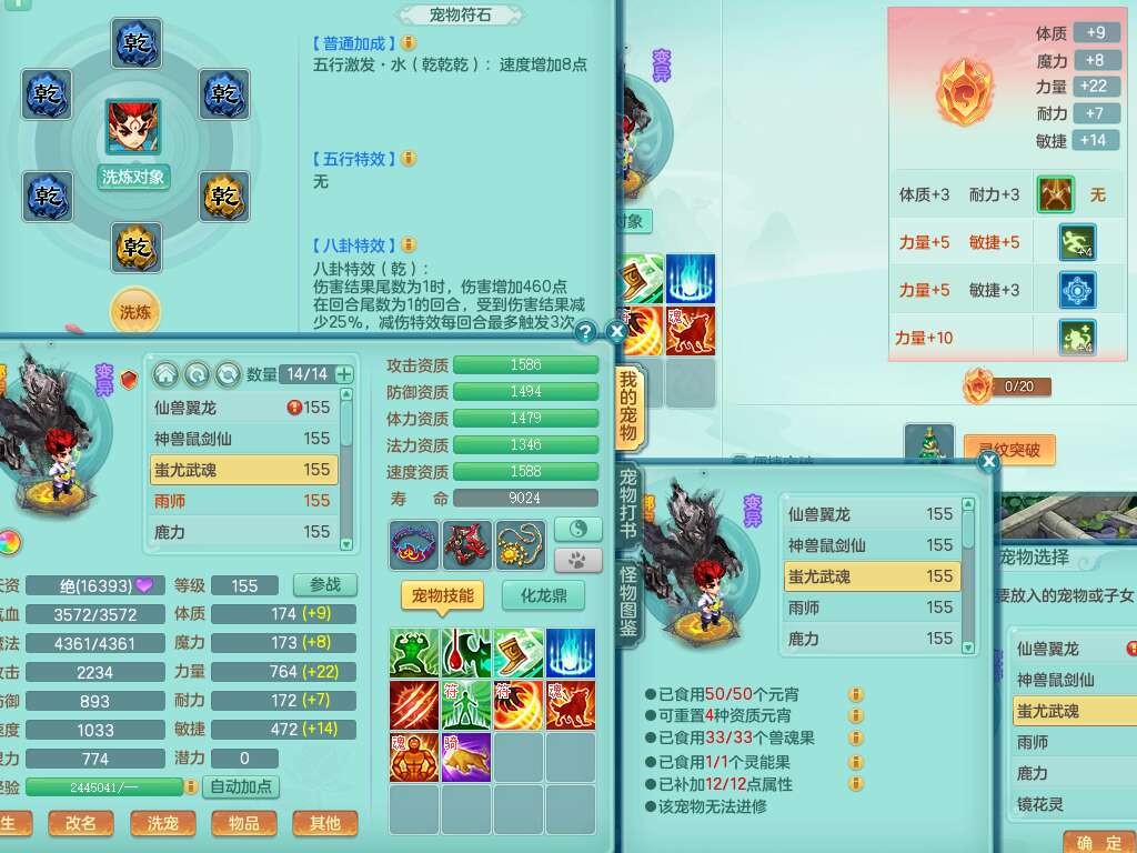 K22435任剑逍遥159男万兽,精灵歌,1龙没内,1内胆神,1只觉醒,2只六技能镜花灵,1只六技能龙姬,923狂暴单加55武器,崩山单加51衣服,愤怒单加56腰带,4.5基础鼎,综合6只满果子,仓库31神兽内胆碎片,山海烛龙坐骑。